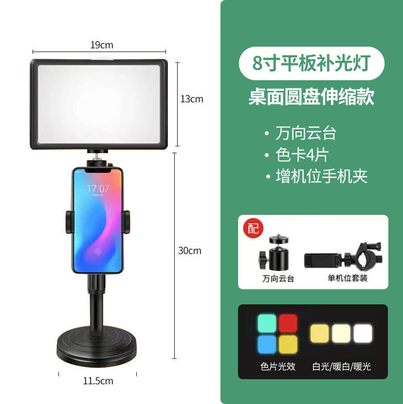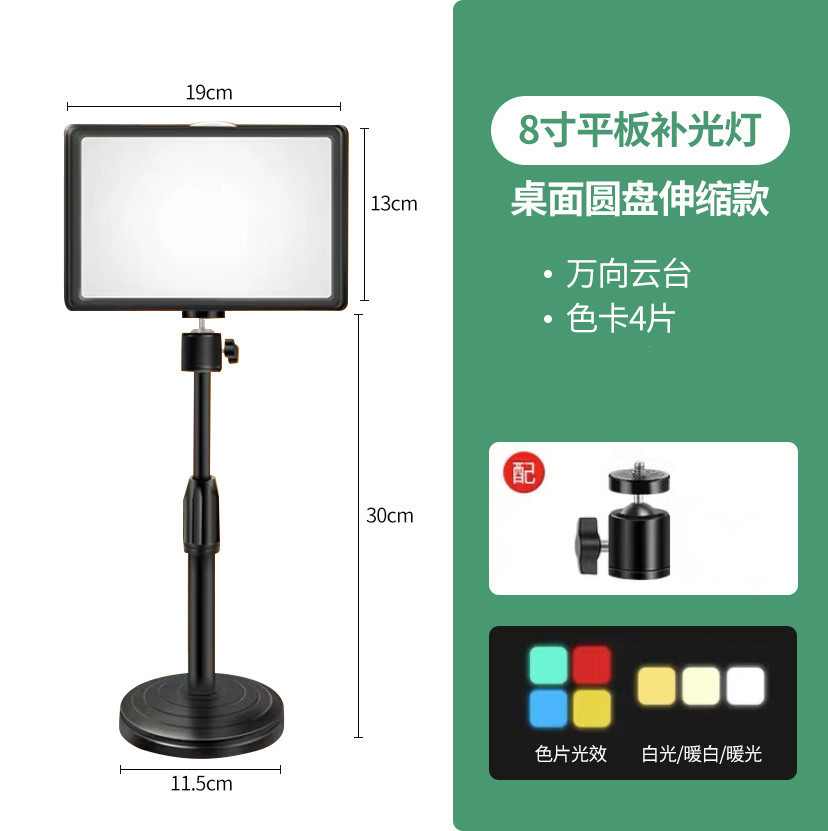 • 8inch 플랫 패널 램프 + 금속 헤드 + O자형 추가 카메라 위치 클램프 + 데스크탑 디스크 리프팅 브래킷