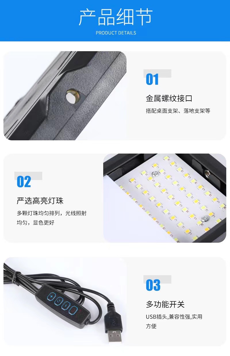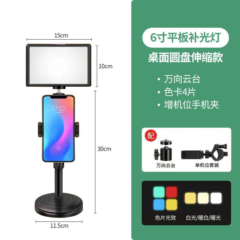 • 6inch 플랫 패널 램프 + 금속 팬/틸트 + O자형 확장 카메라 클램프 + 데스크탑 디스크 리프팅 브래킷