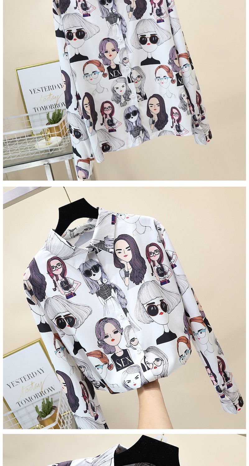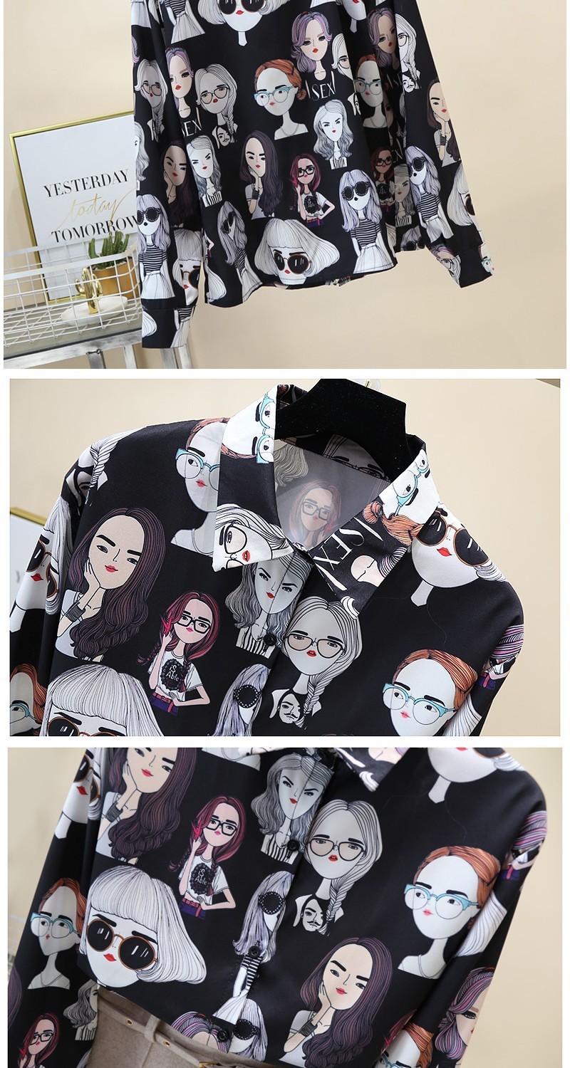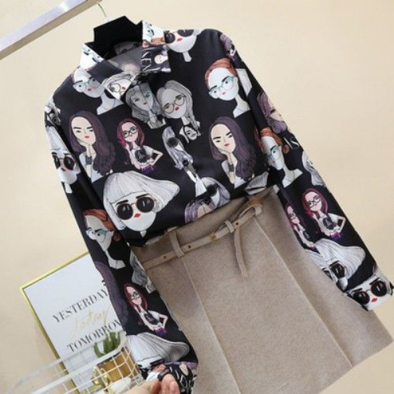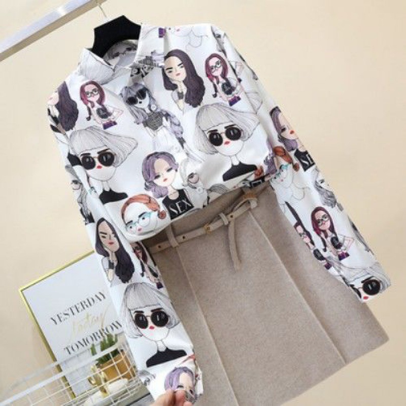 2023 봄과 가을 새로운 한국 스타일 우아한 패션 장난스러운 소녀의 머리 프린트 긴 소매 셔츠 여성 캐주얼 셔츠 트렌디스토어 가기