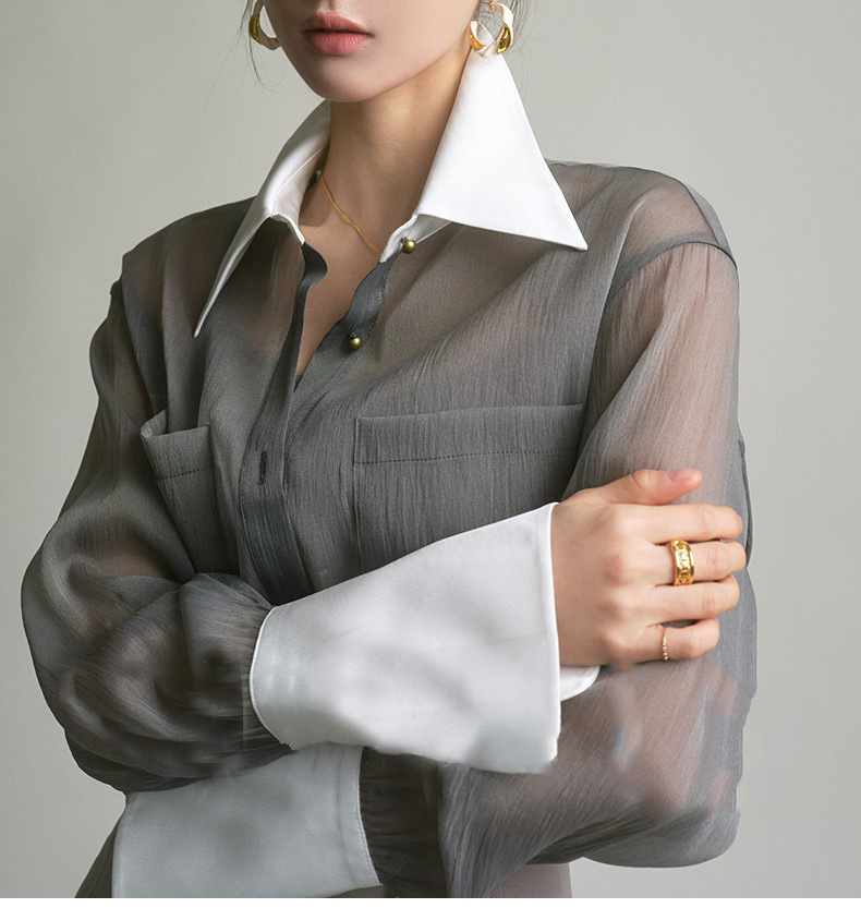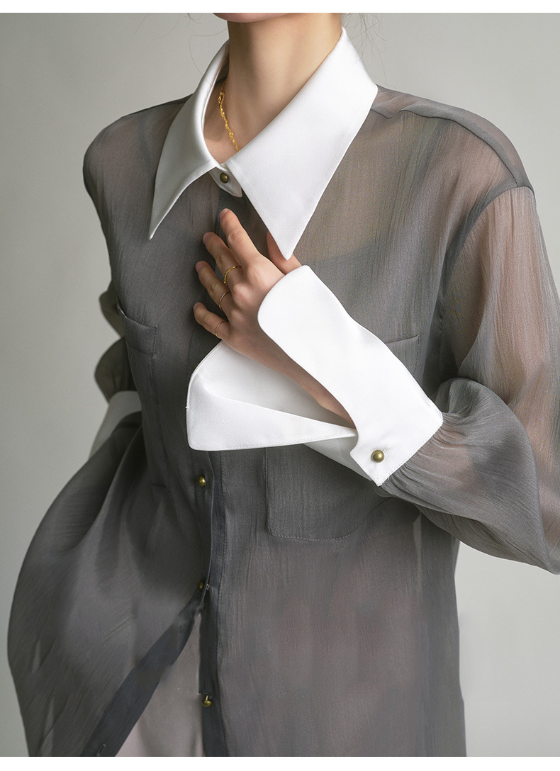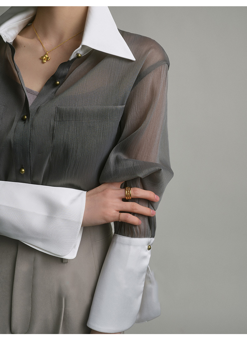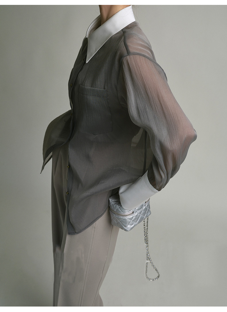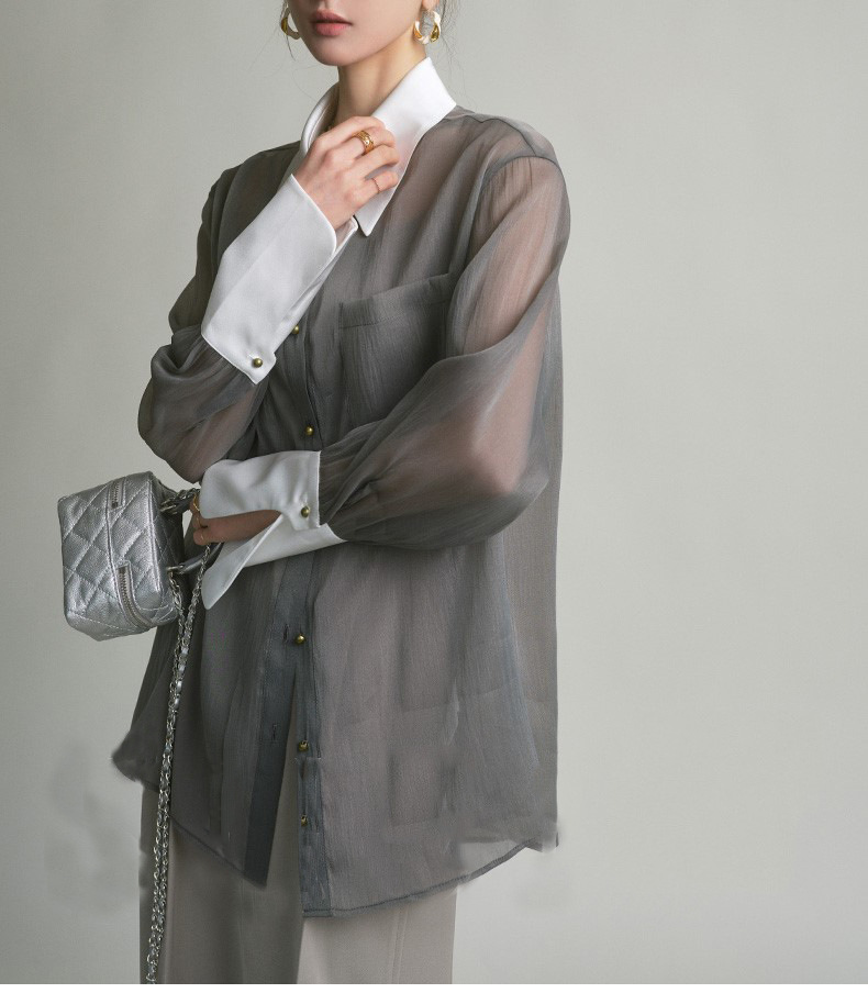봄 여름 신상품 자외선 차단 상의, 우아하고 향기로운 프렌치 스타일의 패셔너블한 셔츠, 그레이 레트로 루즈핏 셔츠 여성용