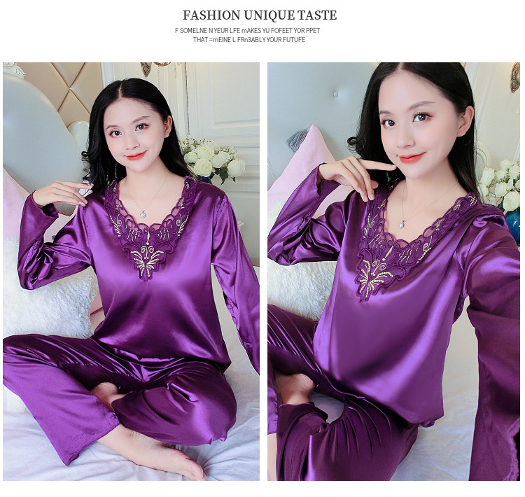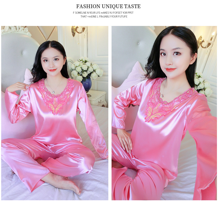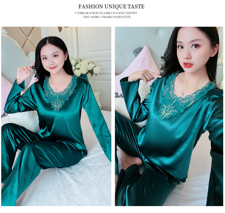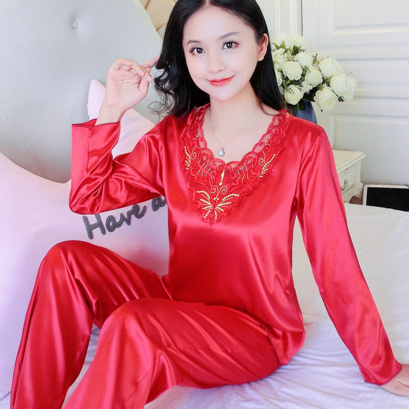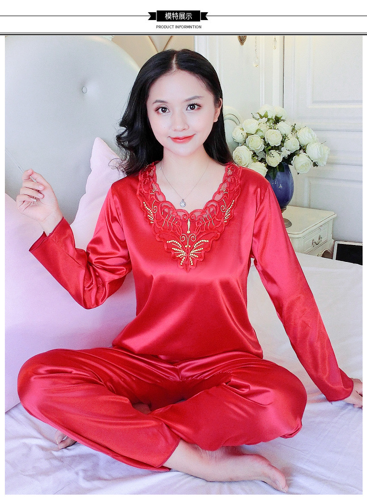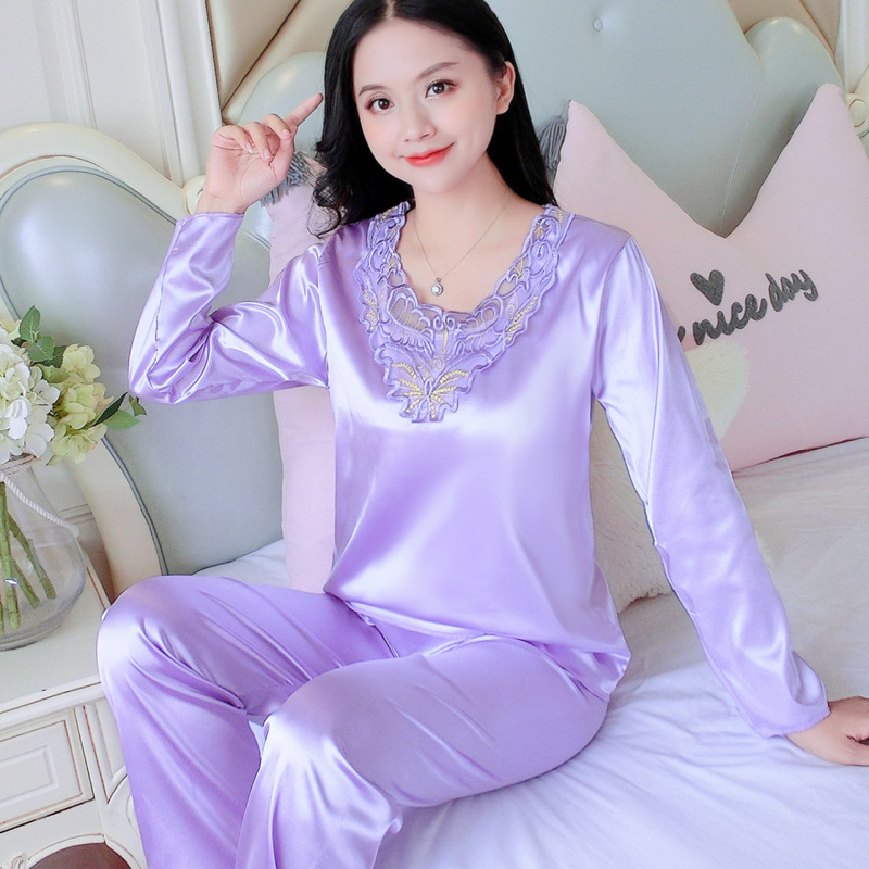 느슨한 플러스 사이즈 실크 잠옷 여성 봄과 가을 여름 긴팔 바지 얇은 투피스 세트 섹시한 아이스 실크 홈 옷