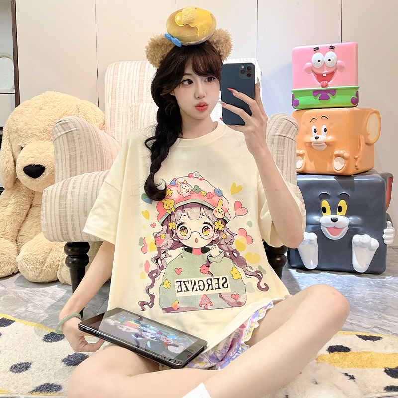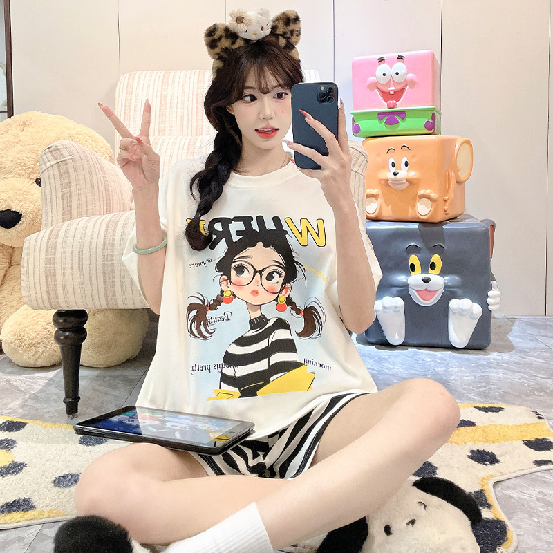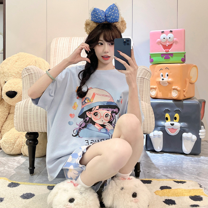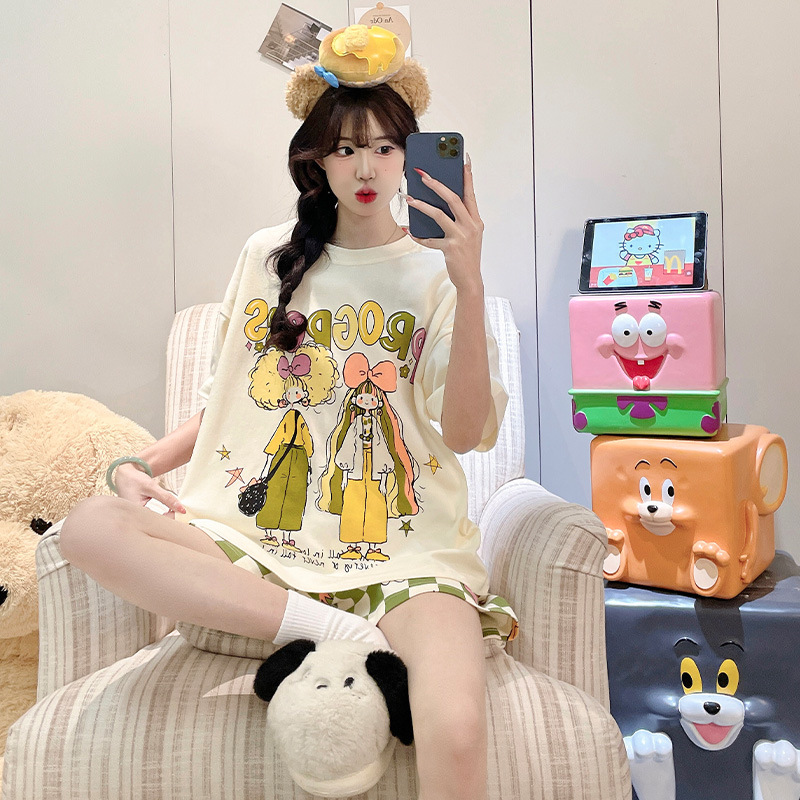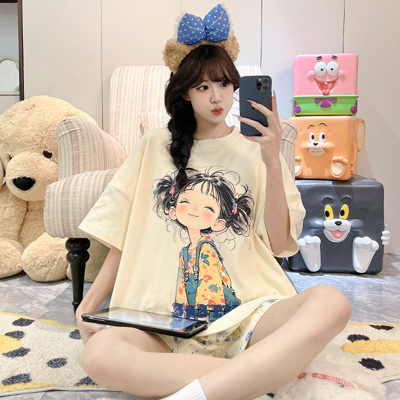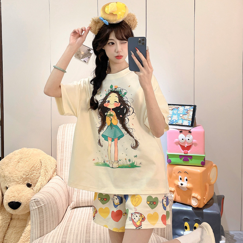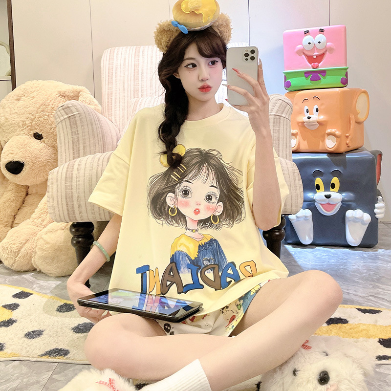 여성용 신상 반팔 반바지, 라운드넥 잠옷, 학생용 만화 슈트, 여름철 야외에서 착용 가능한 여성용 홈웨어스토어 가기