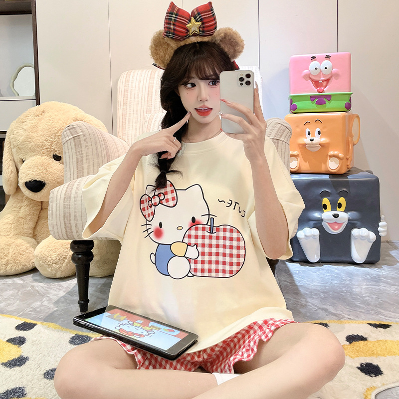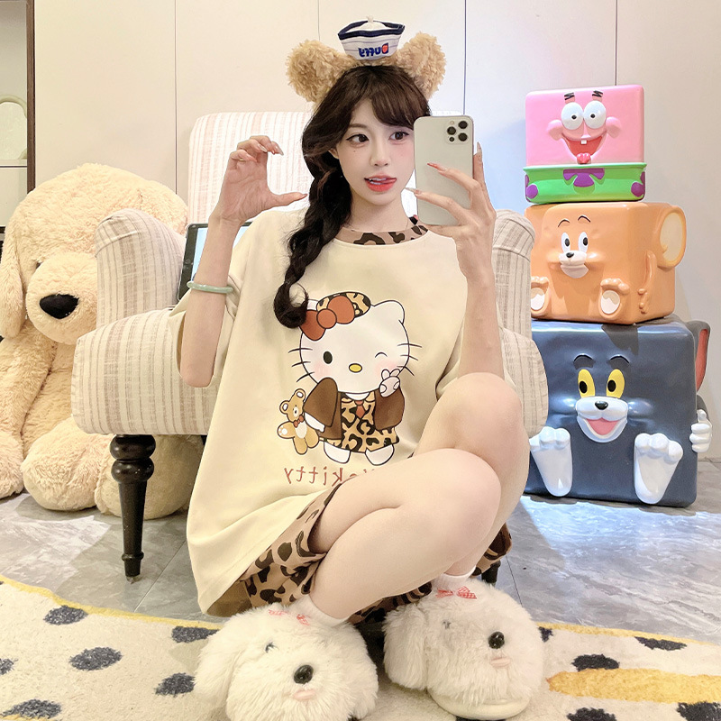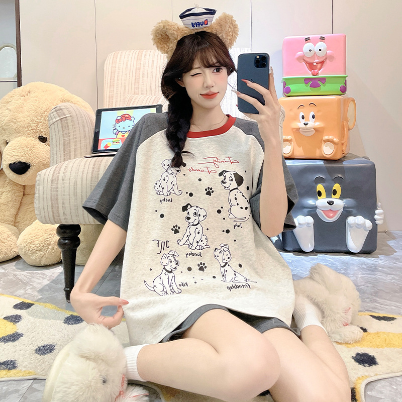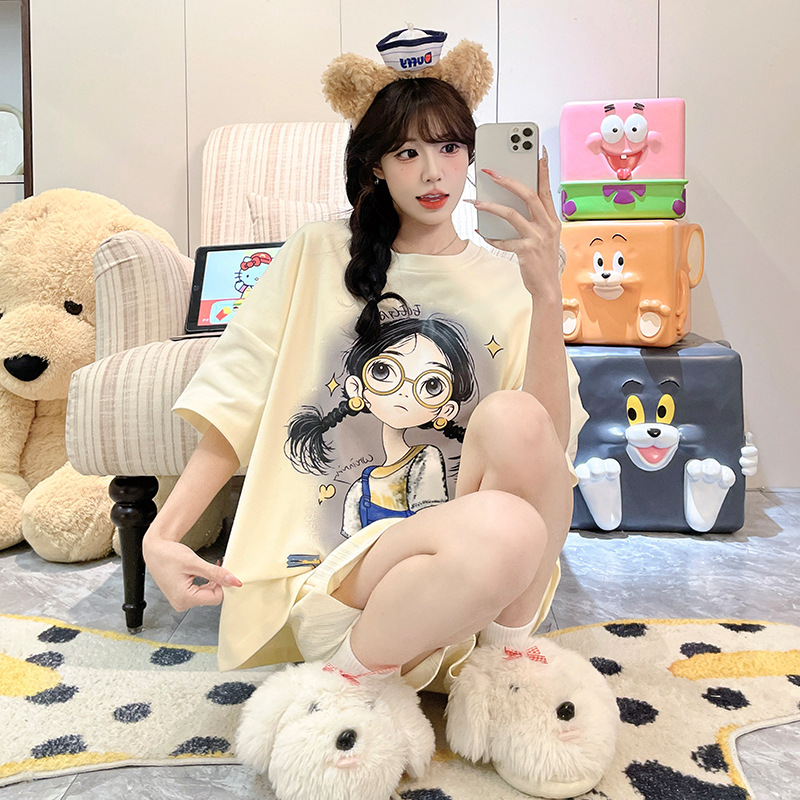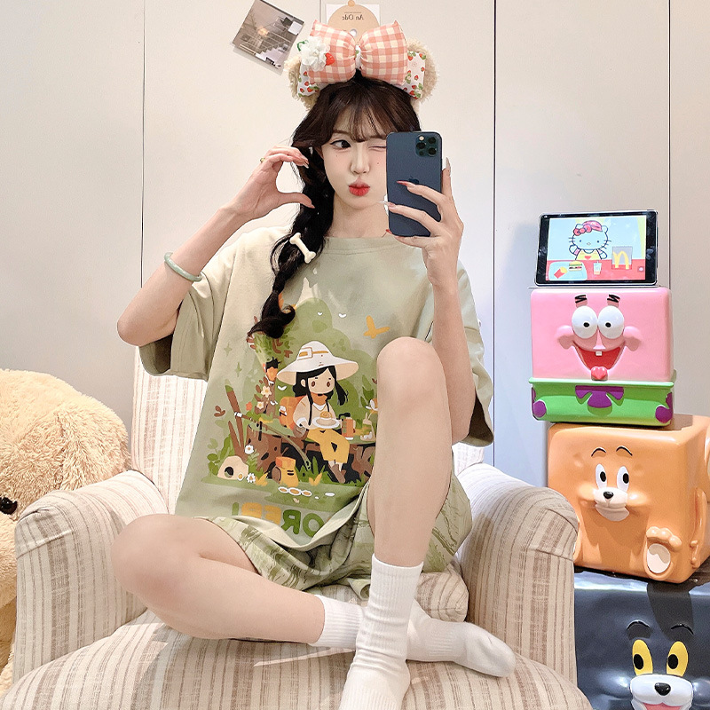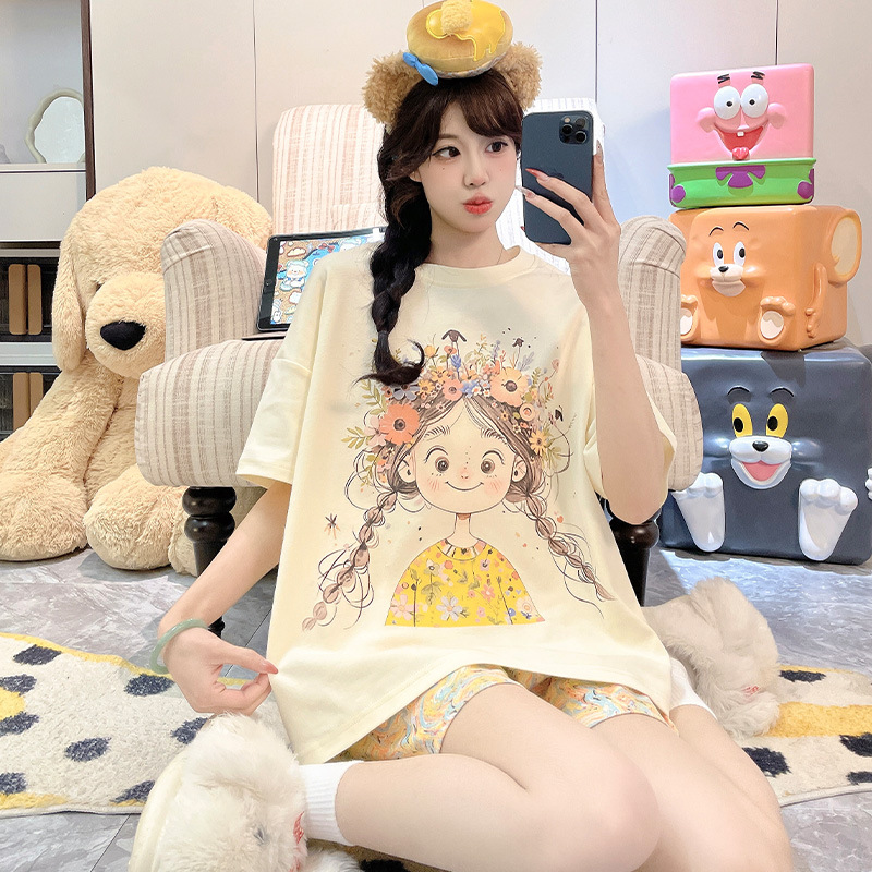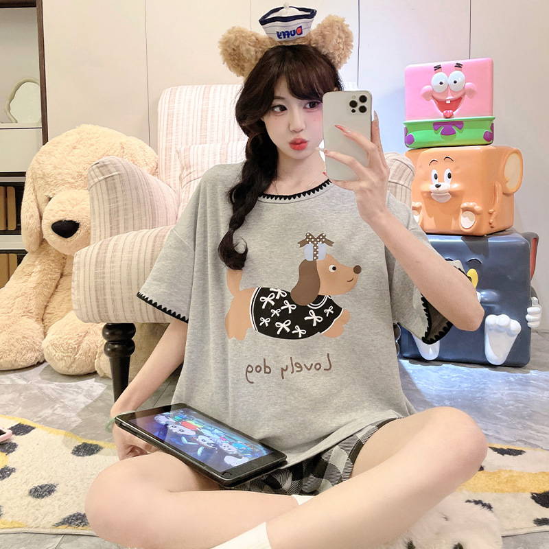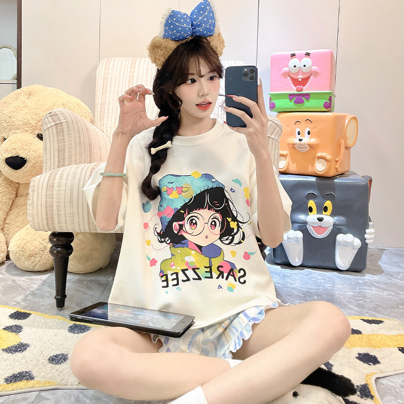 여성용 신상 반팔 반바지, 라운드넥 잠옷, 학생용 만화 슈트, 여름철 야외에서 착용 가능한 여성용 홈웨어스토어 가기