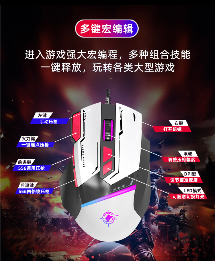 Rui Aili 전기 경쟁 매크로 프로그래밍 기계 게임 마우스 유선 DPI8 키 USB 케이블 RGB 발광 게임 마우스