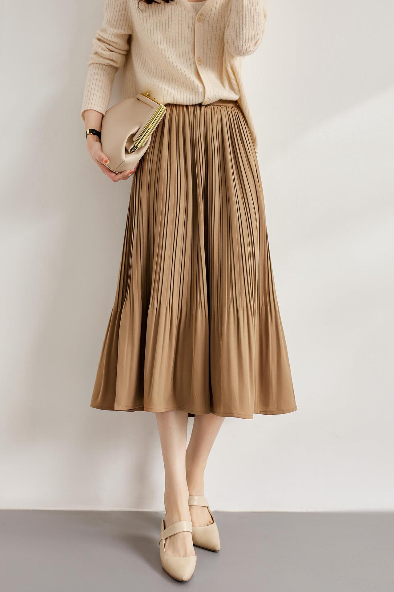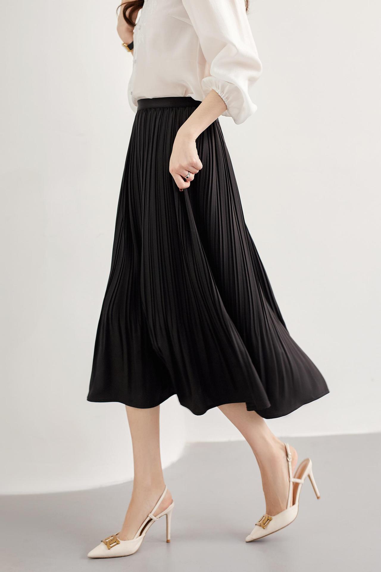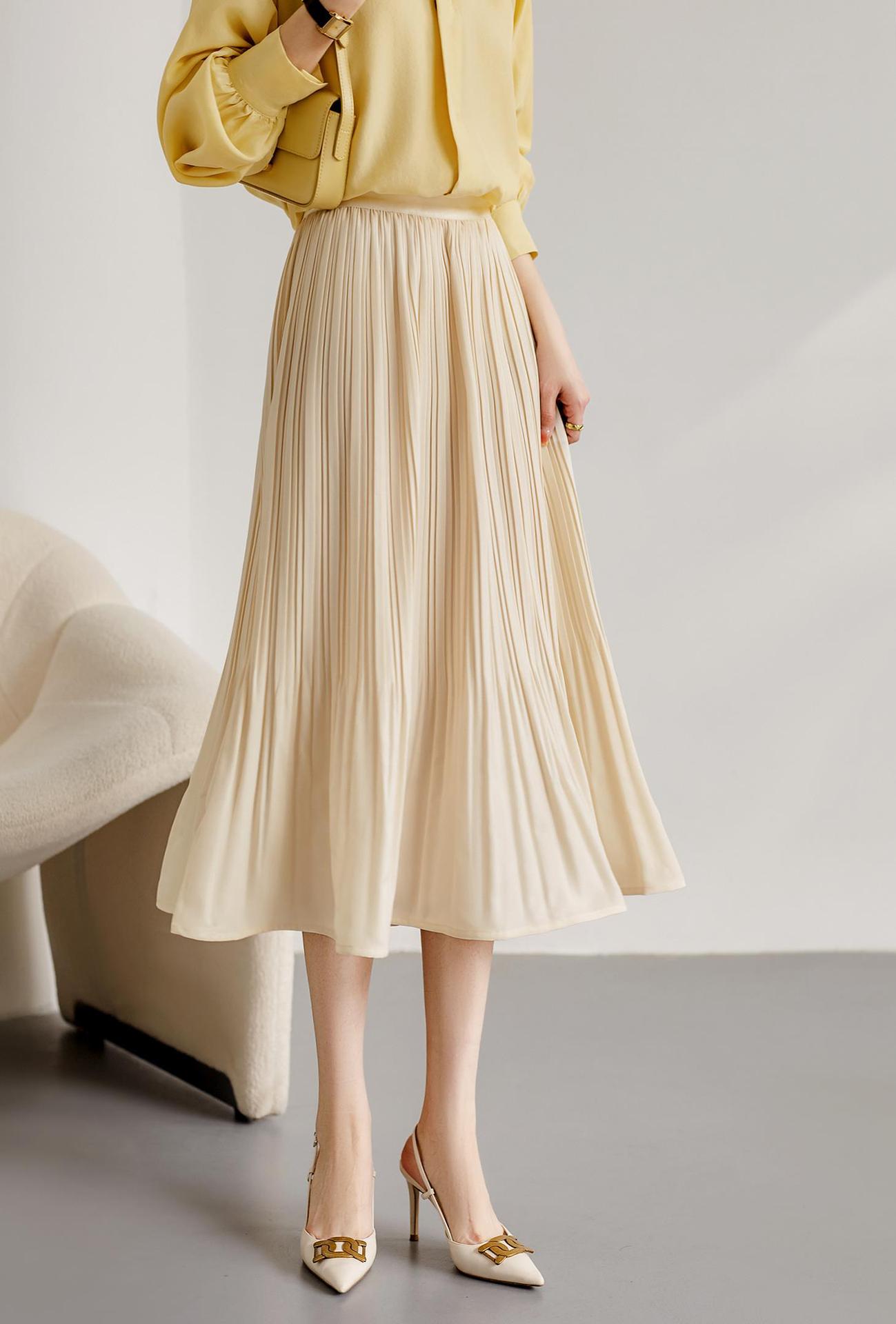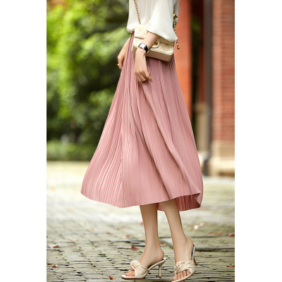 Baozhu 파빌리온 4 색 옵션 탄성 허리 슬리밍 하이 웨이스트 플리츠 스커트 A 라인 스커트 여성 봄 19536