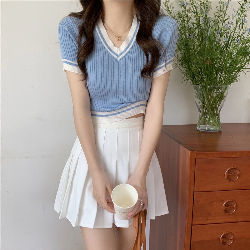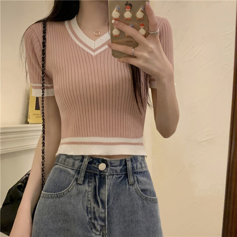 2025 새로운 여름 여성 짧은 스타일 슬림 피트 대비 색상 v 넥 반팔 스웨터 티셔츠 한국어 버전스토어 가기