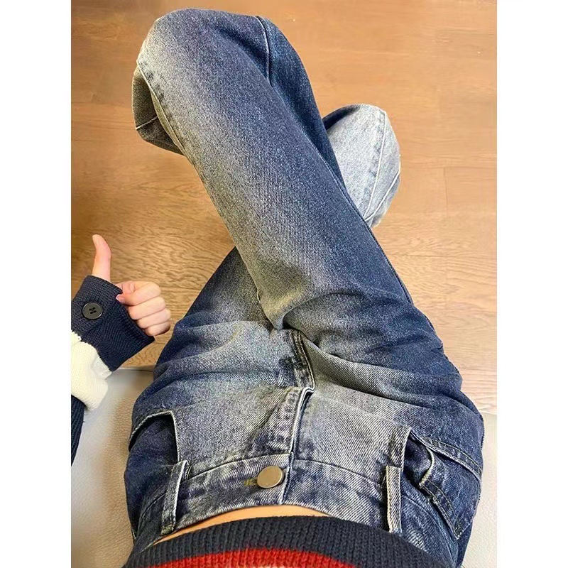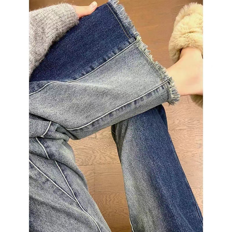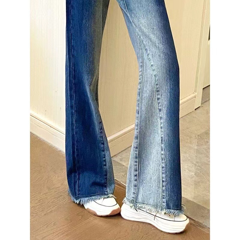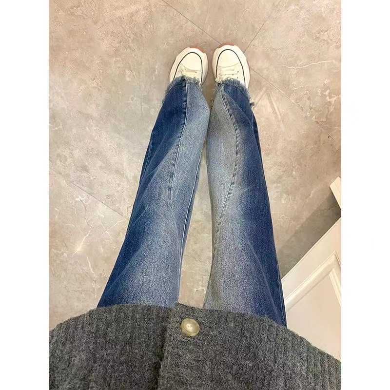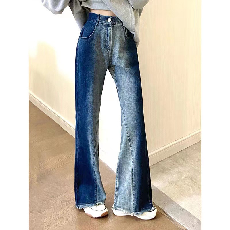 봄과 가을 빈티지 그라디언트 마이크로 프릴 청바지 여성용 스파이스 걸스 인터넷 인기있는 새로운 하이 웨이스트 느슨한 와이드 레그 플로어 바지스토어 가기