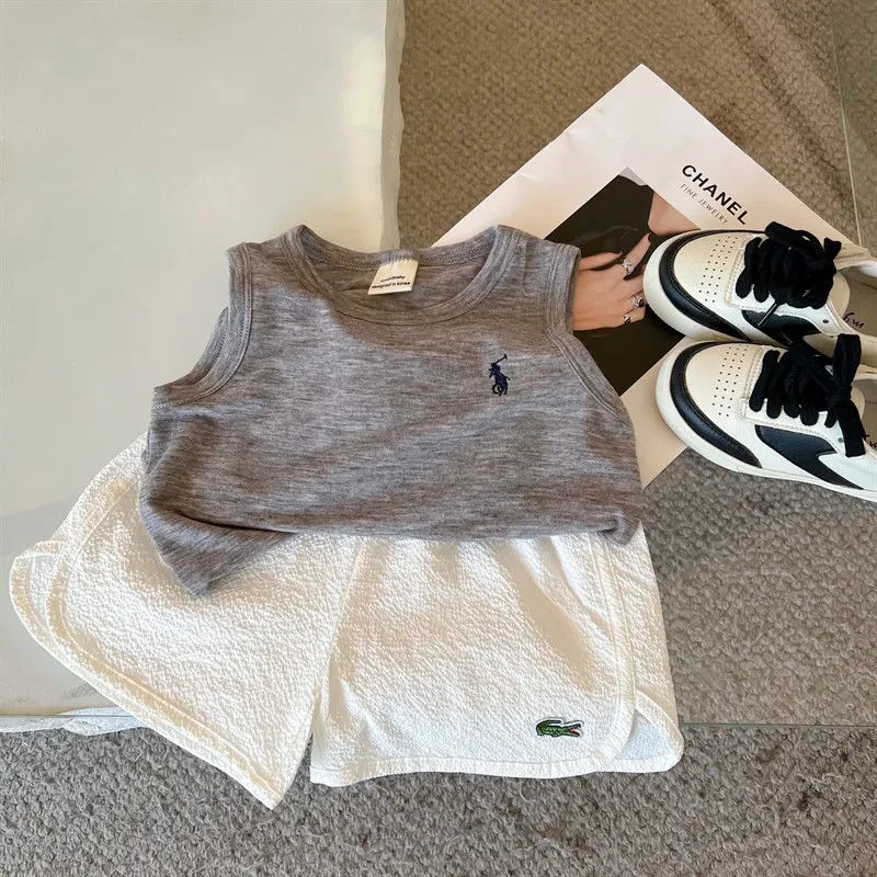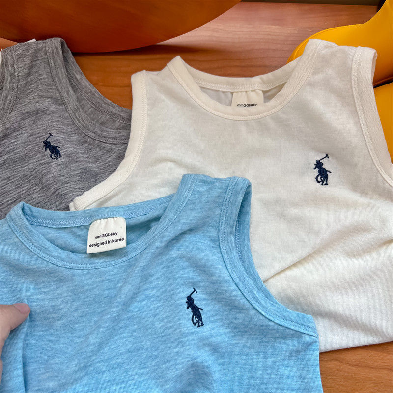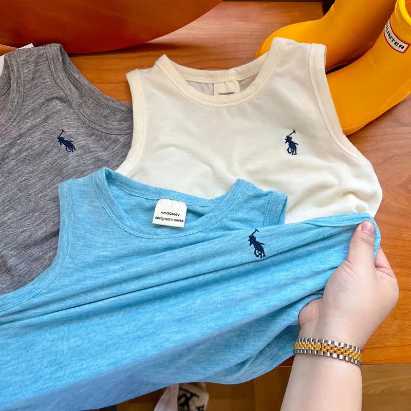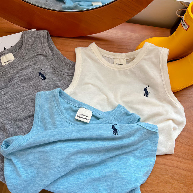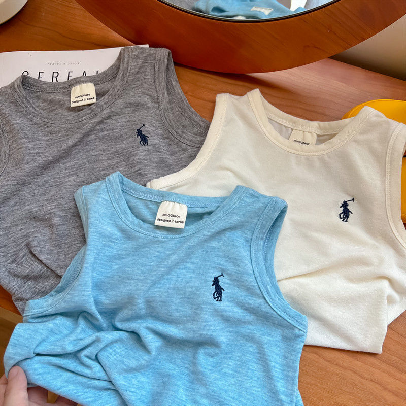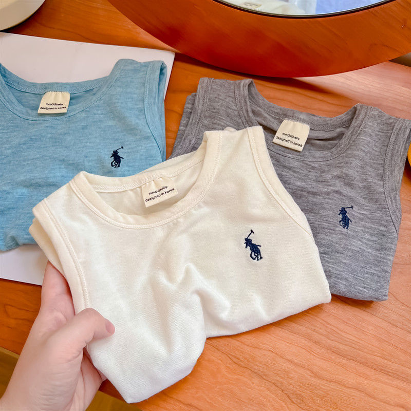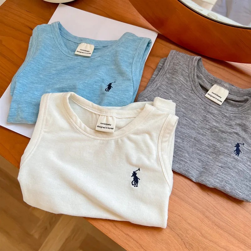 어린이 조끼 여름 소년 소녀 자수 순면 편안한 마스크 민소매 티셔츠 아기 트렌디 브랜드 단색 탑 얇은