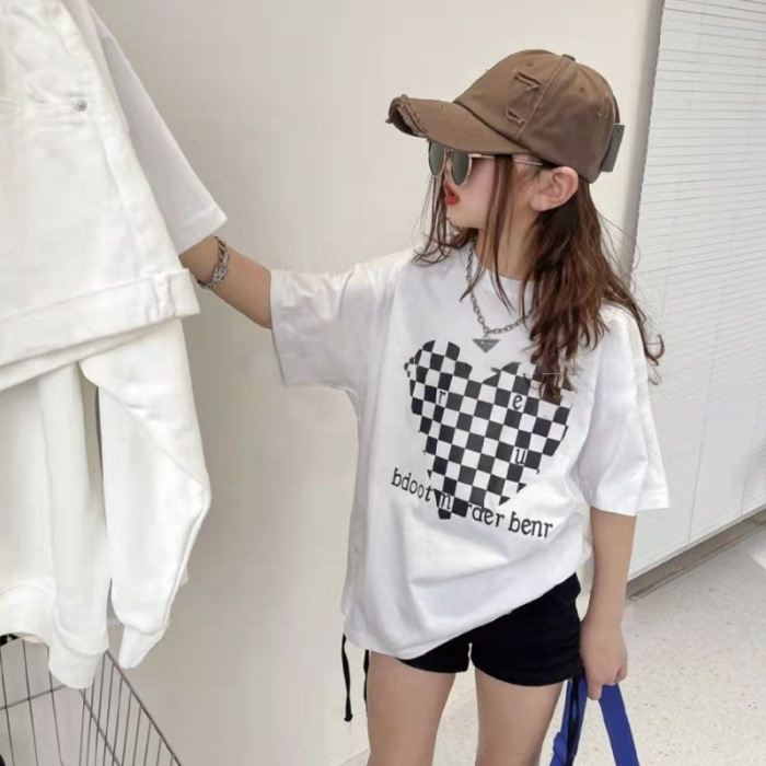 여아 여름 프린트 반팔 티셔츠 2023 새로운 스타일 세련된 트렌디 티셔츠 어린이 여름 루즈한 반팔 티셔츠