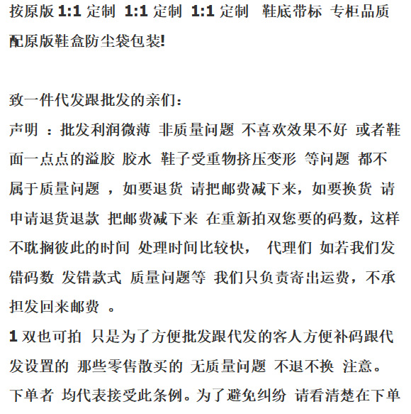 6、关于售后:批发利润微薄 非质量问题 不喜欢效果不好 或者鞋面一点点的溢胶 胶水 鞋子受重物挤压变形 等问题 都不属于质量问题 , 如若我们发错码数 发错款式 质量问题等 我们只负责寄出运费,不承担发回来邮费 。请谅解。