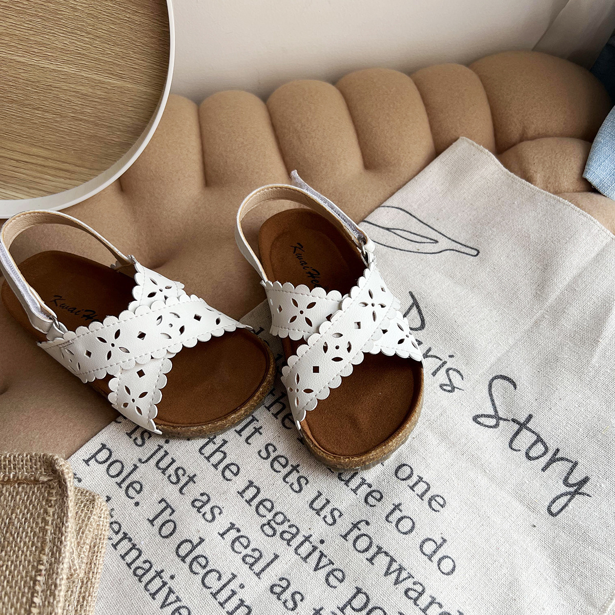 빈티지 어린이 샌들 여성용 가죽 겉옷 비치 샌들 중공 레이스 오픈 발가락 어린이 부드러운 밑창 나무 신발