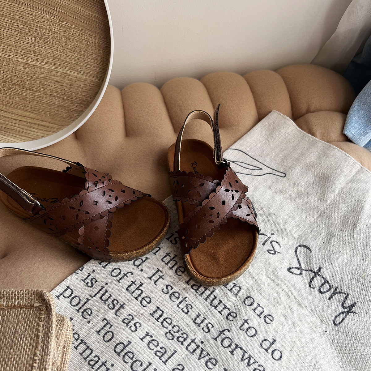 빈티지 어린이 샌들 여성용 가죽 겉옷 비치 샌들 중공 레이스 오픈 발가락 어린이 부드러운 밑창 나무 신발스토어 가기