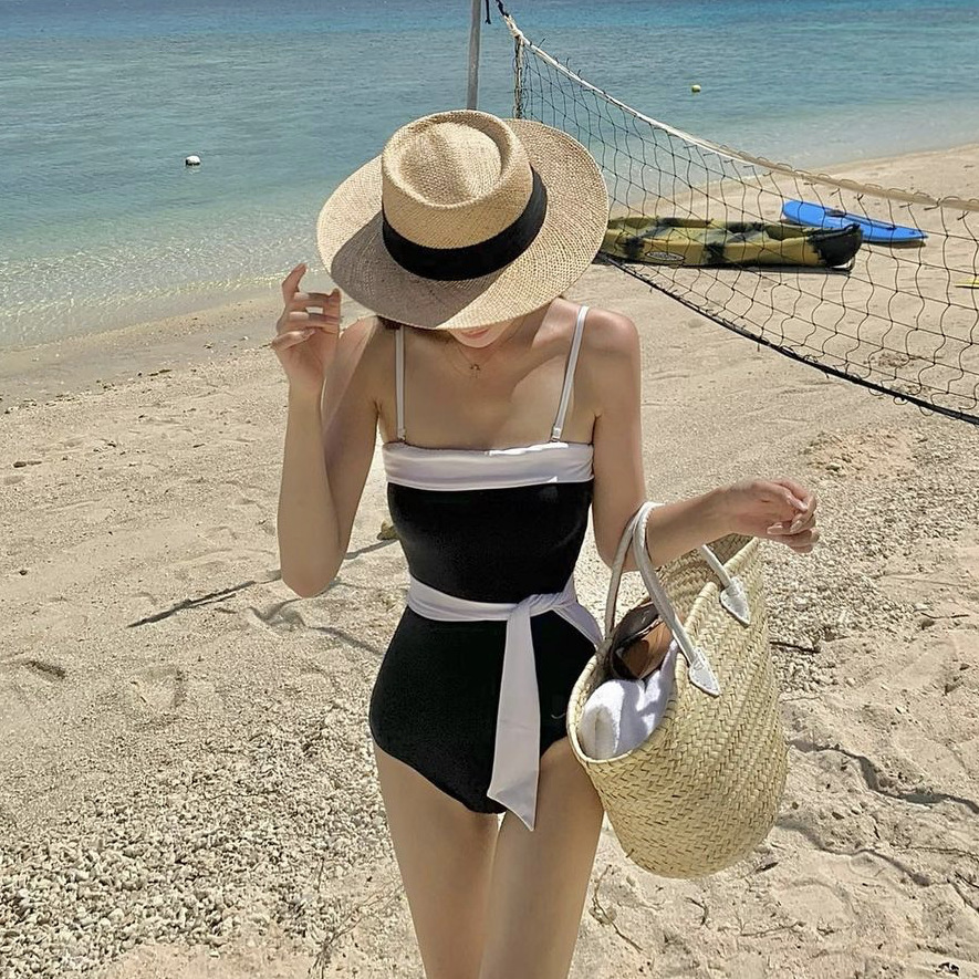 도매 수영복 한국식 인 스타일 튜브 탑 작은 향기 스타일 기질 흑백 햅번 스타일 보수적 배꼽 커버 원피스 수영복 여성스토어 가기