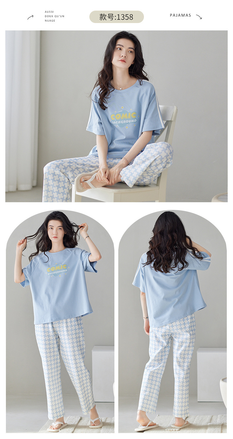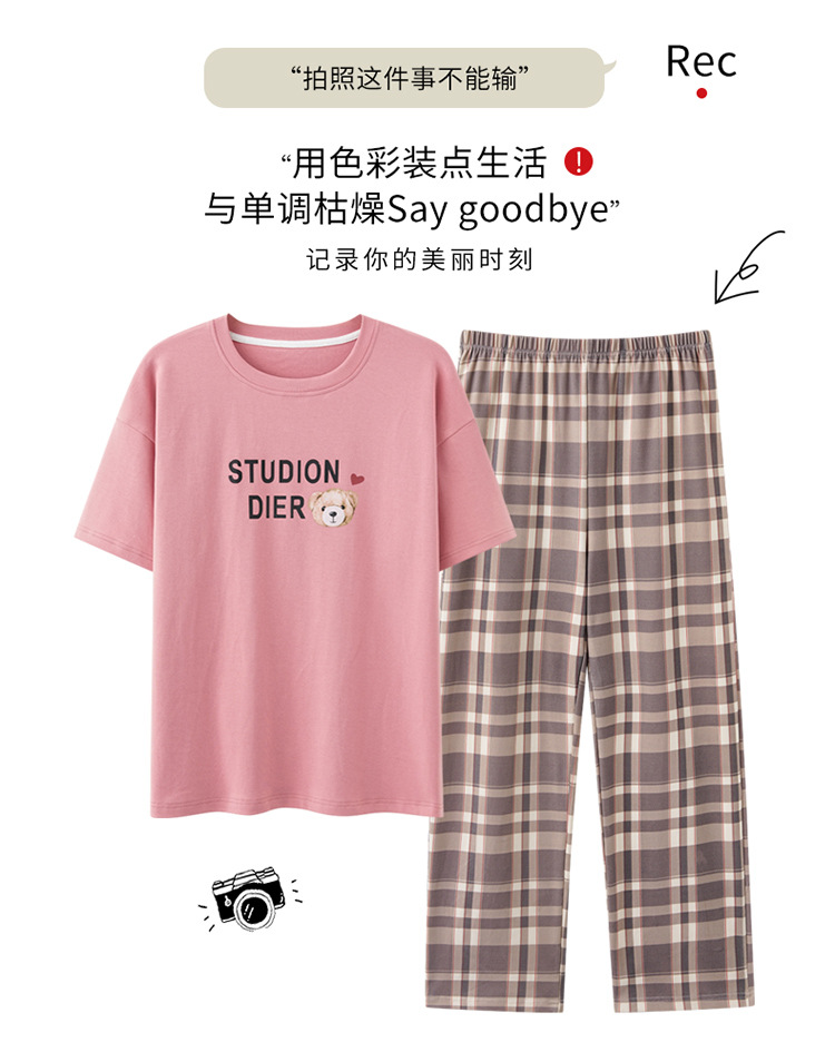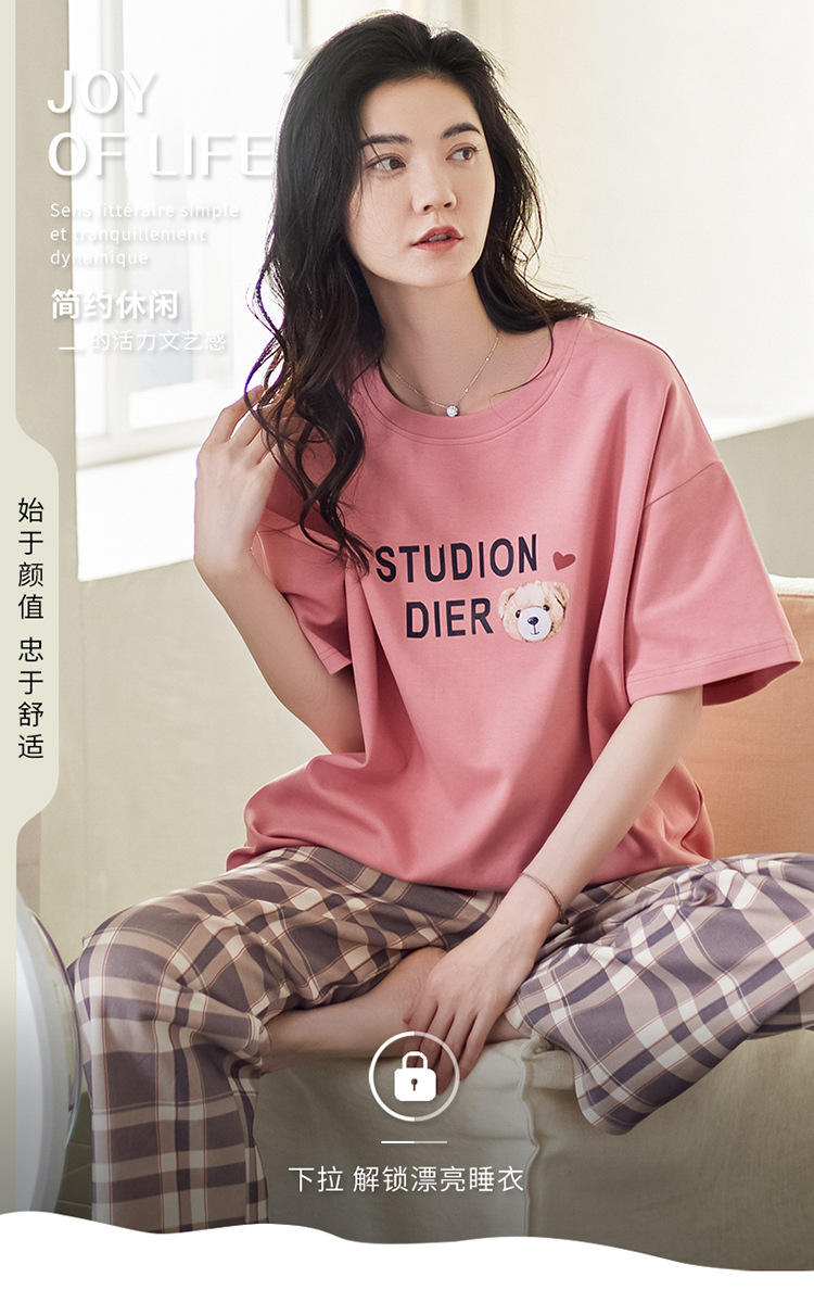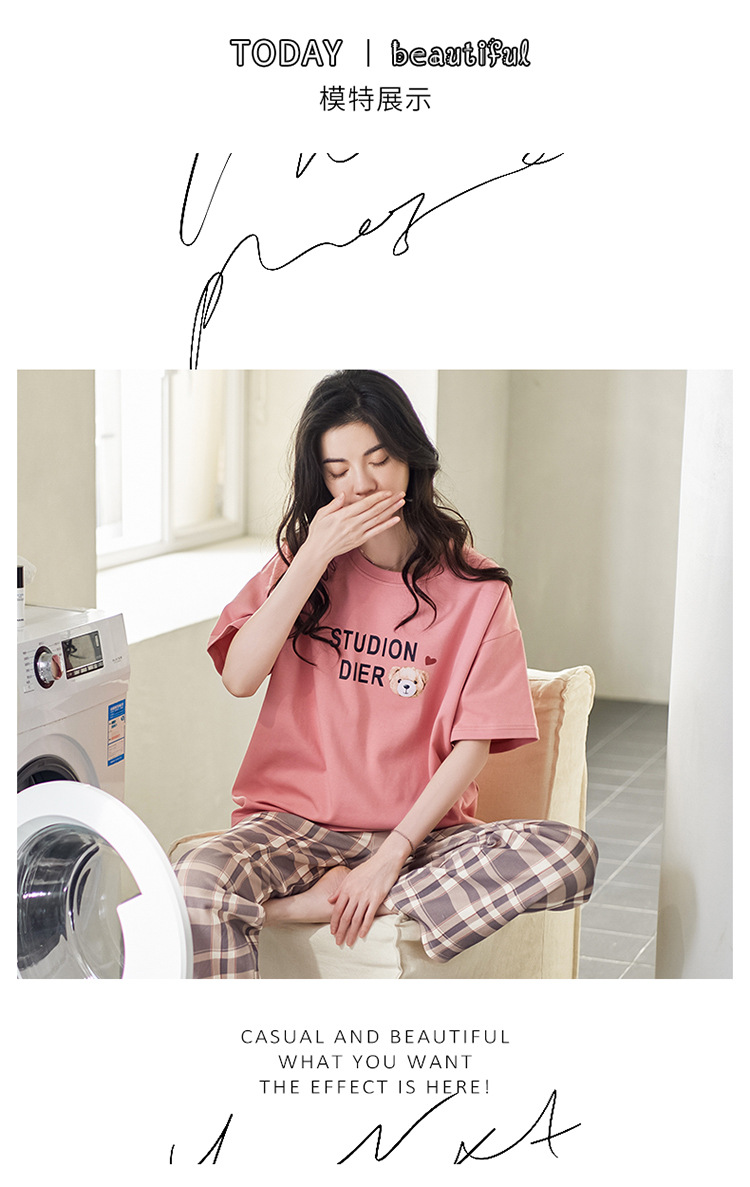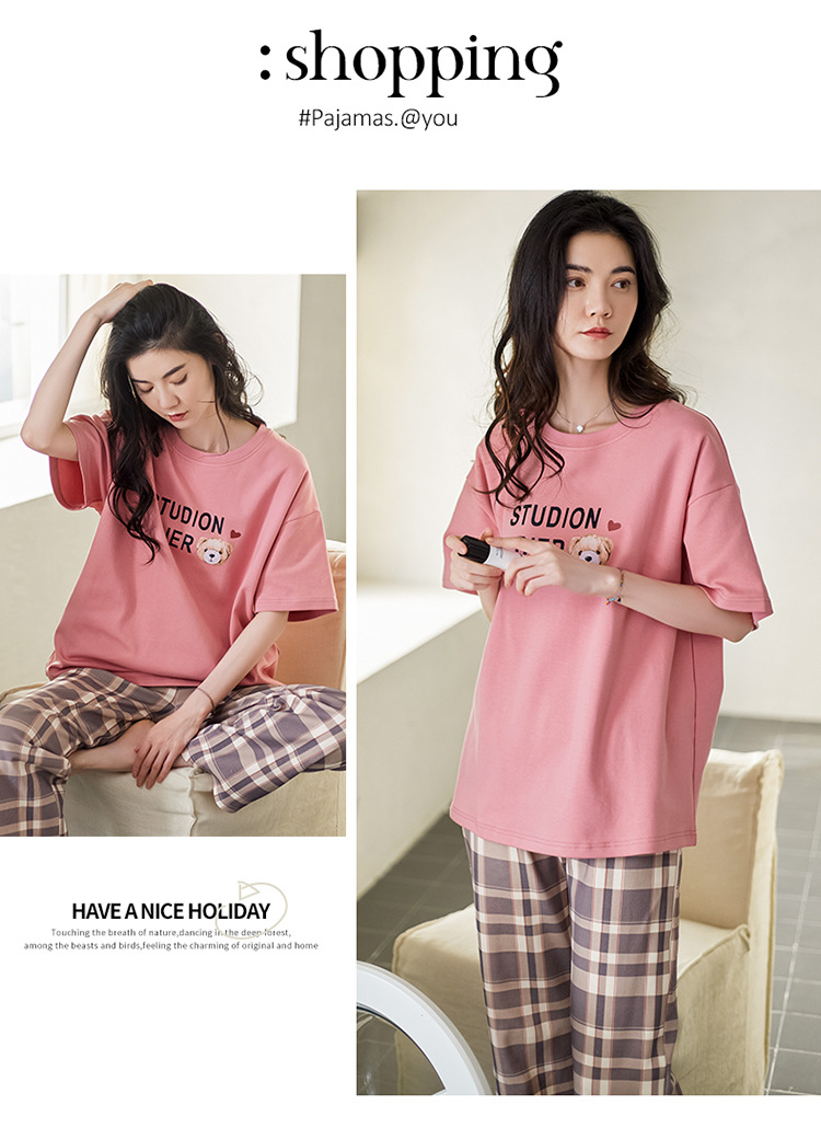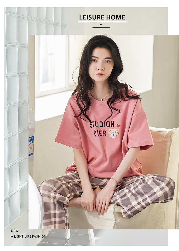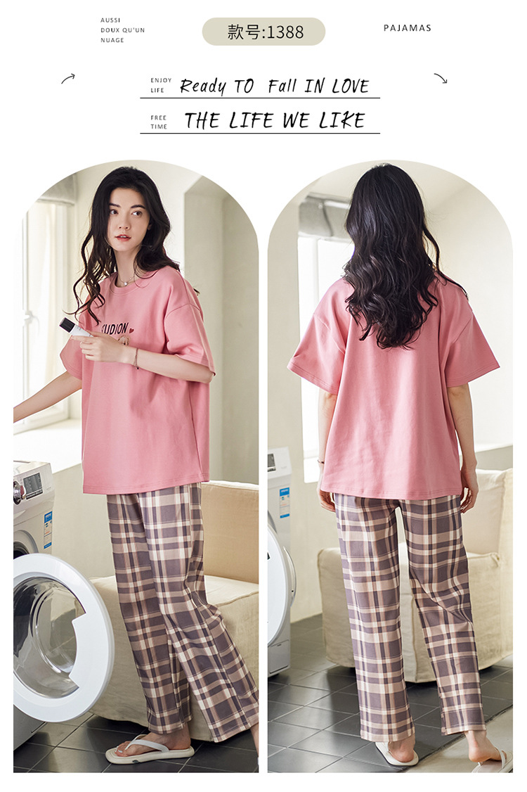 여성용 여름 잠옷 100% 순면 반팔 긴바지 세트 체크무늬 여성 홈웨어 얇고 외출 가능 전원풍스토어 가기