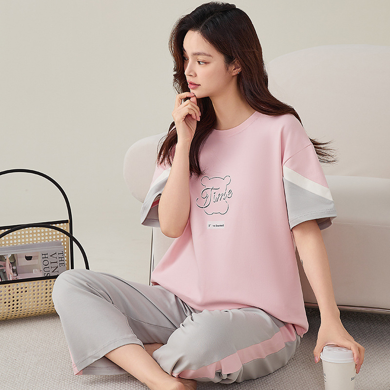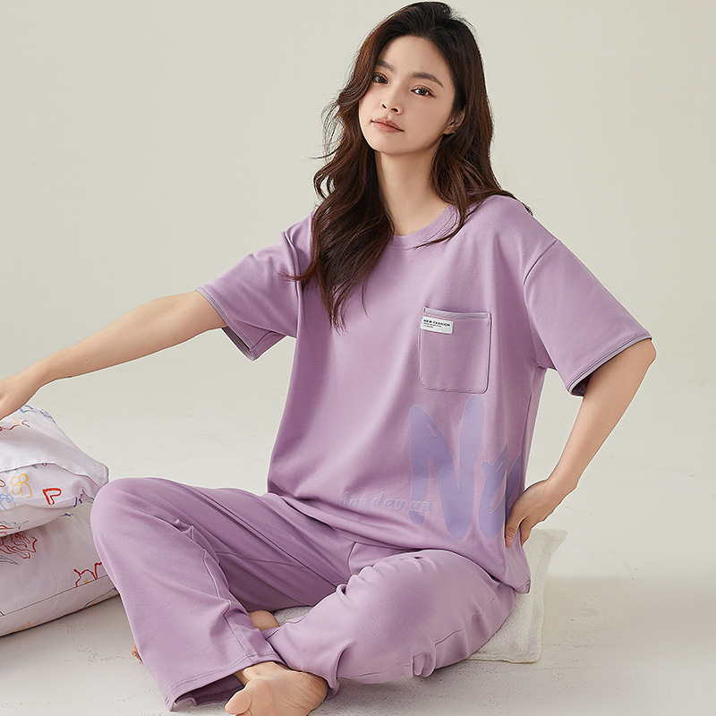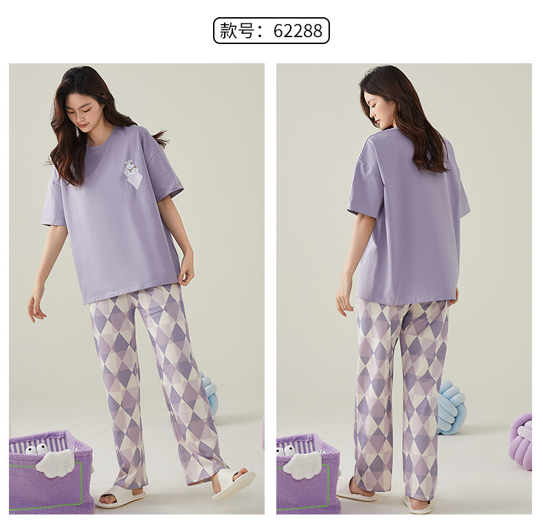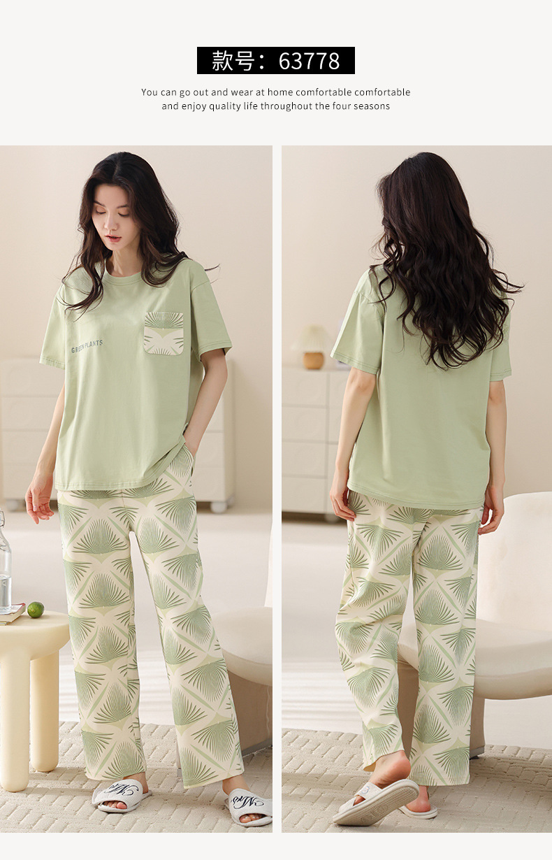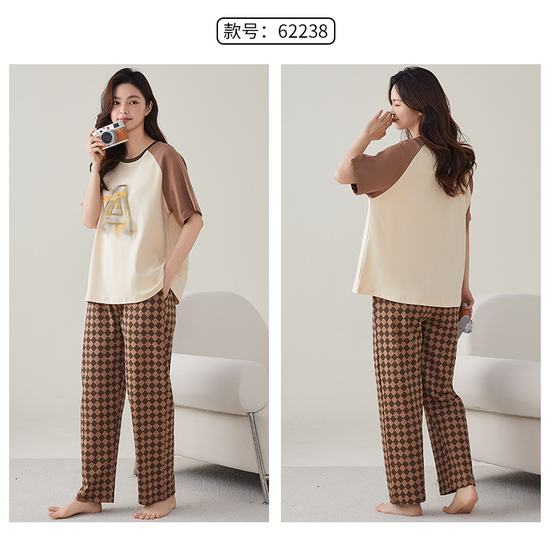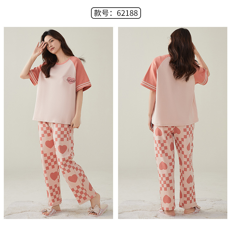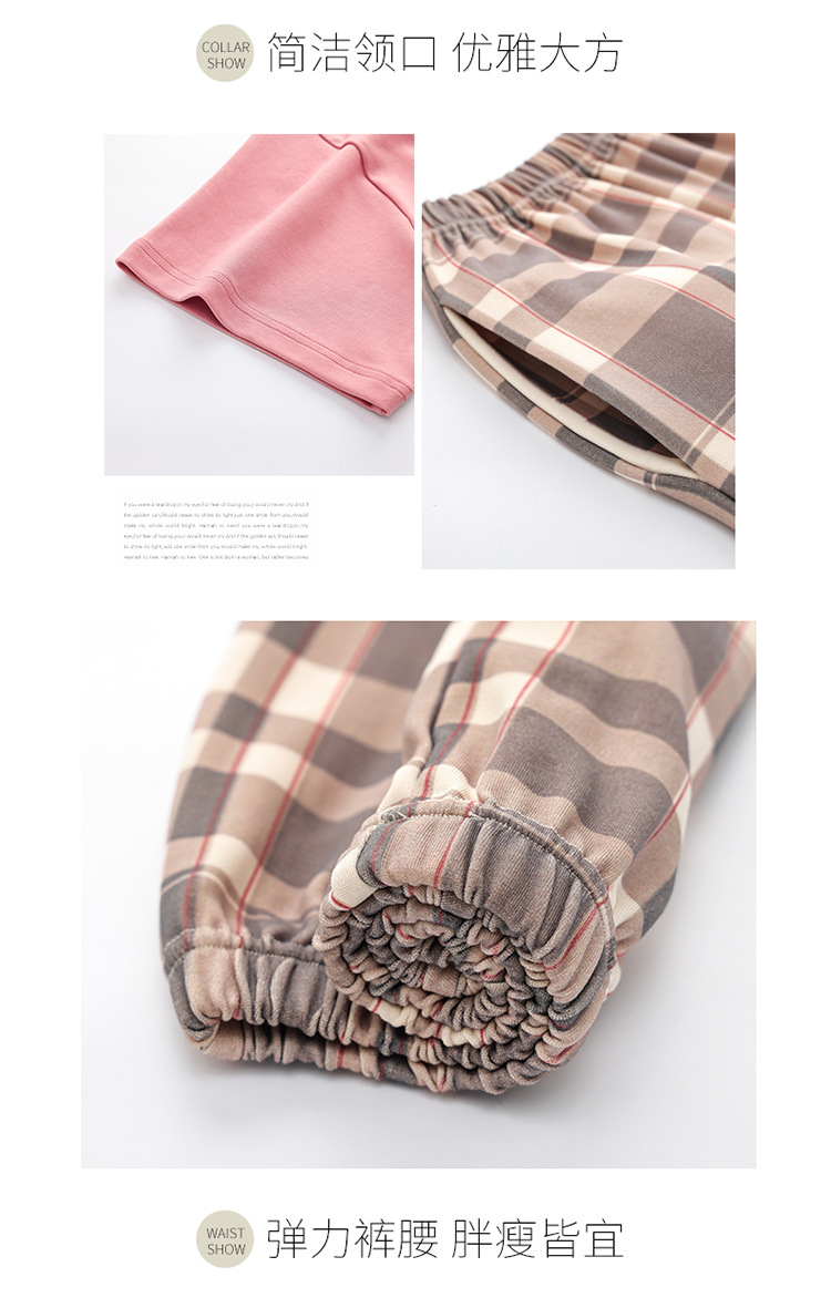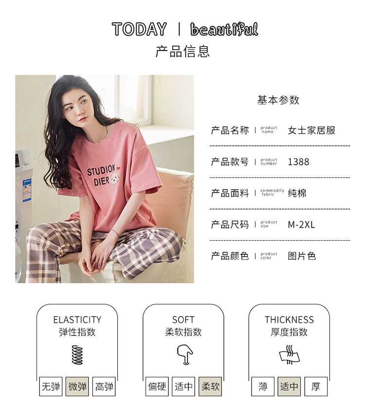 여성용 여름 잠옷 100% 순면 반팔 긴바지 세트 체크무늬 여성 홈웨어 얇고 외출 가능 전원풍스토어 가기