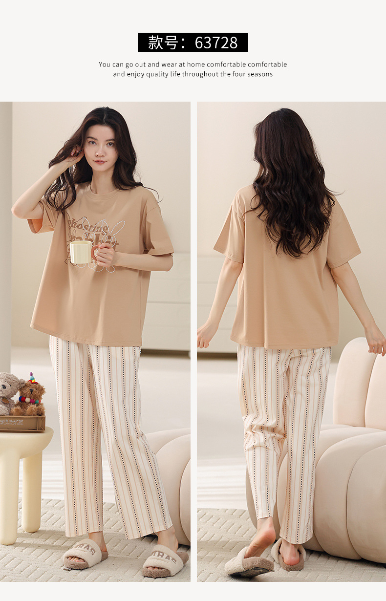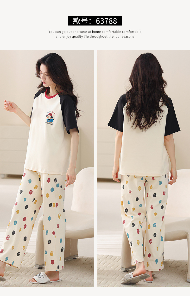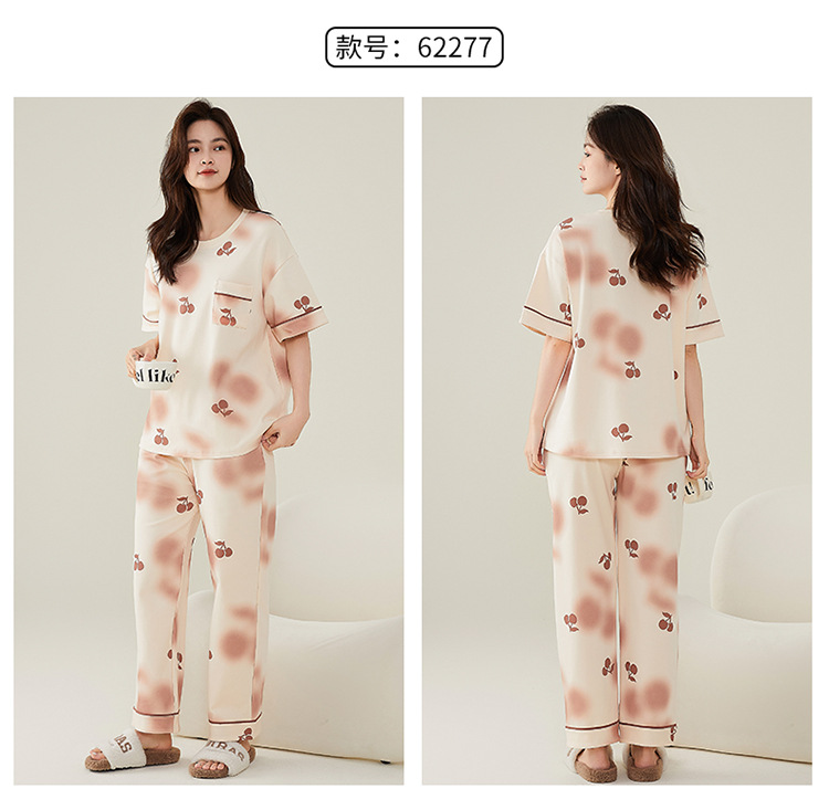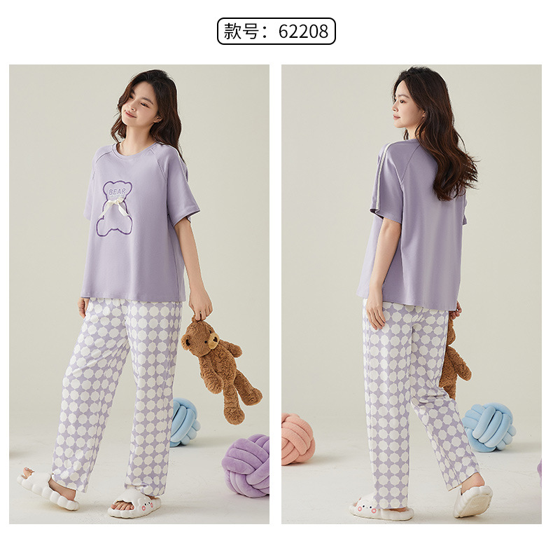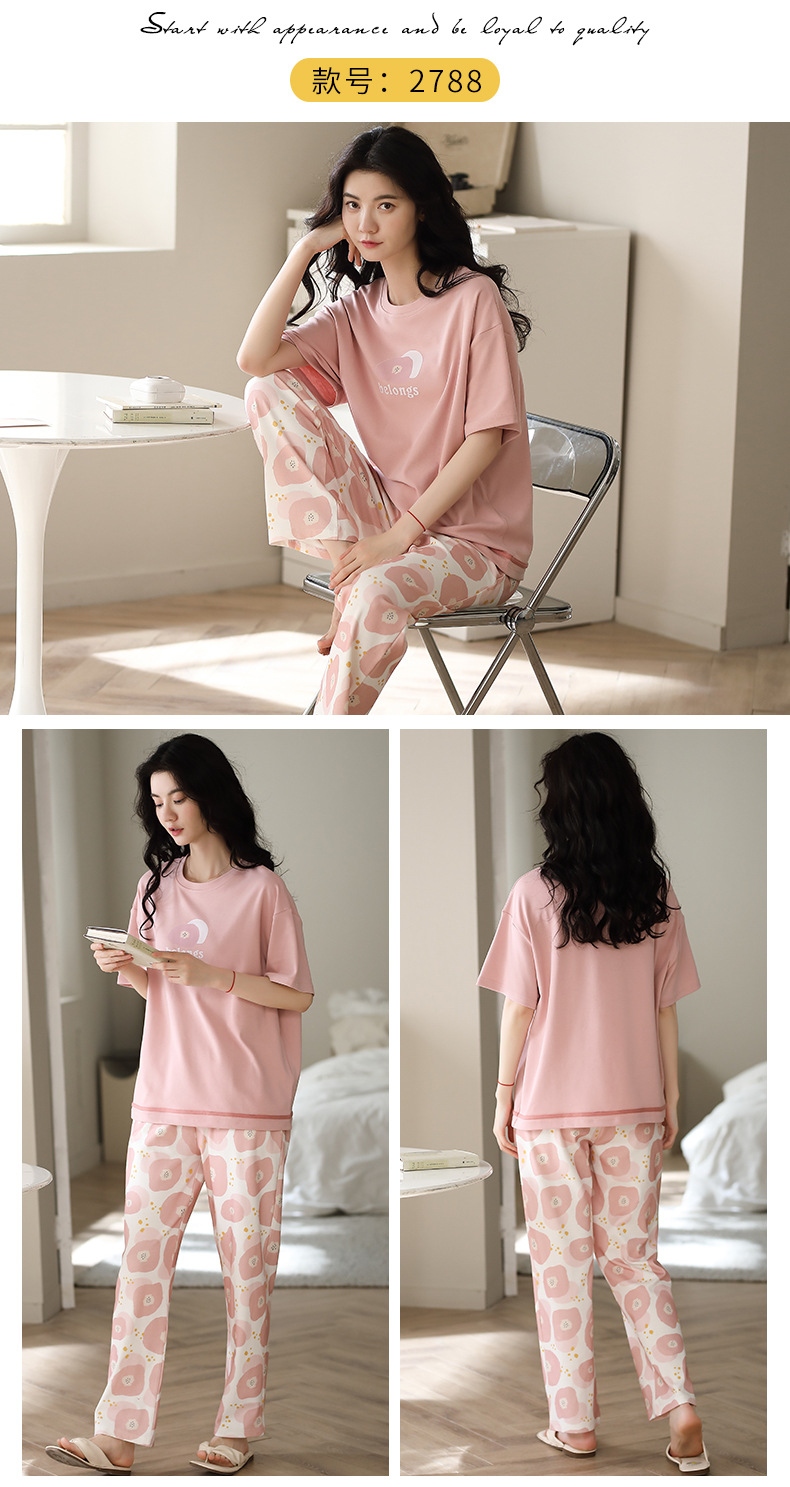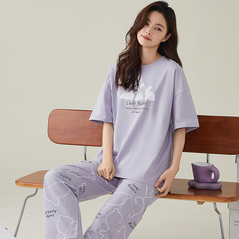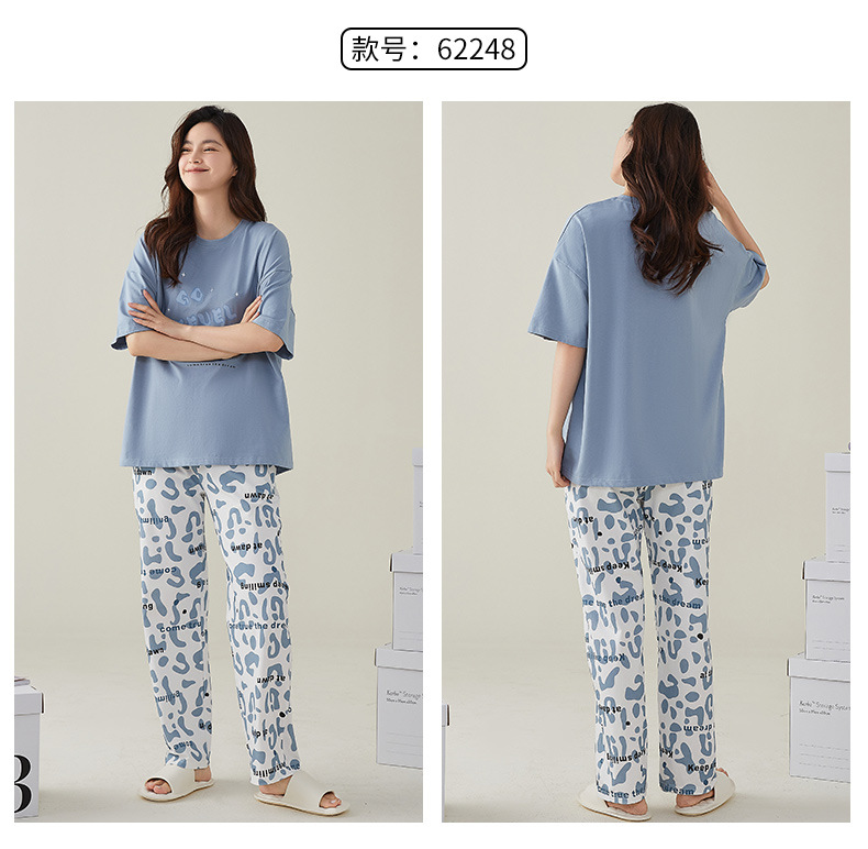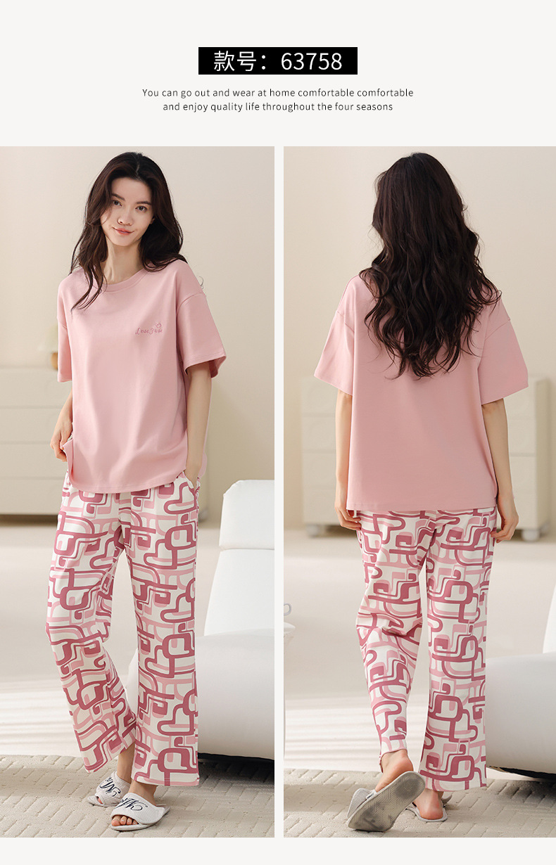 여성용 여름 잠옷 100% 순면 반팔 긴바지 세트 체크무늬 여성 홈웨어 얇고 외출 가능 전원풍스토어 가기