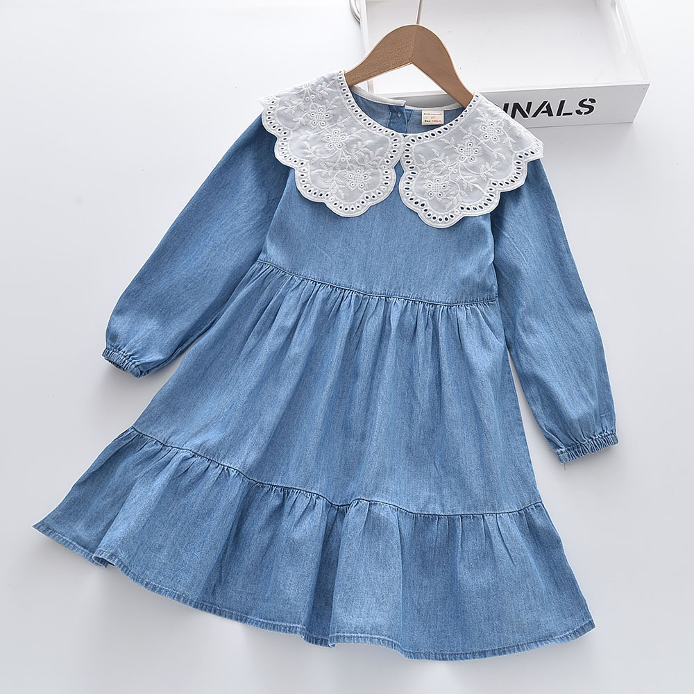 속이 빈 레이스 라펠 여아 긴팔 데님 드레스 2022 봄 신상품 1228-02