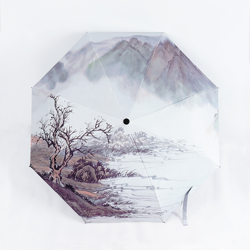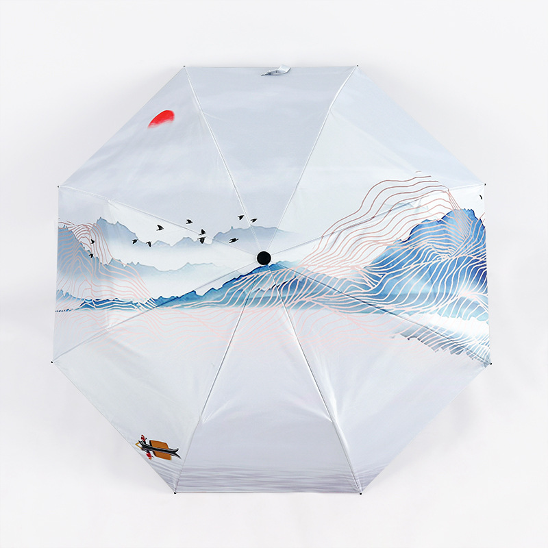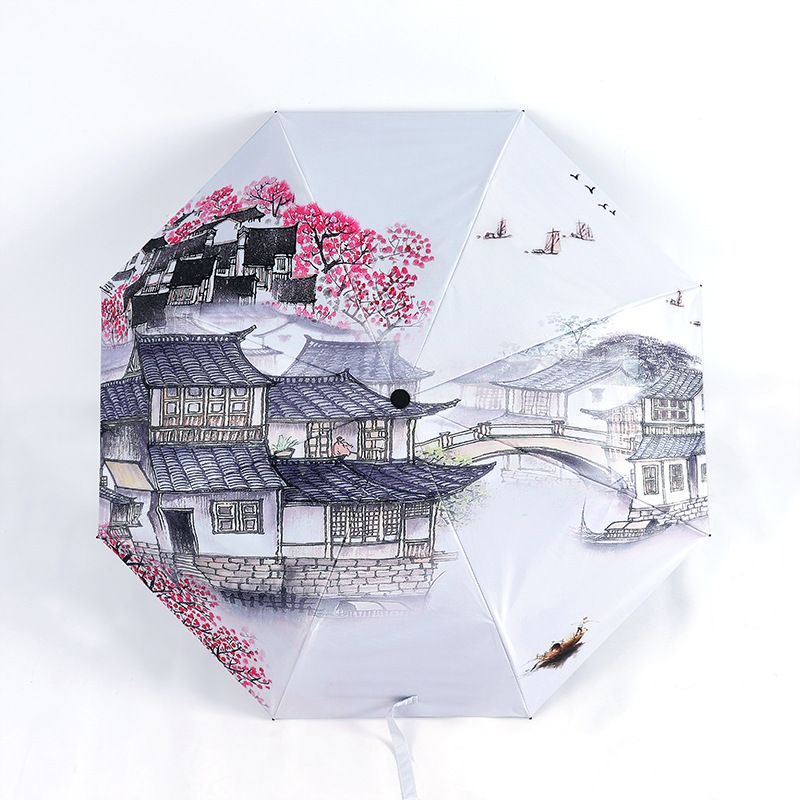 Guofeng 써니 우산 3 배 블랙 고무 차양 자외선 차단제 나무 손잡이 우산 예술적 여성의 접는 우산 디지털 인쇄 태양 우산