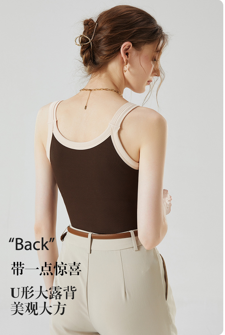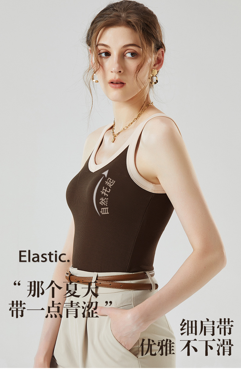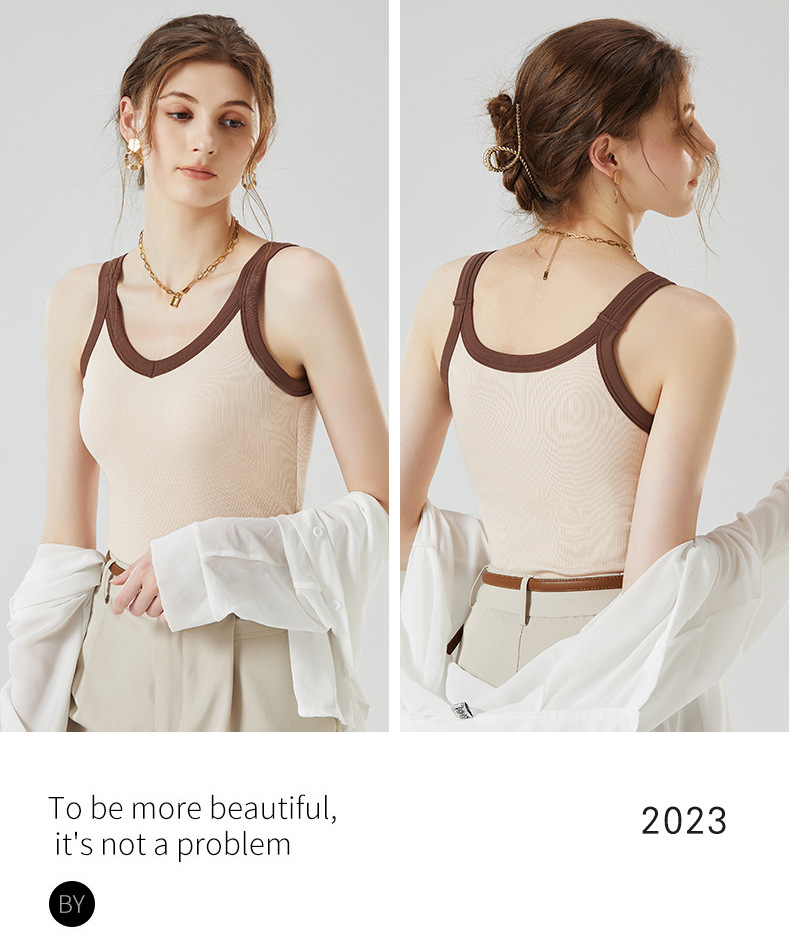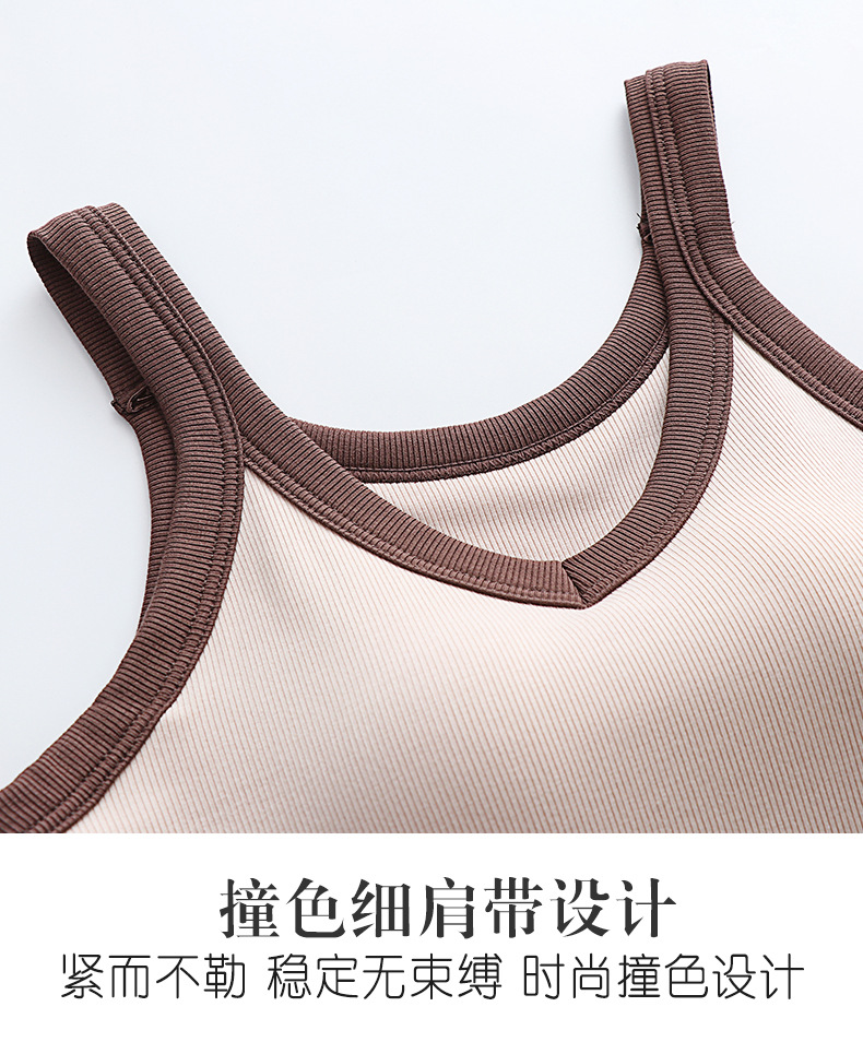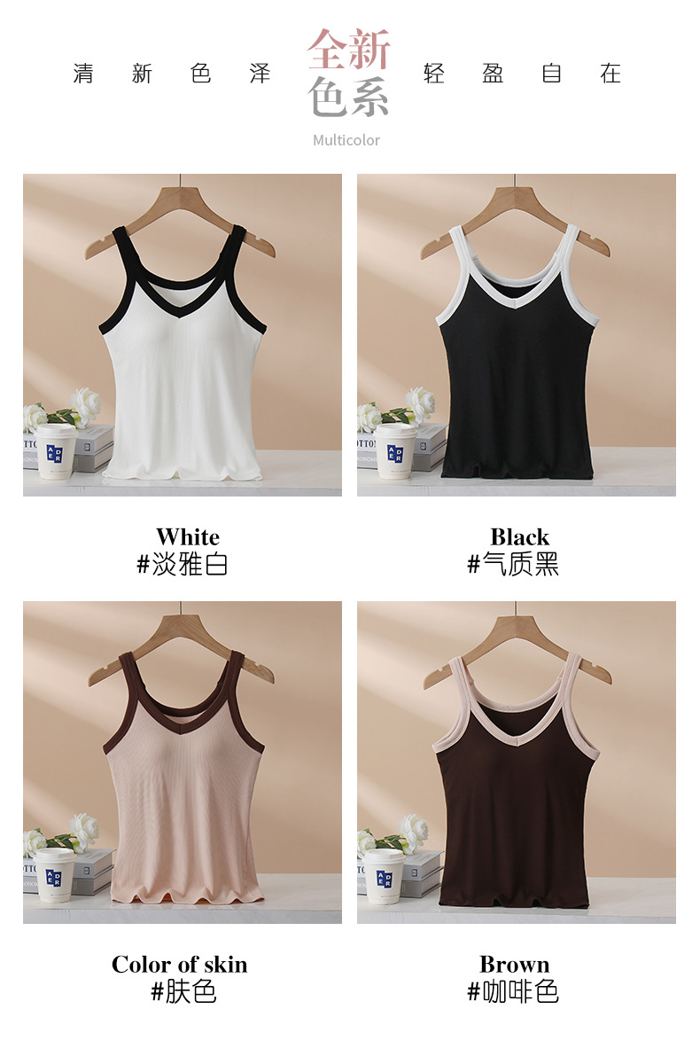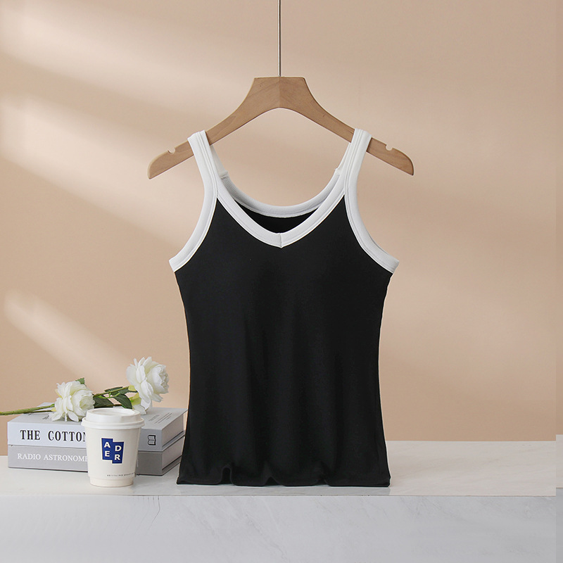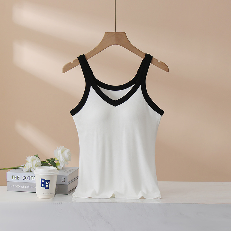 가슴 패드와 캐미솔 컵 일체형 컬러 대비 와이드 숄더 브이넥 민소매 베이스 셔츠 여성용 인터넷 연예인 이너베이스 셔츠