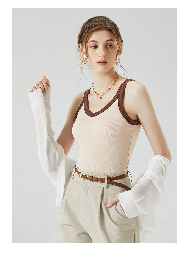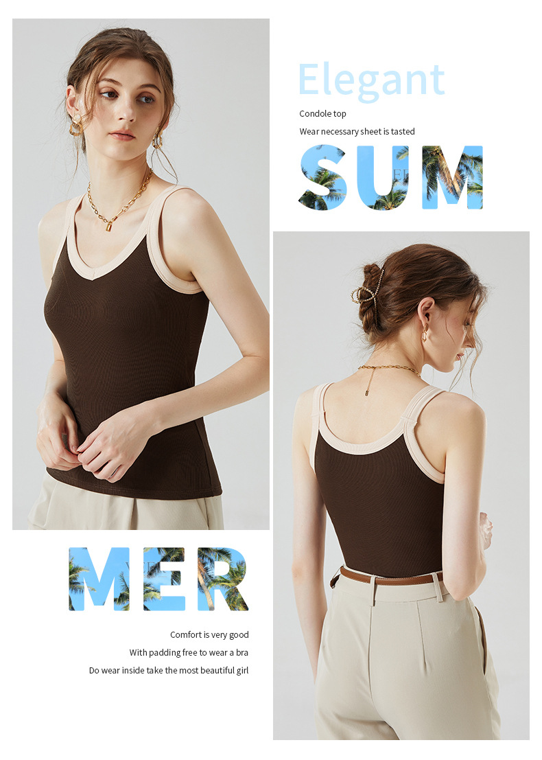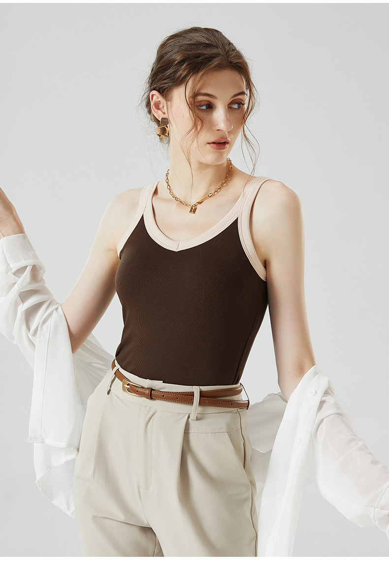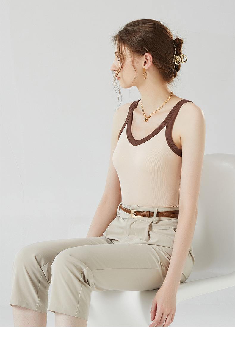 가슴 패드와 캐미솔 컵 일체형 컬러 대비 와이드 숄더 브이넥 민소매 베이스 셔츠 여성용 인터넷 연예인 이너베이스 셔츠스토어 가기
