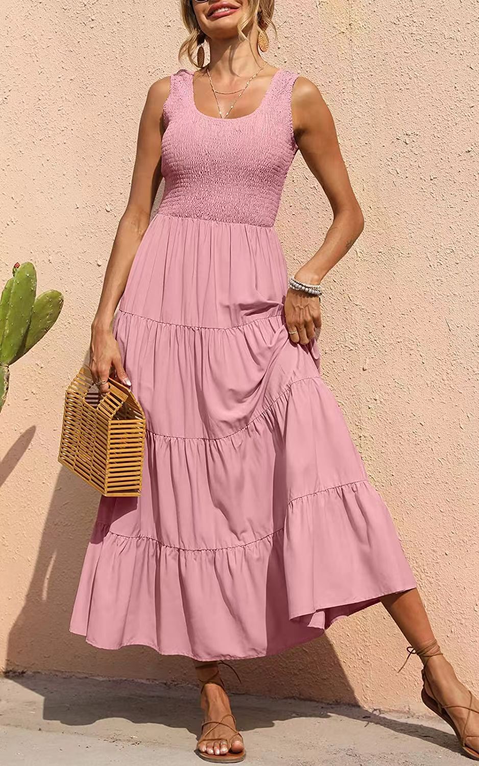 2023 봄 유럽과 미국 대외 무역 크로스 보더 여성의 원피스 아마존 멜빵 스커트 주름 바느질 모양의 대형 진자 원피스