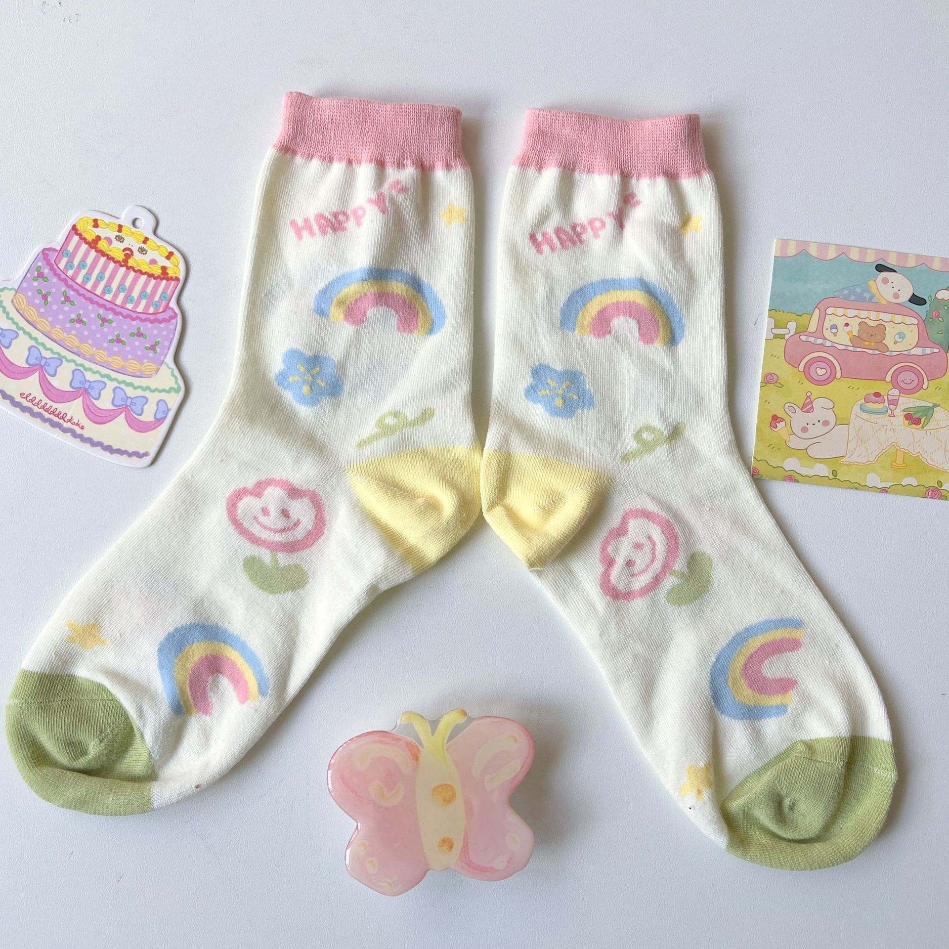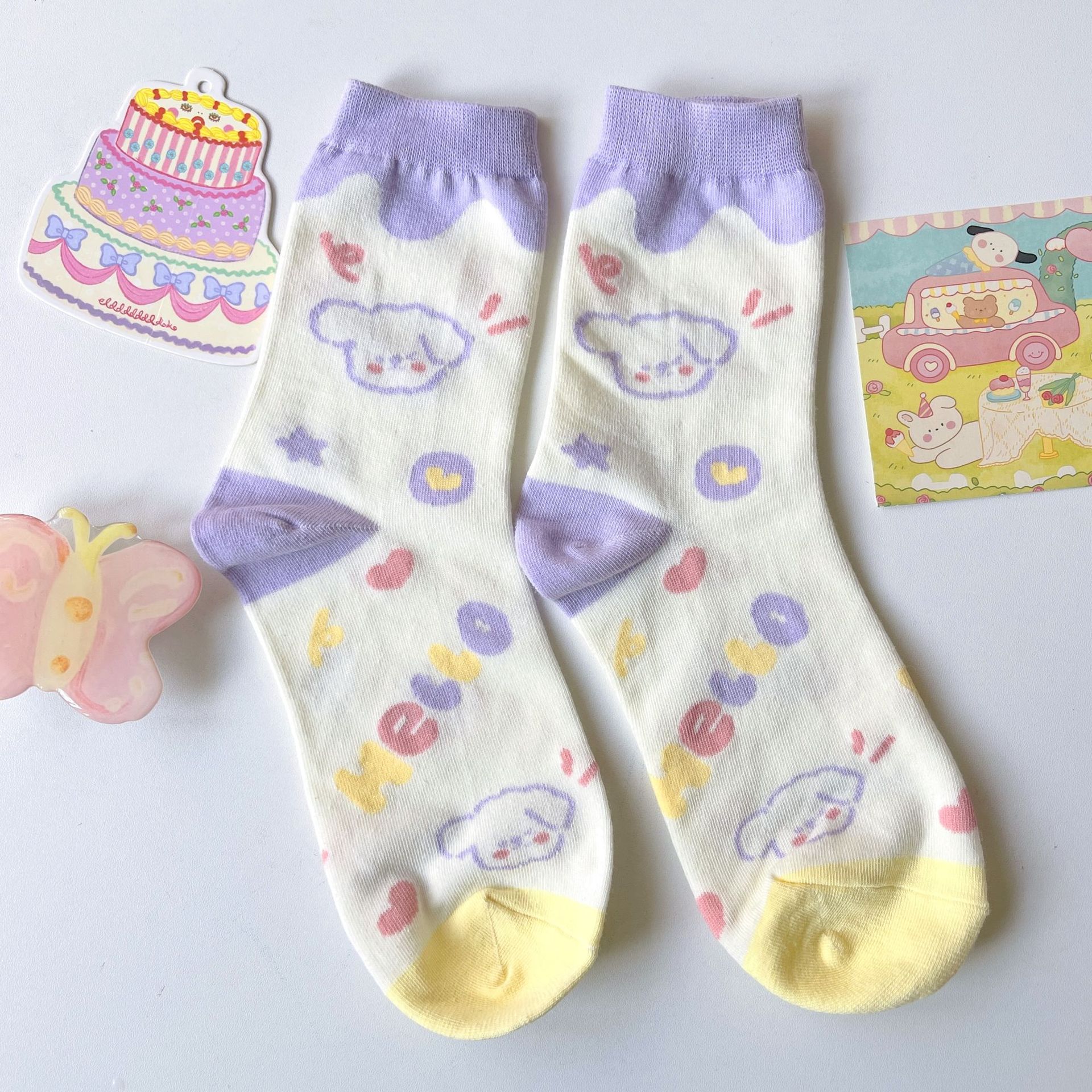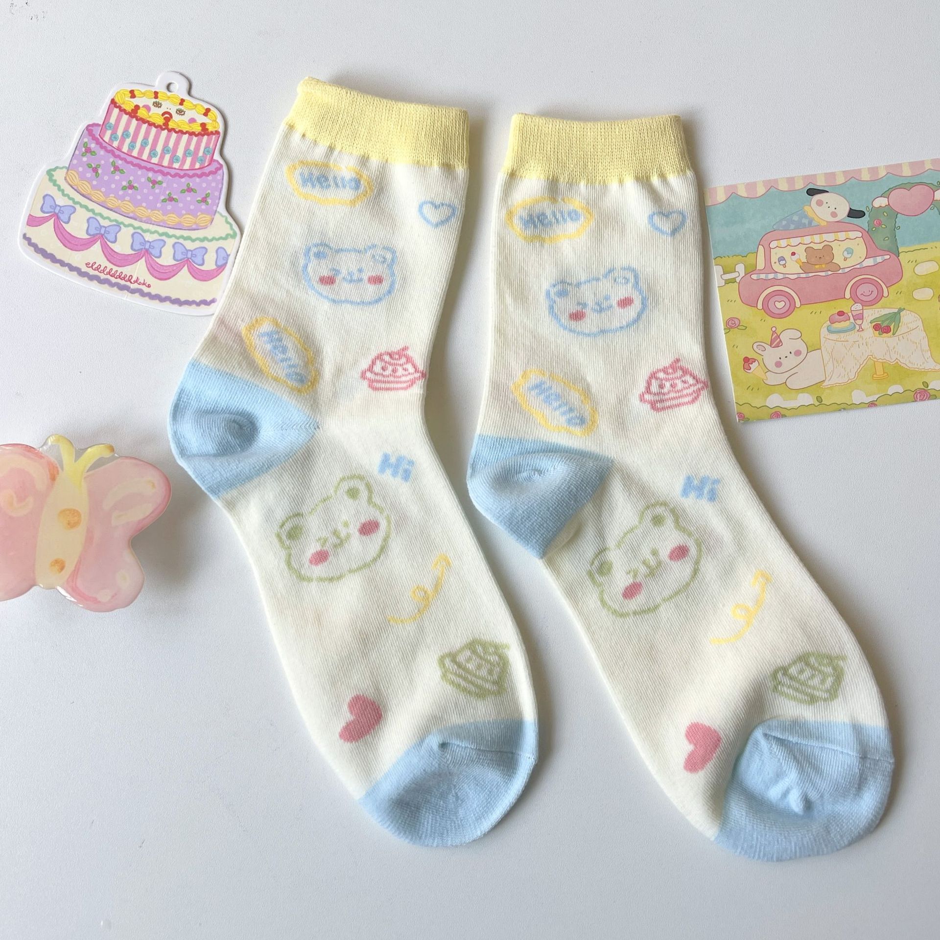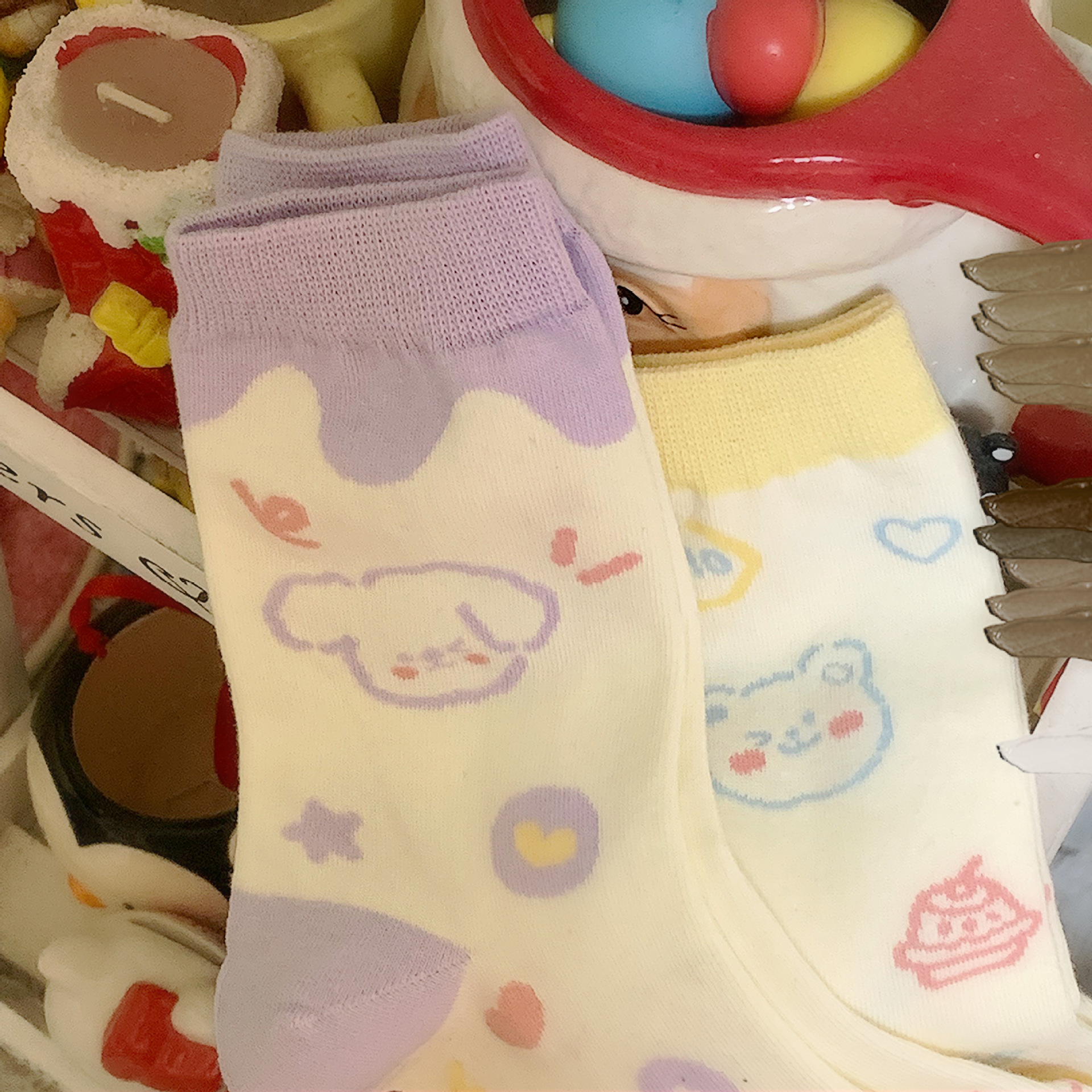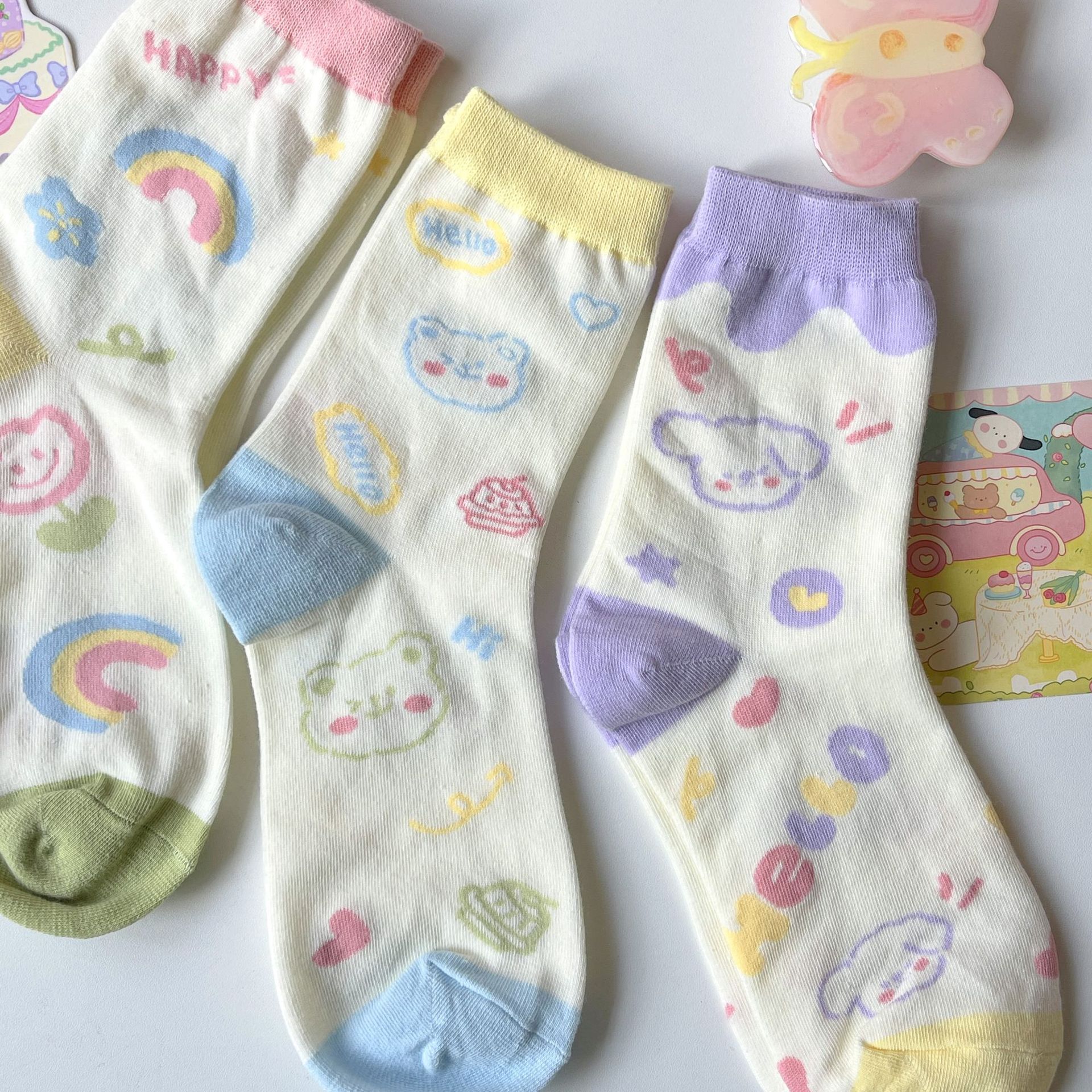 양말 여성용 한국식 중간 길이 인 트렌디 JK 소녀 일본식 봄과 여름 귀여운 색상 매칭 만화 곰 자카드 중간 길이 양말스토어 가기