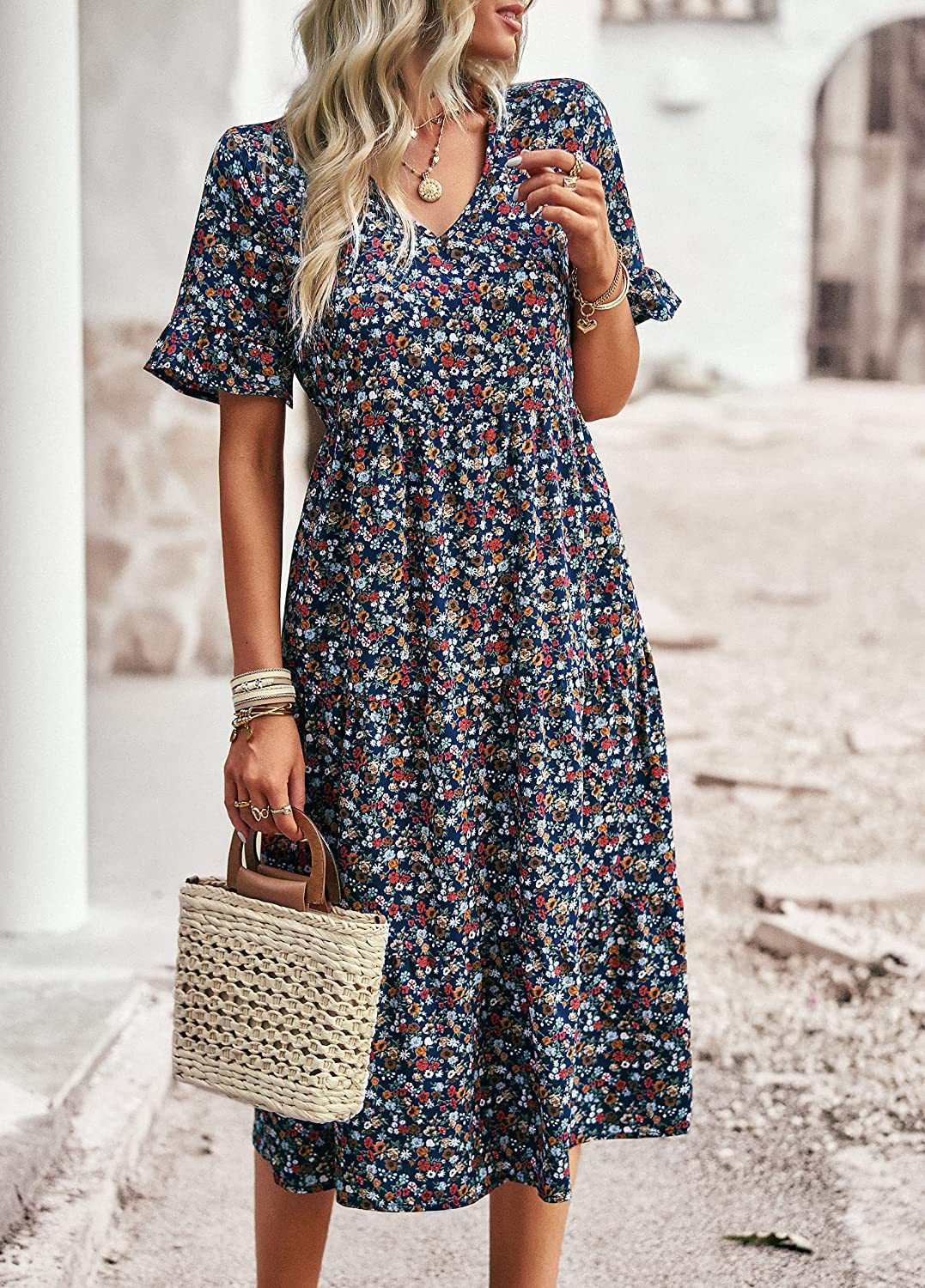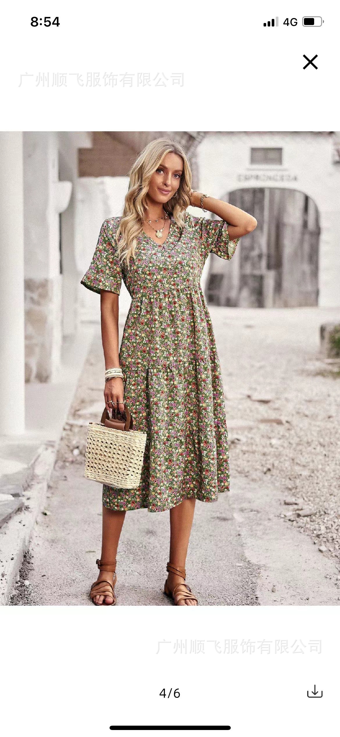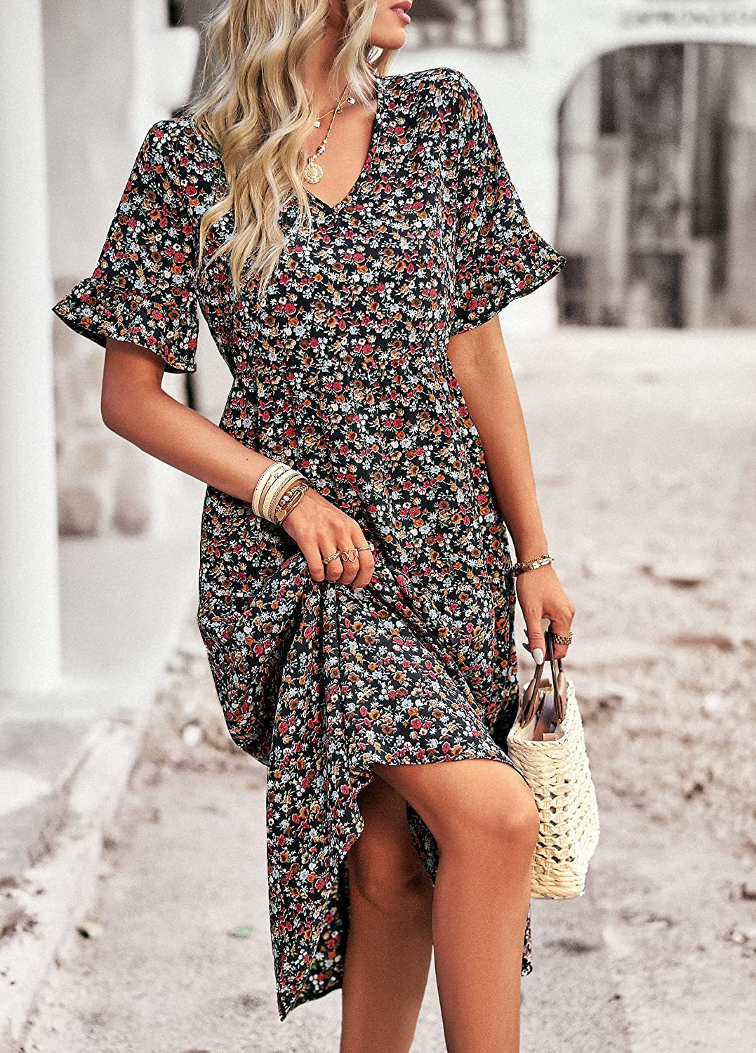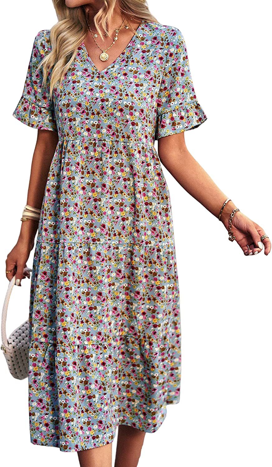 아마존 2023 여름 꽃 긴 원피스 캐주얼 보헤미안 V-넥 짧은 소매 우아한 해변 긴 태양 원피스스토어 가기