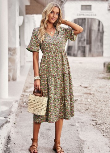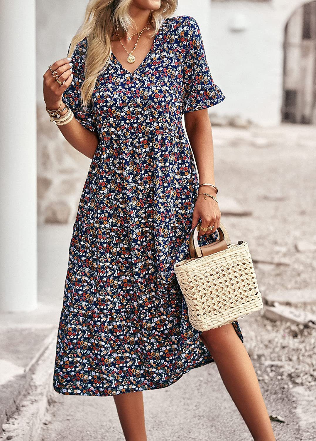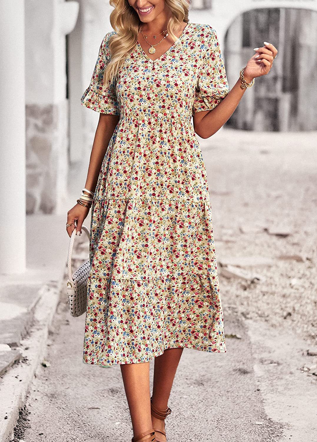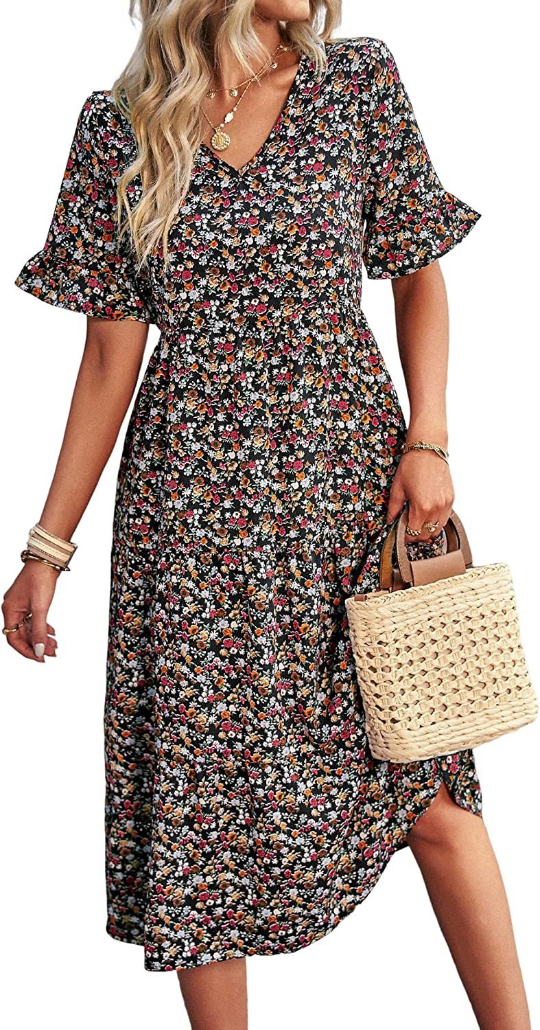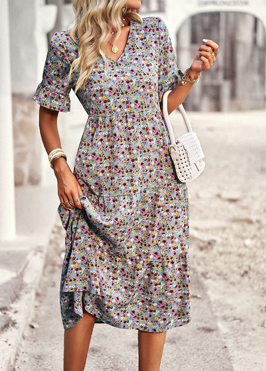아마존 2023 여름 꽃 긴 원피스 캐주얼 보헤미안 V-넥 짧은 소매 우아한 해변 긴 태양 원피스스토어 가기