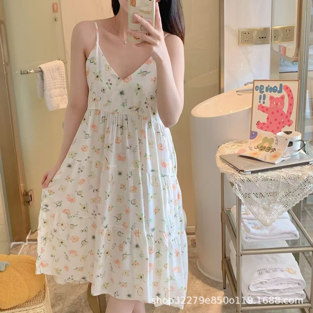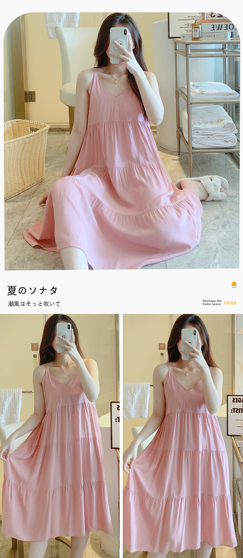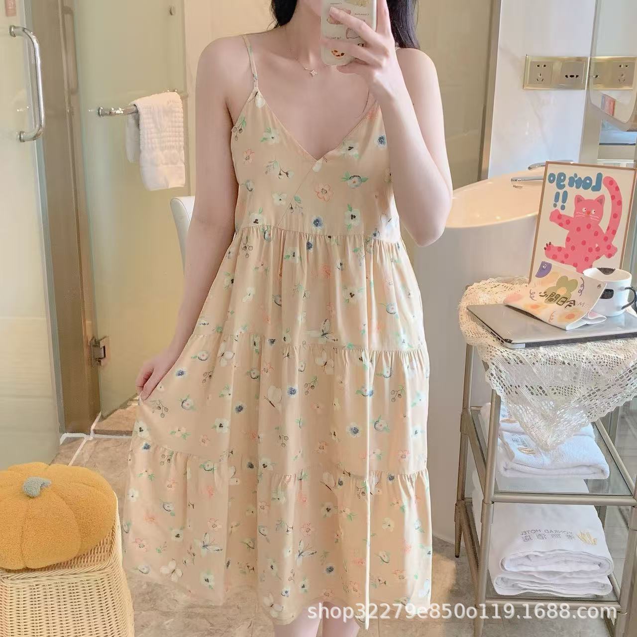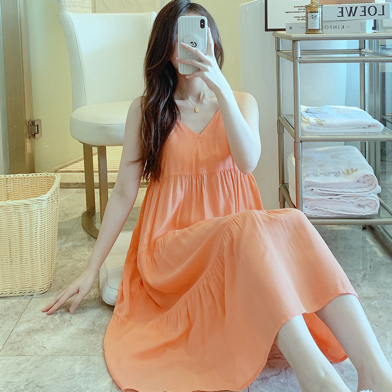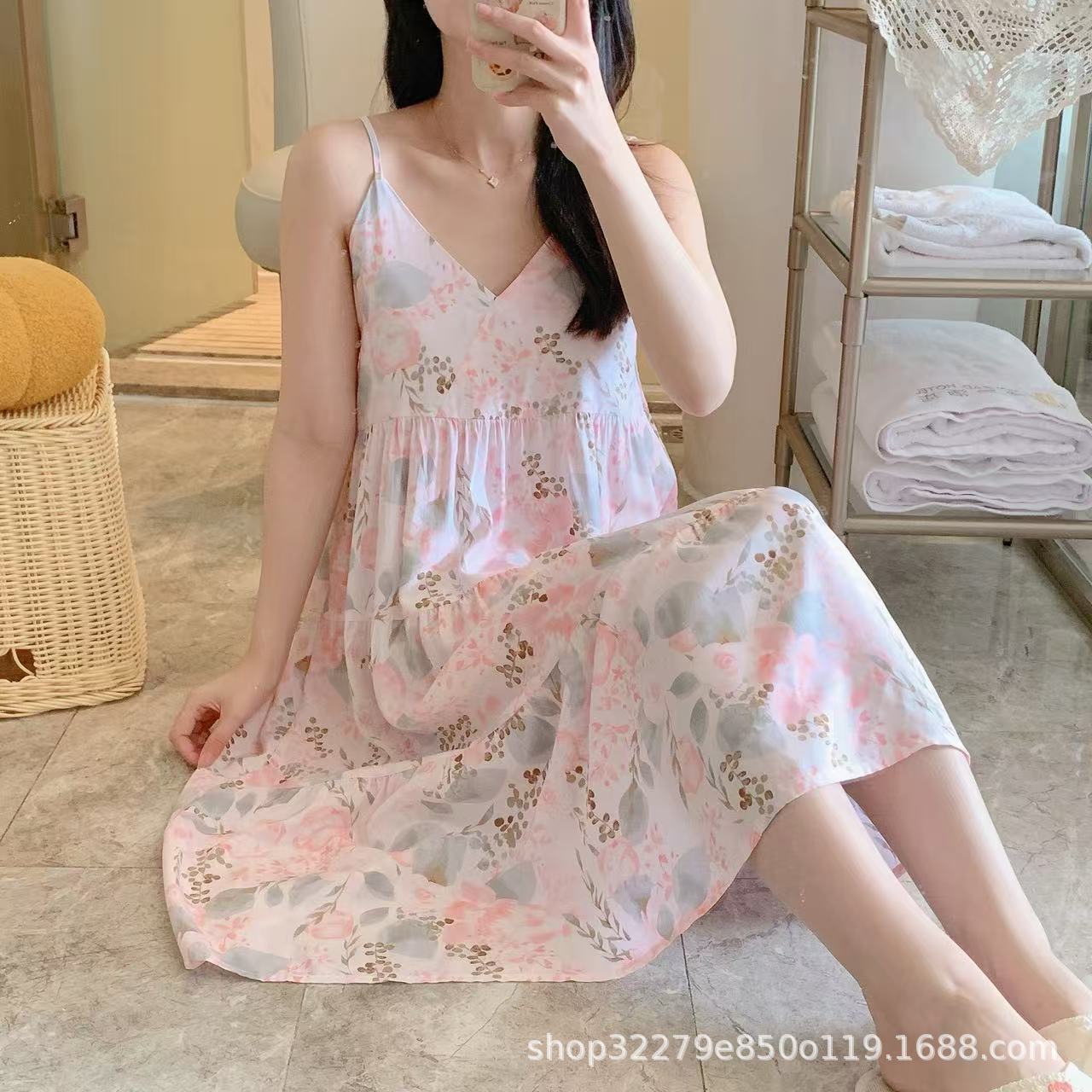 슬링 면 실크 잠옷 여자의 봄과 여름 새로운 잠옷 가정 옷 일본 스타일 달콤한 소녀 학생 단색 면 실크 원피스스토어 가기