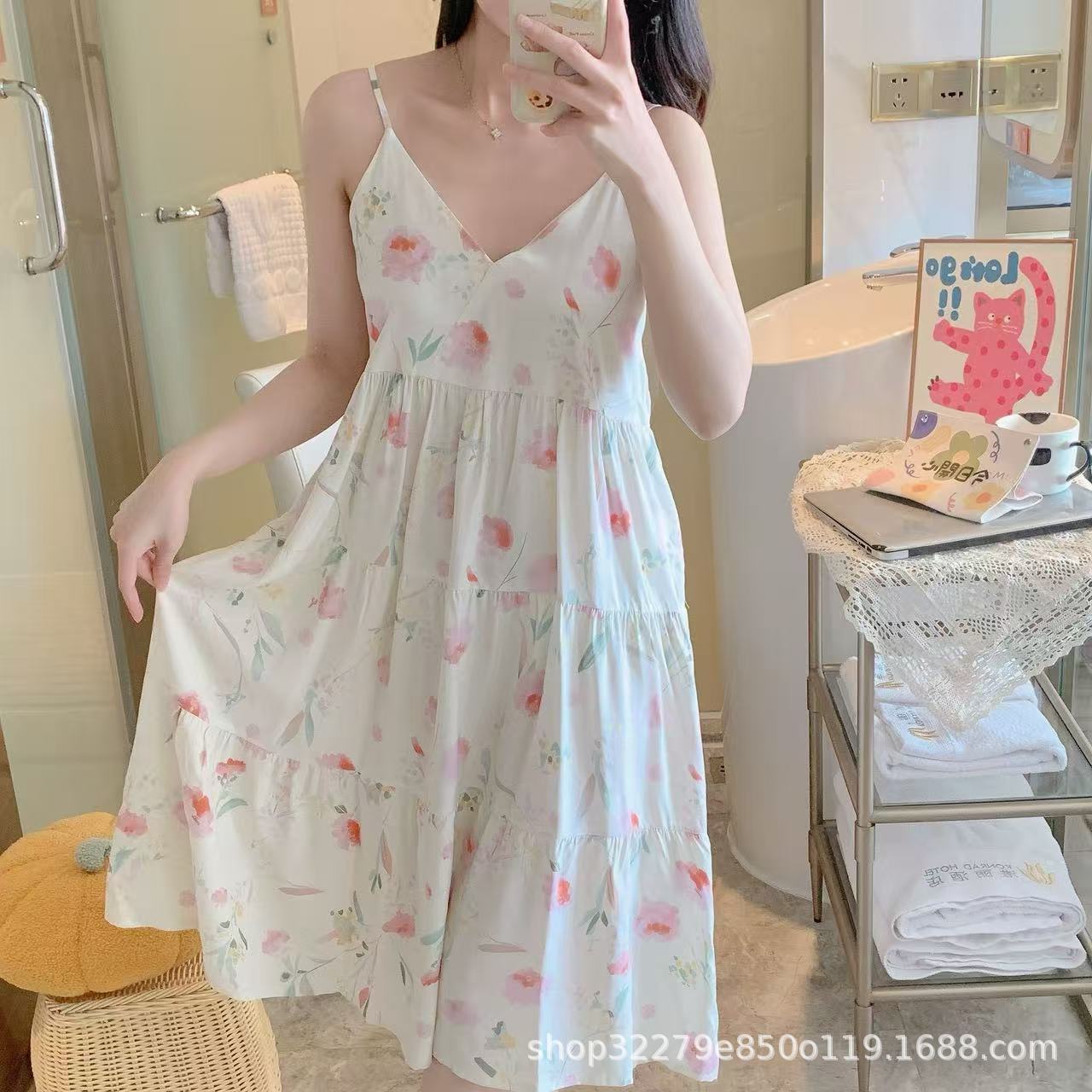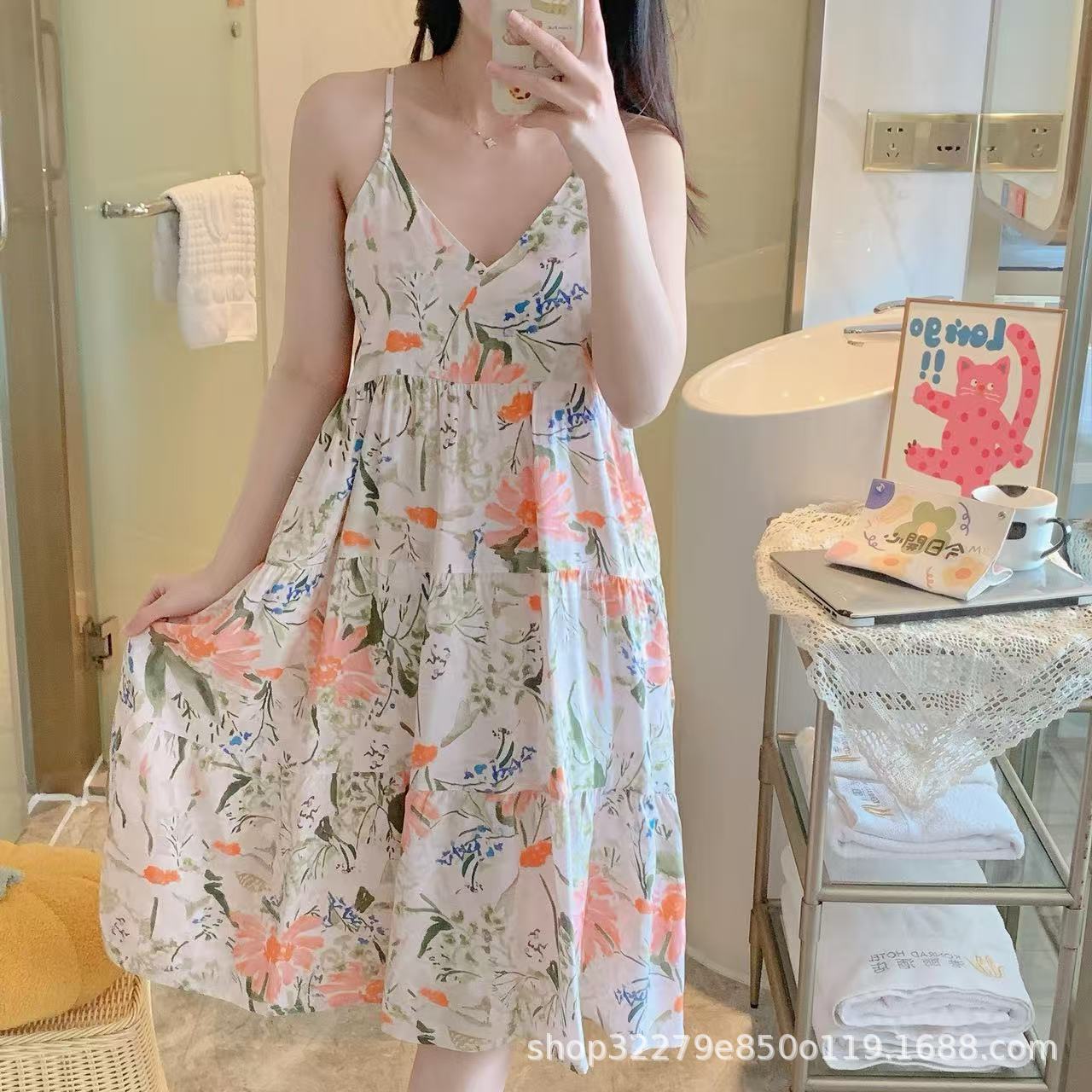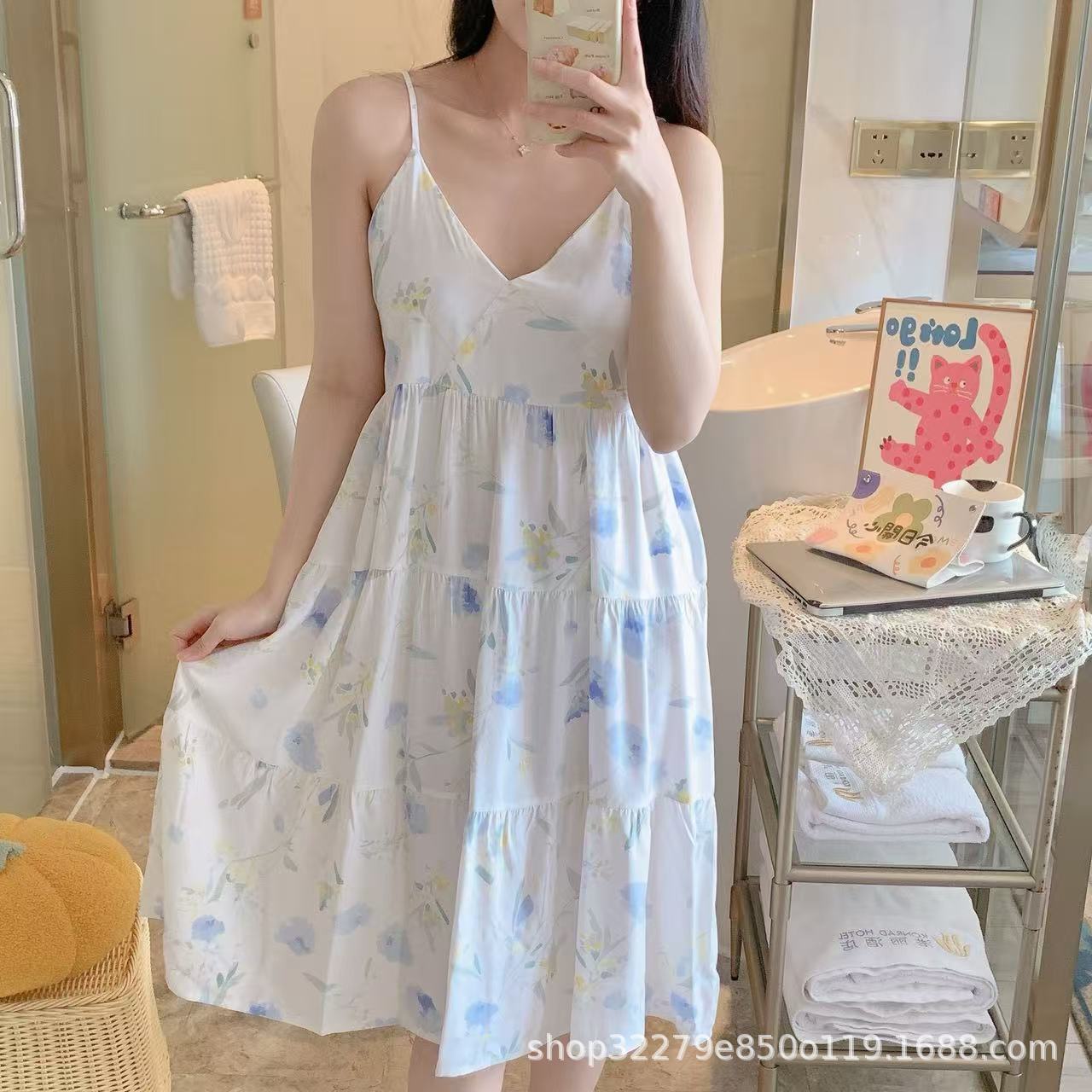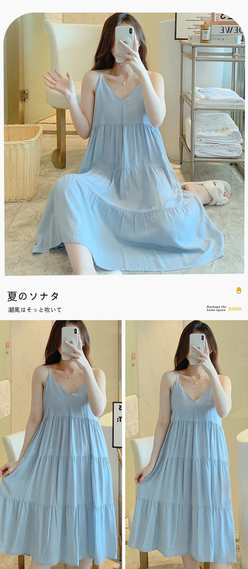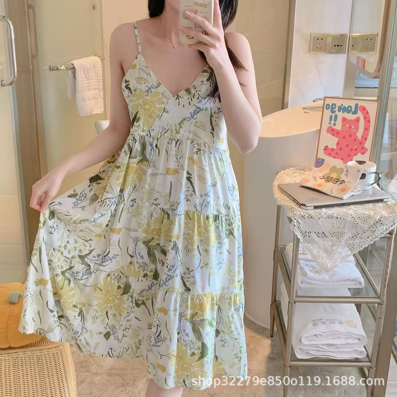 슬링 면 실크 잠옷 여자의 봄과 여름 새로운 잠옷 가정 옷 일본 스타일 달콤한 소녀 학생 단색 면 실크 원피스스토어 가기