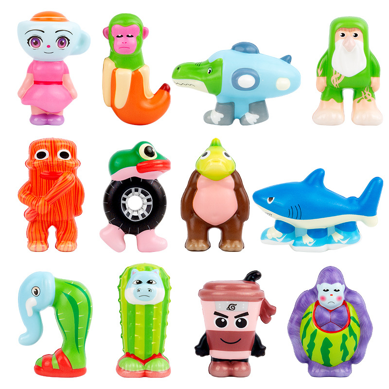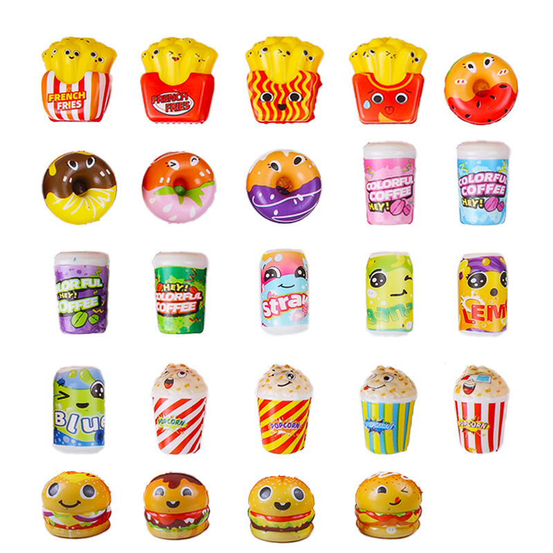 产品克重:【甜甜圈:5克】 【独角兽:16克】【 蛋仔:8.5克】【 6款垃圾食品:4-8克 】【8款食物:12.2~15克 】【24款蛋糕:8克】【 24款慢回弹小动物尺寸:5cm左右 克重:10g左右】