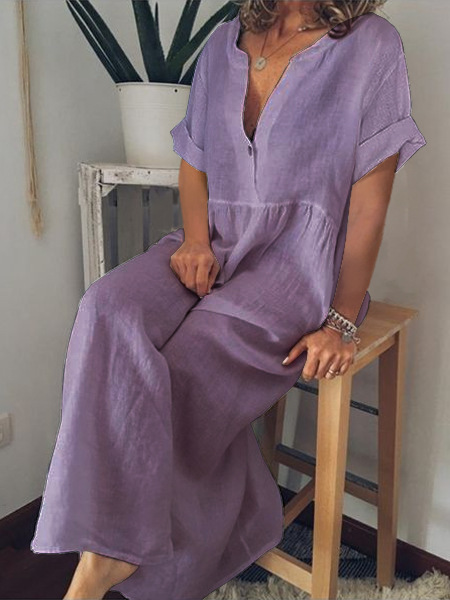 아마존 대외 무역 패션 여름 유럽과 미국 여성의 V-넥 반팔 면화와 린넨 단색 느슨한 플러스 사이즈 원피스