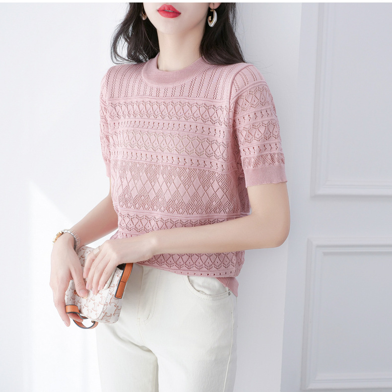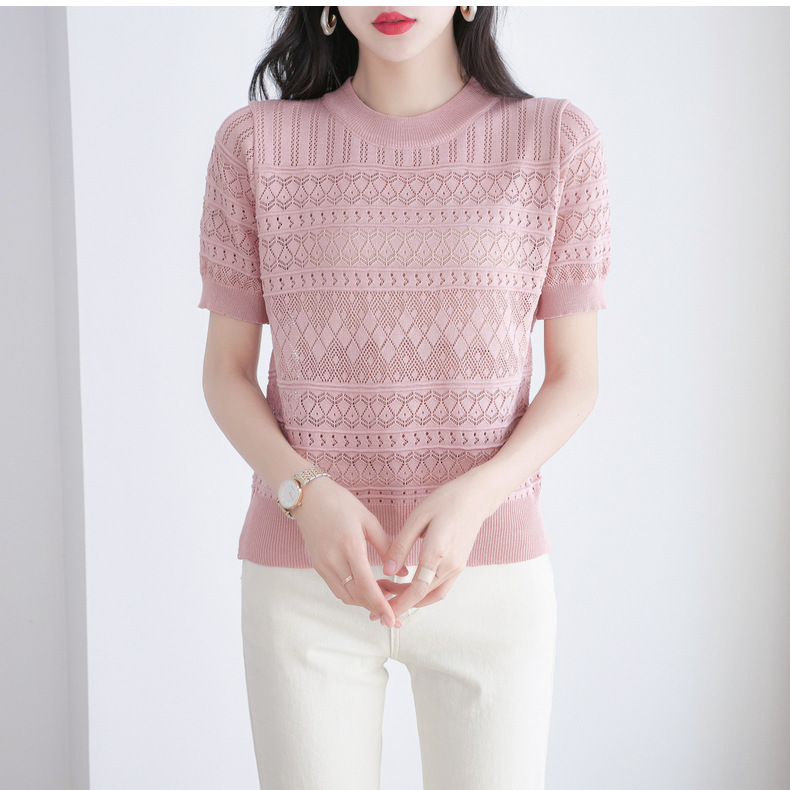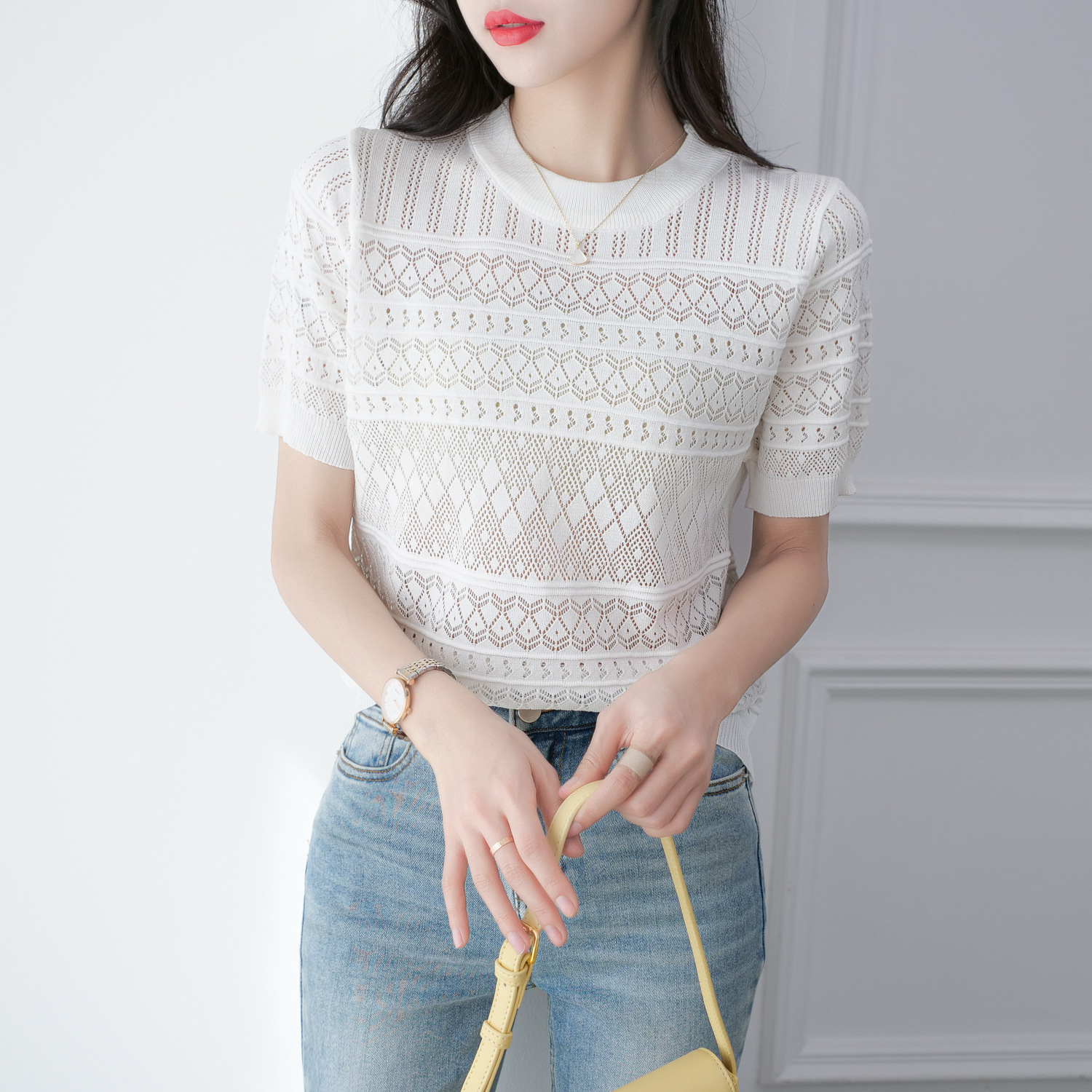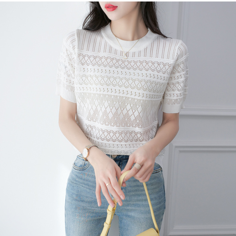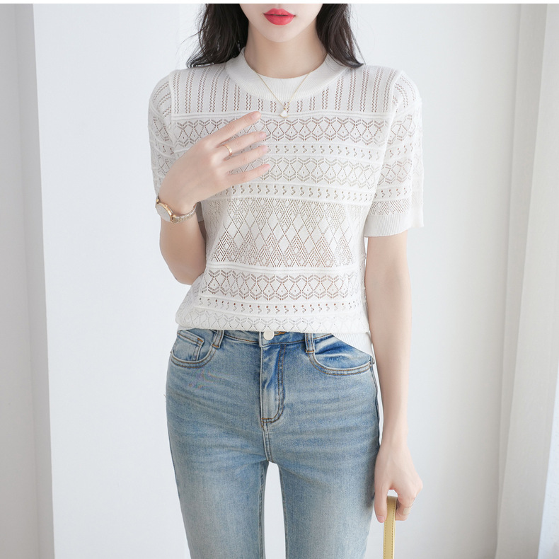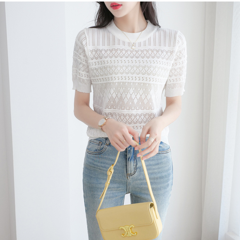 패셔너블한 투명 얇은 니트 여성용 2025 여름 신상 여성복 우아한 반팔 상의 아이스 실크 루즈핏 블라우스스토어 가기