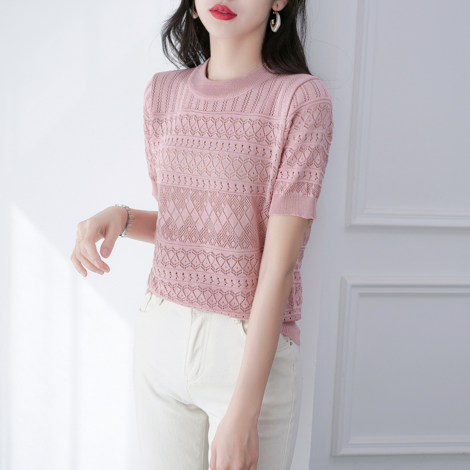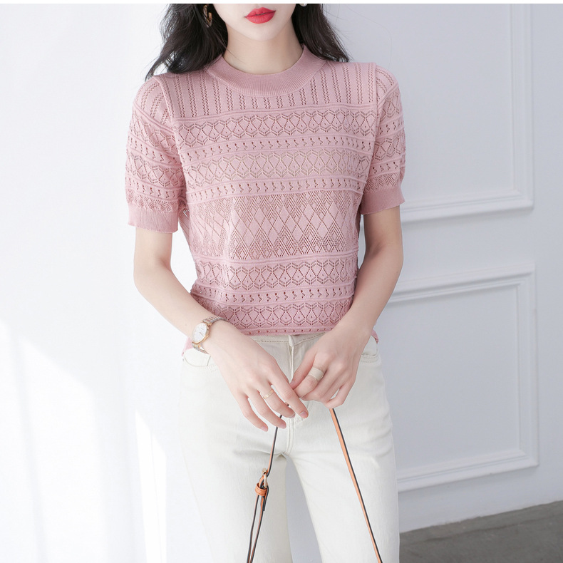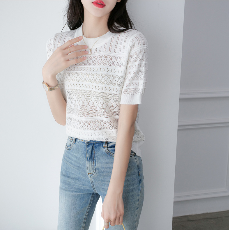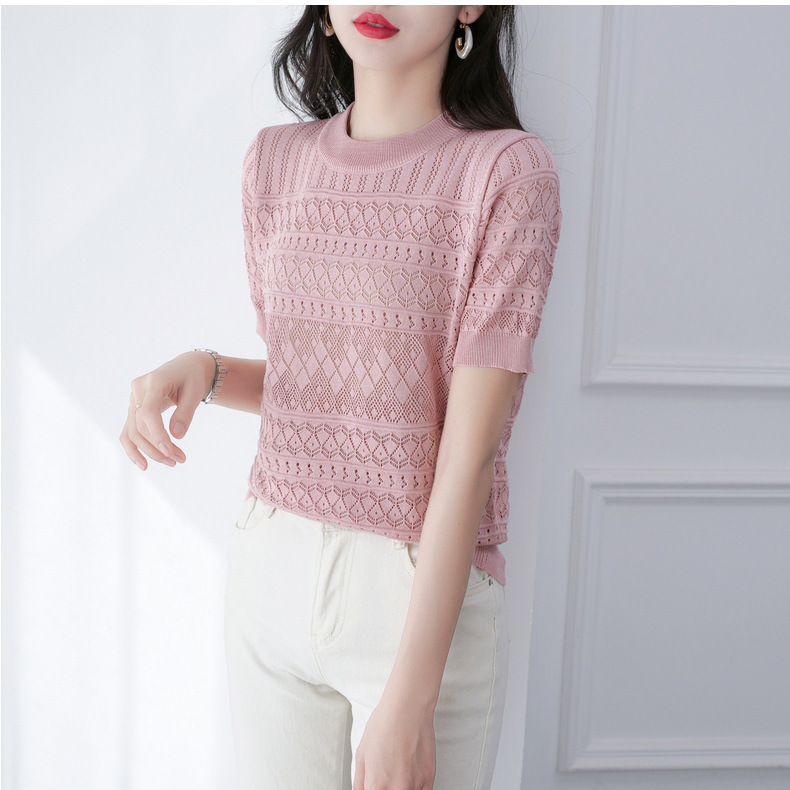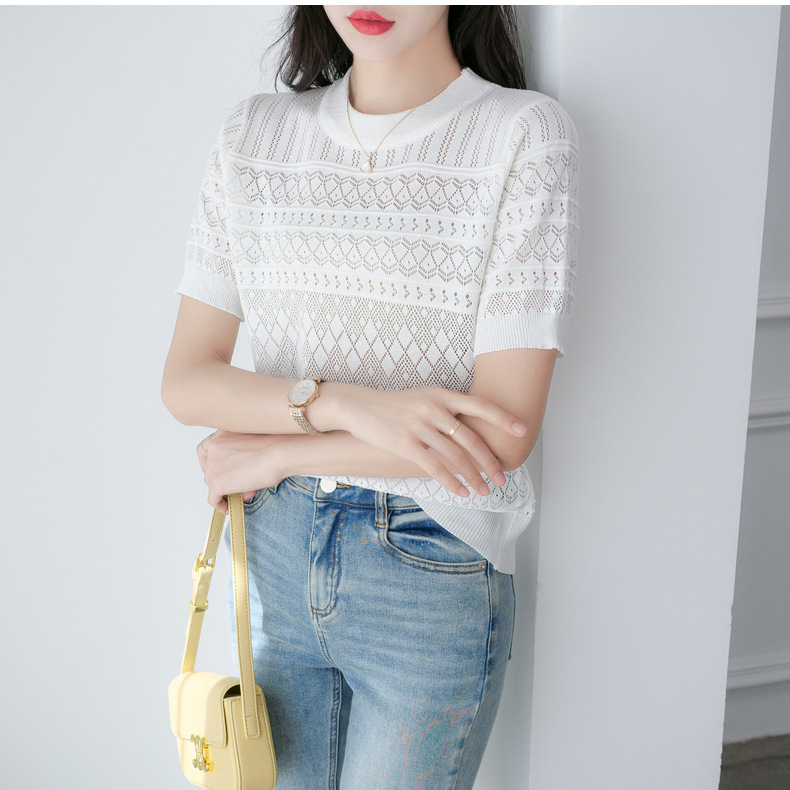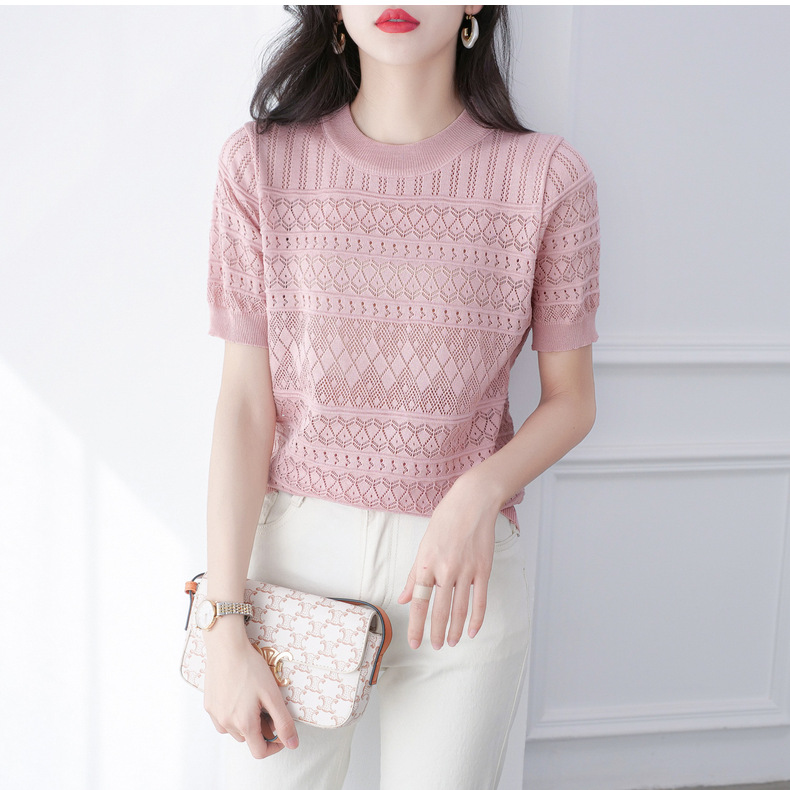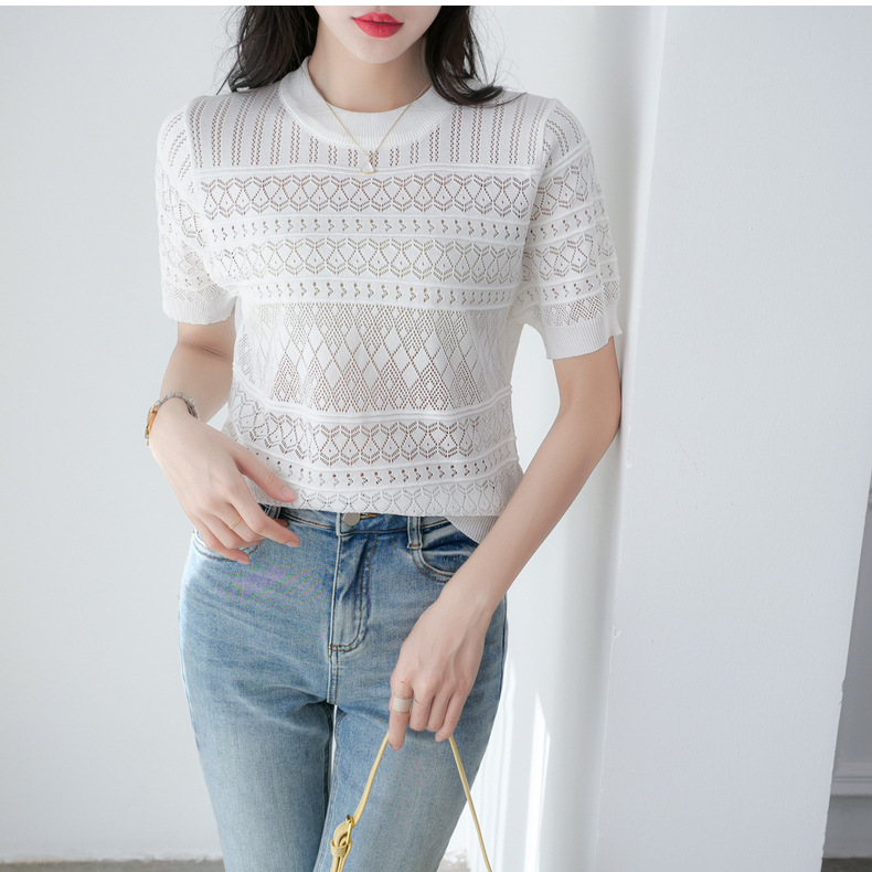 패셔너블한 투명 얇은 니트 여성용 2025 여름 신상 여성복 우아한 반팔 상의 아이스 실크 루즈핏 블라우스스토어 가기