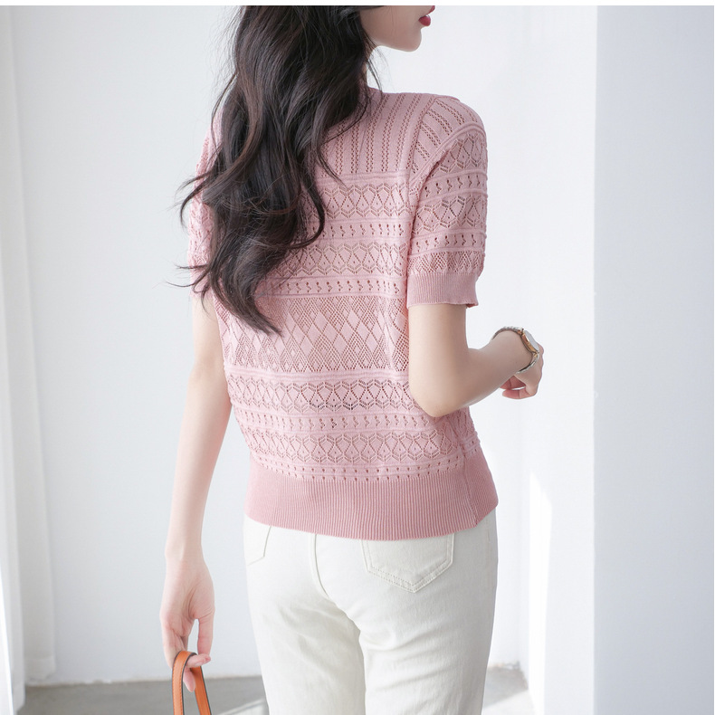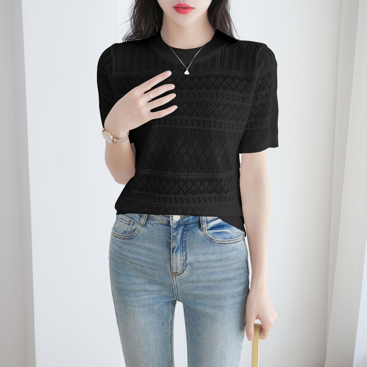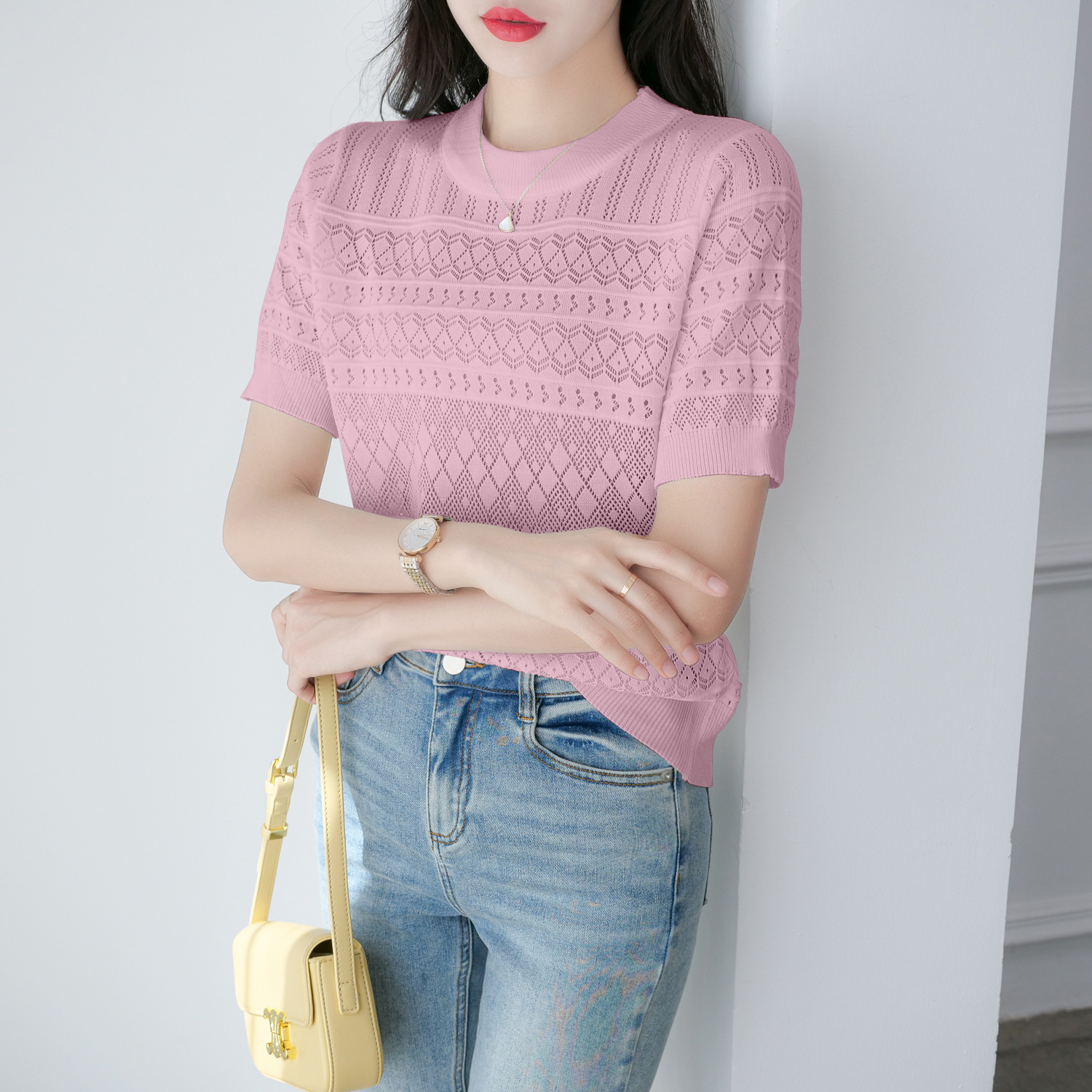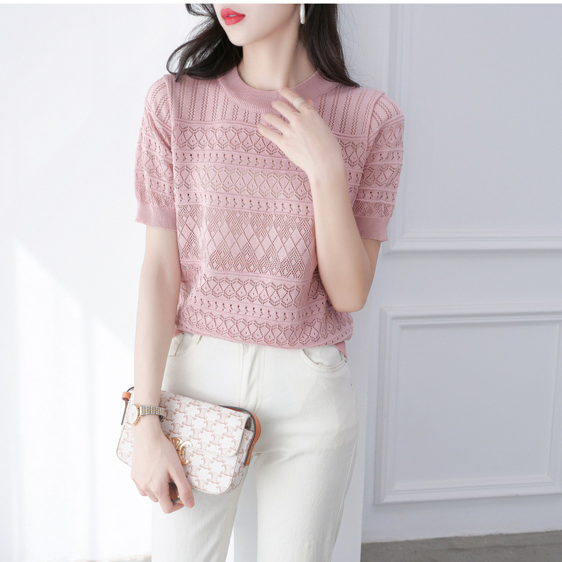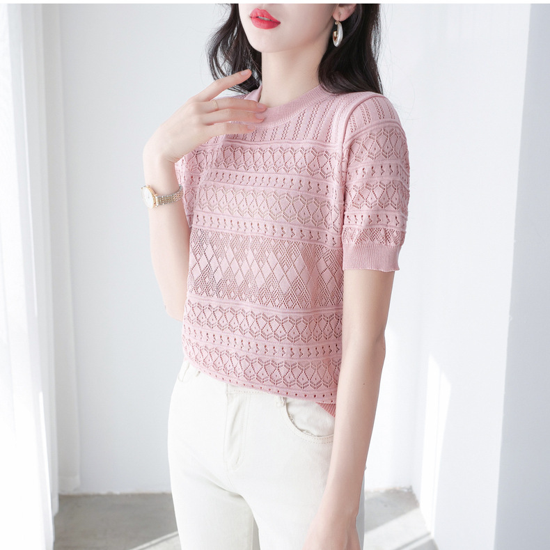 패셔너블한 투명 얇은 니트 여성용 2025 여름 신상 여성복 우아한 반팔 상의 아이스 실크 루즈핏 블라우스
