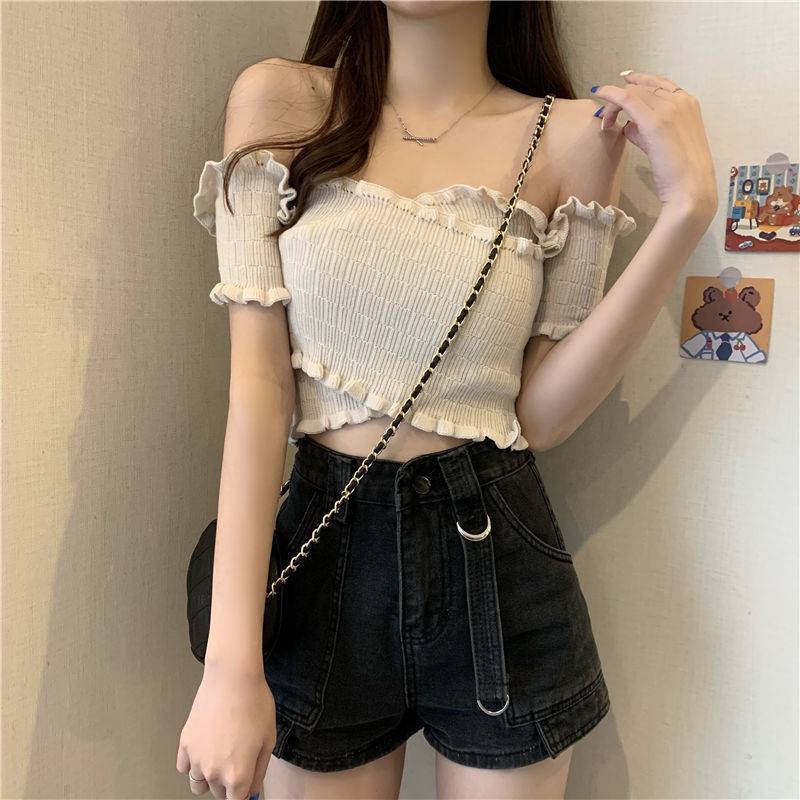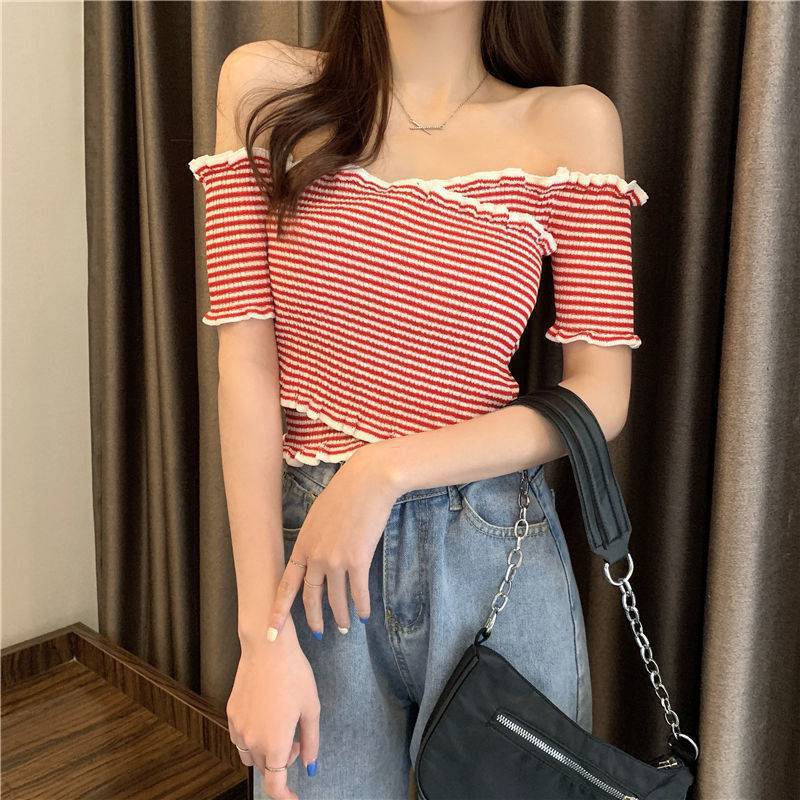 오프 숄더 크로스 디자인 얇은 나무 귀 섹시 핫 걸 오프 숄더 반팔 스웨터 여성 봄과 가을 여성 bm스토어 가기