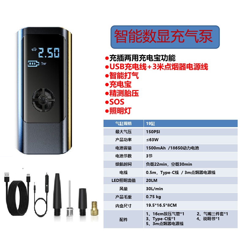 • 충전 및 연결용 듀얼 목적 디지털 디스플레이 모델 + 보조 배터리 + 3m 시가 라이터 케이블 + 리튬 배터리 3개(2000mAh*3셀))
