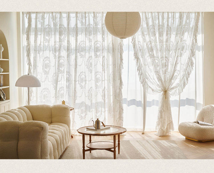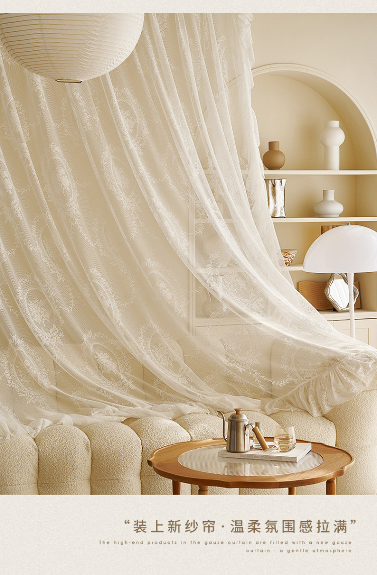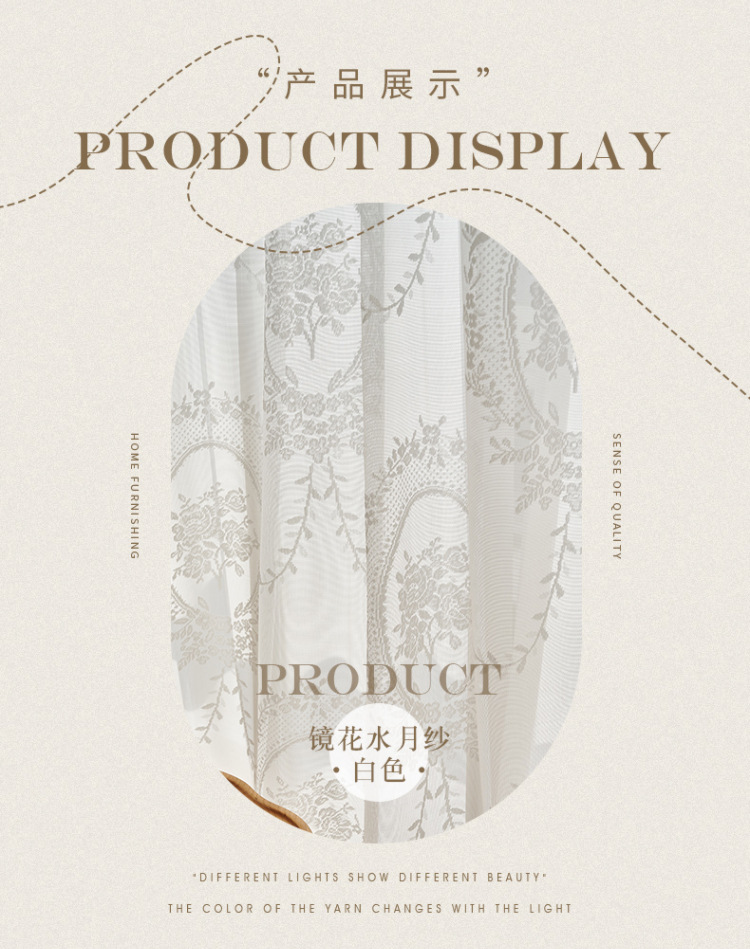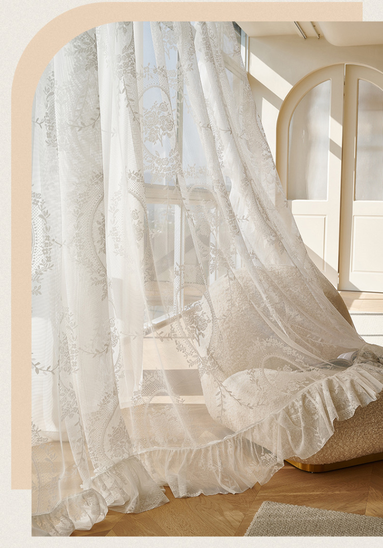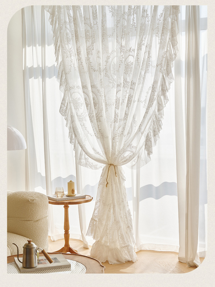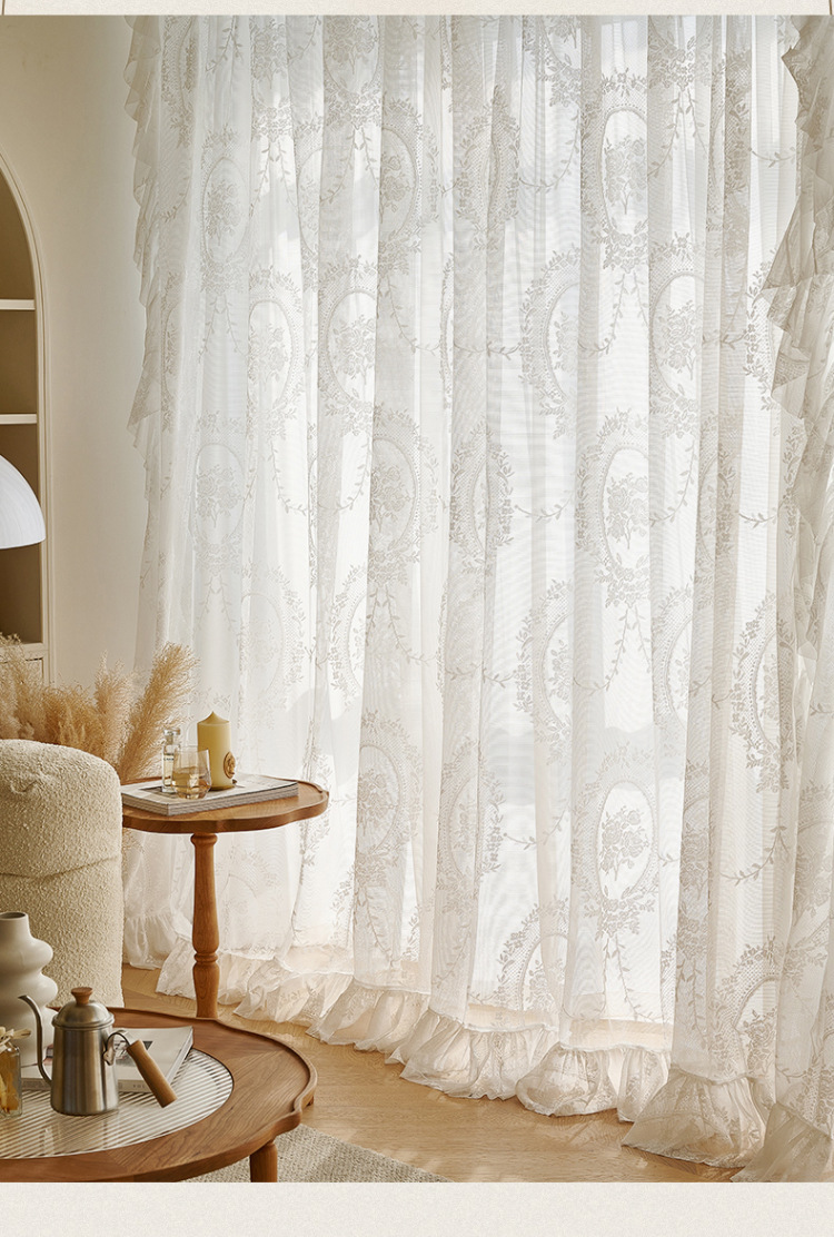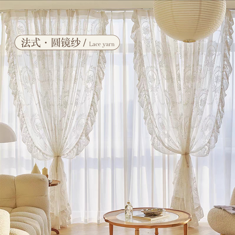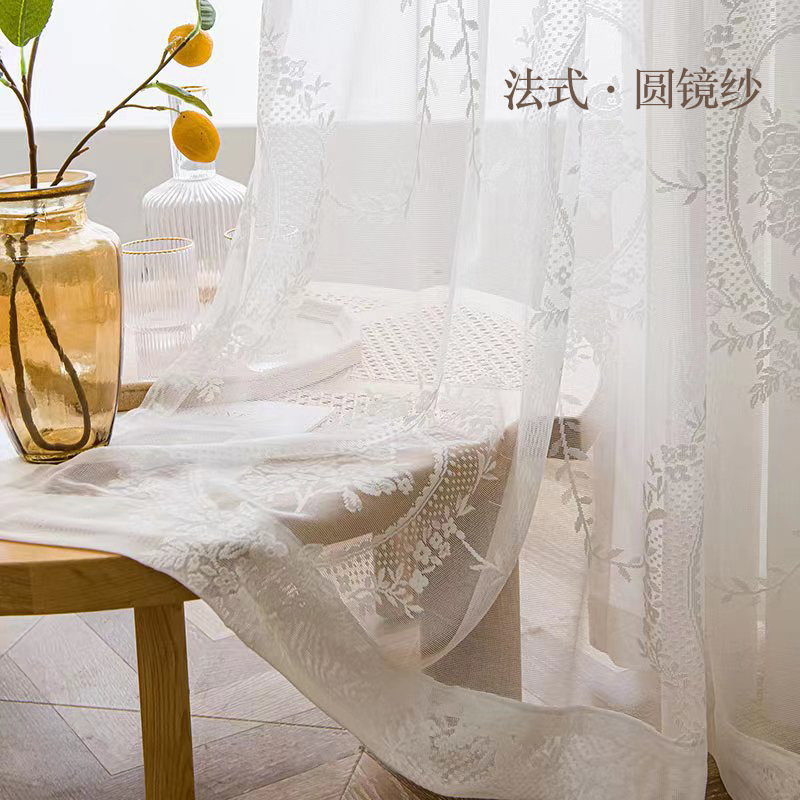 프랑스어 항목 럭셔리 빛 투명 원사 빈티지 소녀 로코코 라운드 미러 레이스 수 놓은 화이트 원사 베이 창 발코니 창 스크린