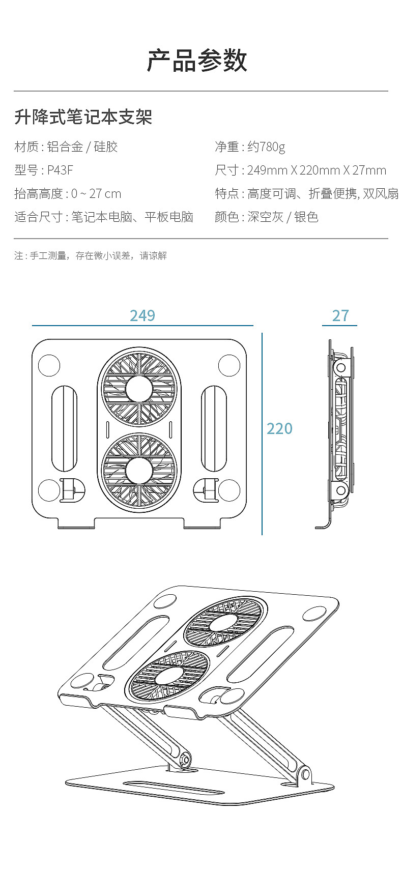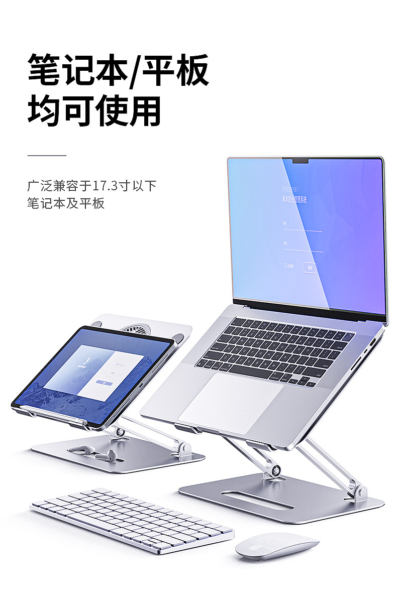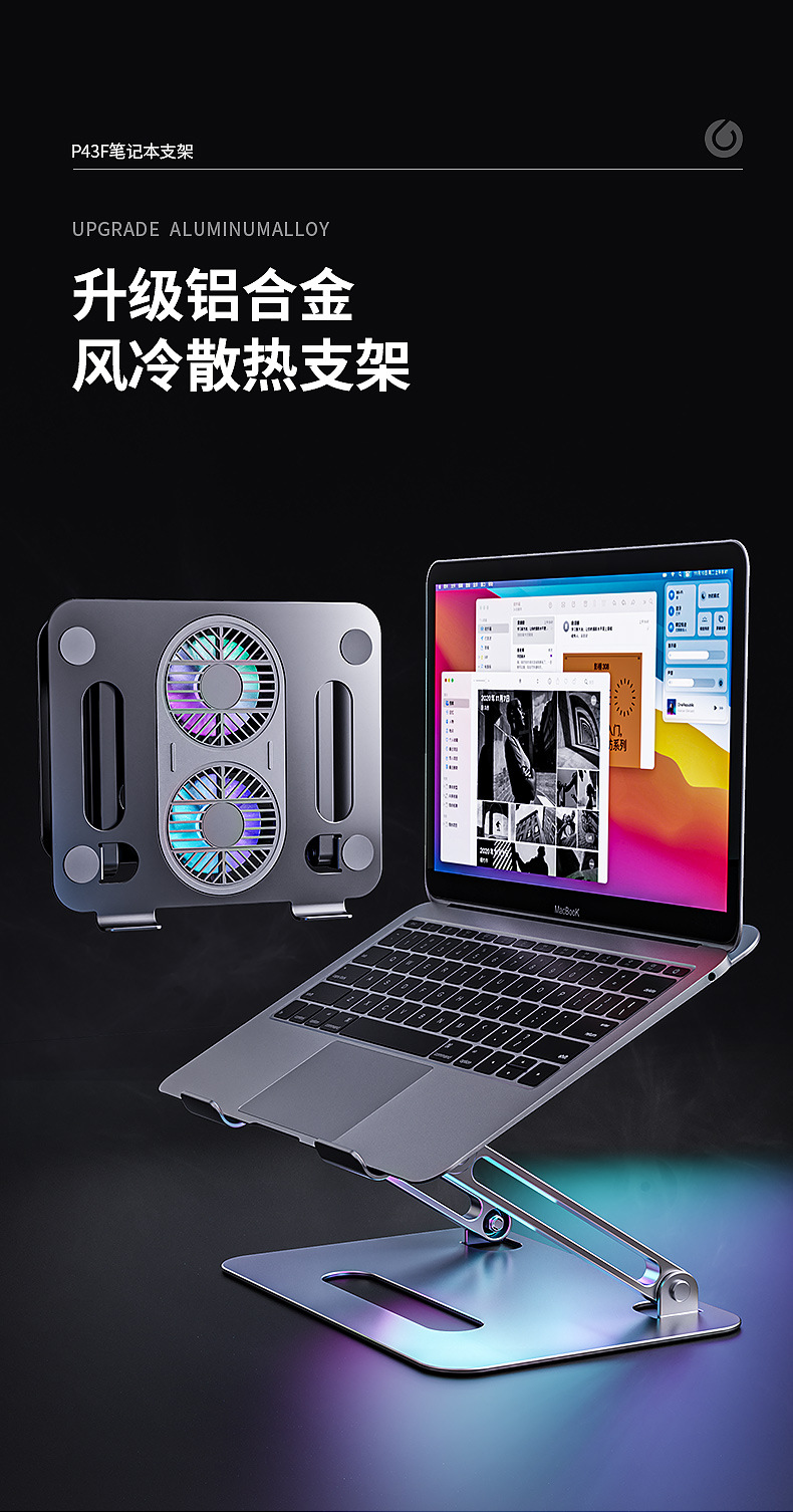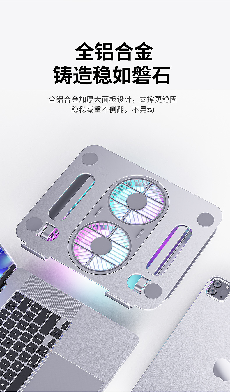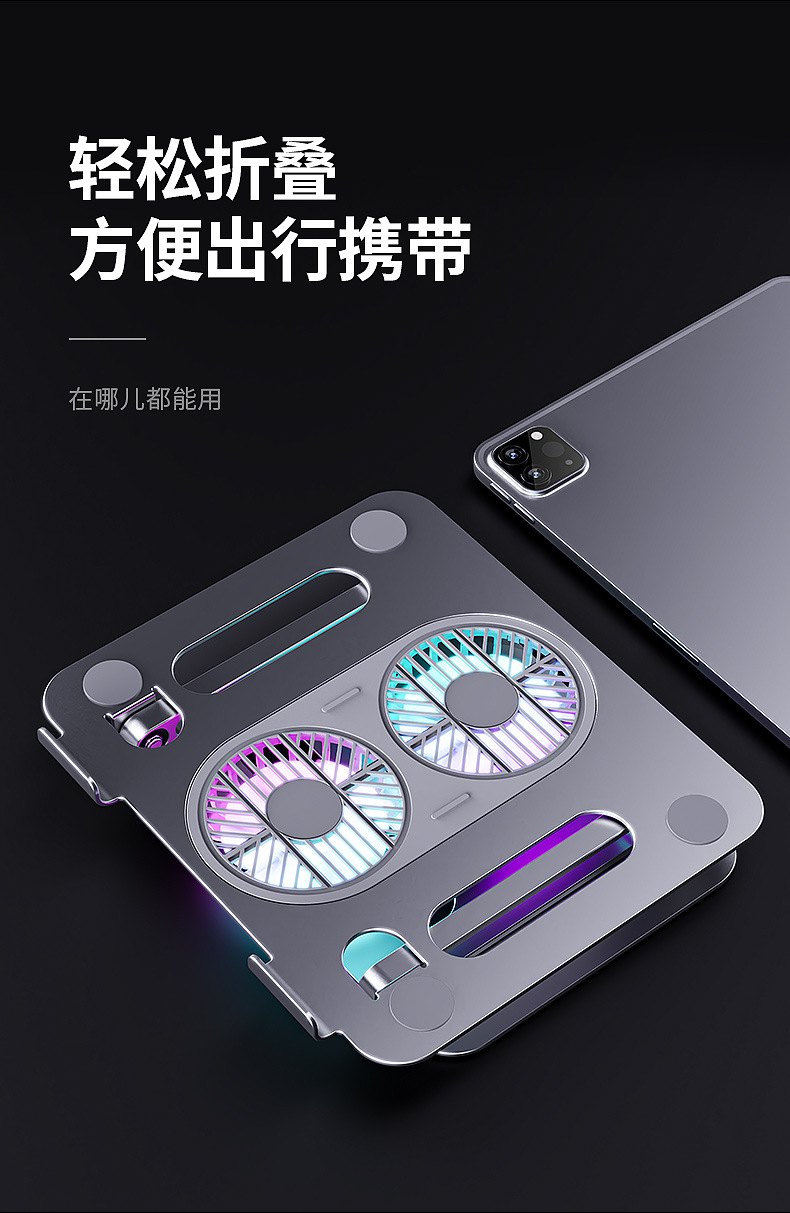 알루미늄 합금 접이식 이중층 노트북 거치대, 높이 조절 가능, 대형 팬으로 냉각, 태블릿 냉각 업그레이드