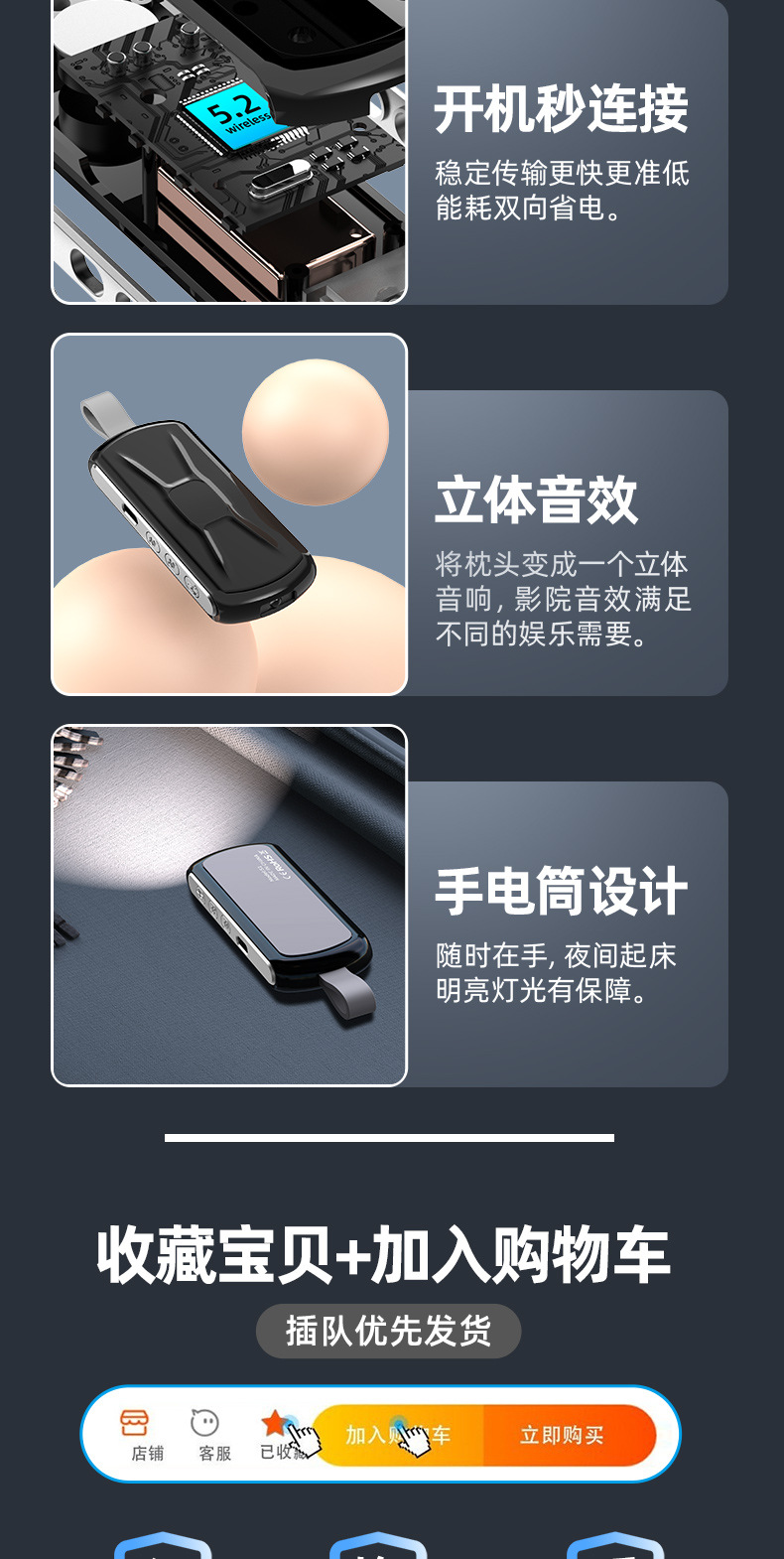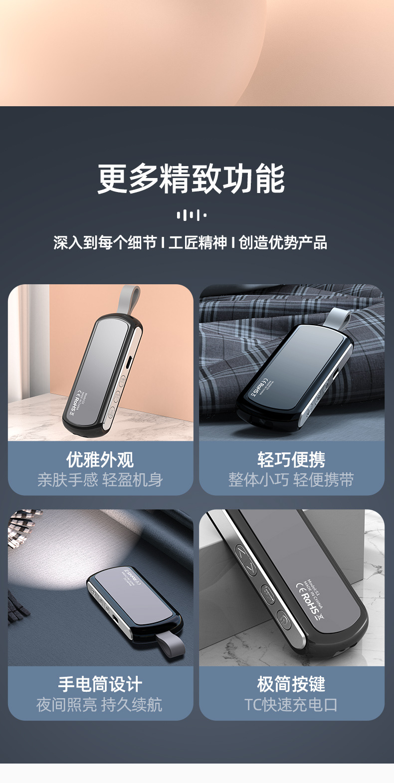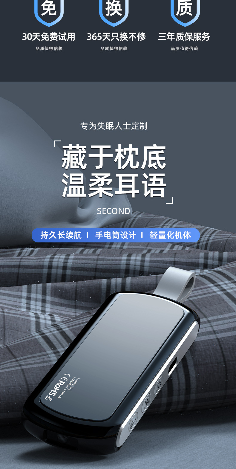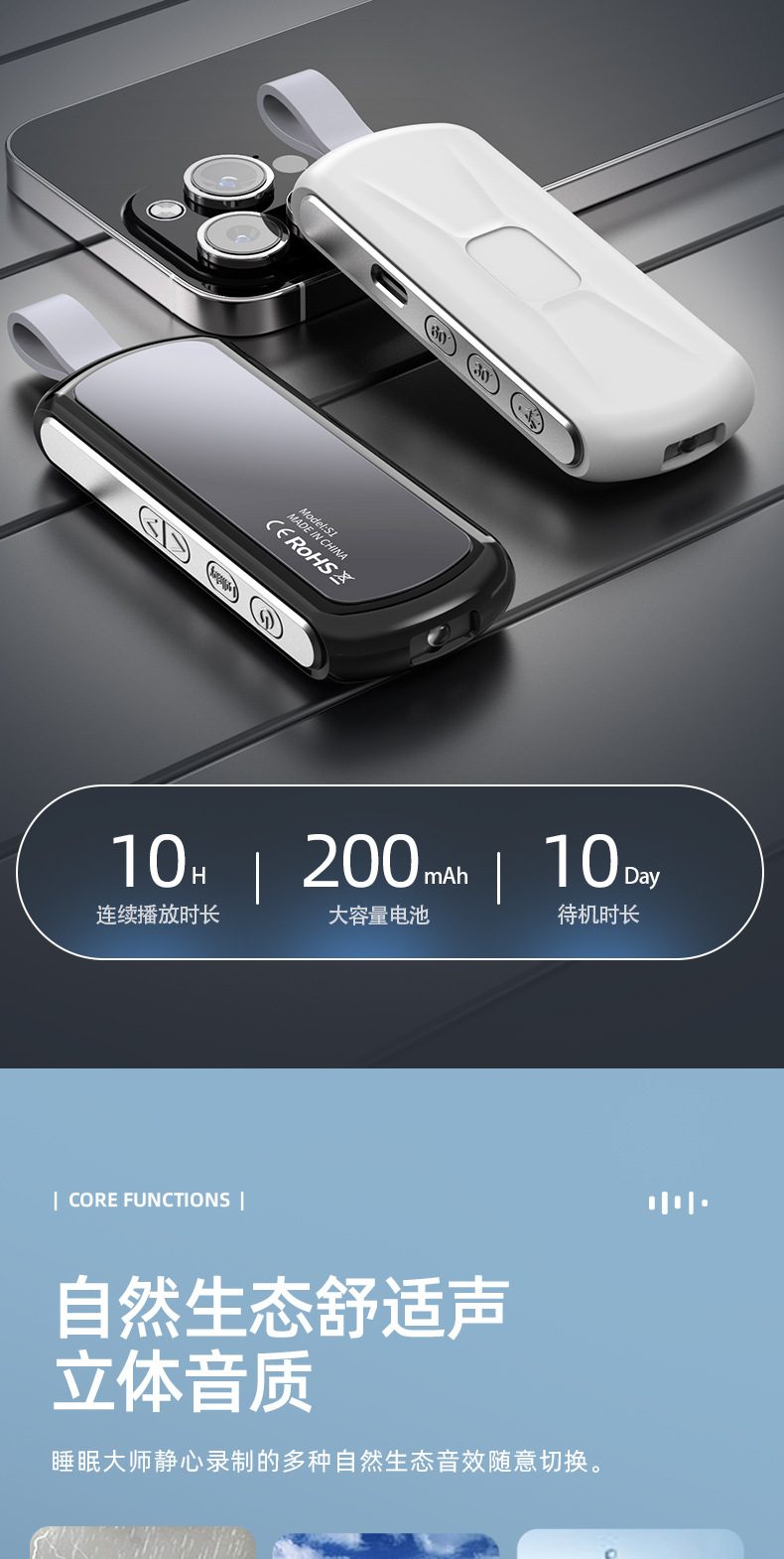 2.本睡眠音箱体积小,方便携带,适合出差住洒店,新环境失眠者使用,同时搭载高亮度小电筒,方便夜间照明。
