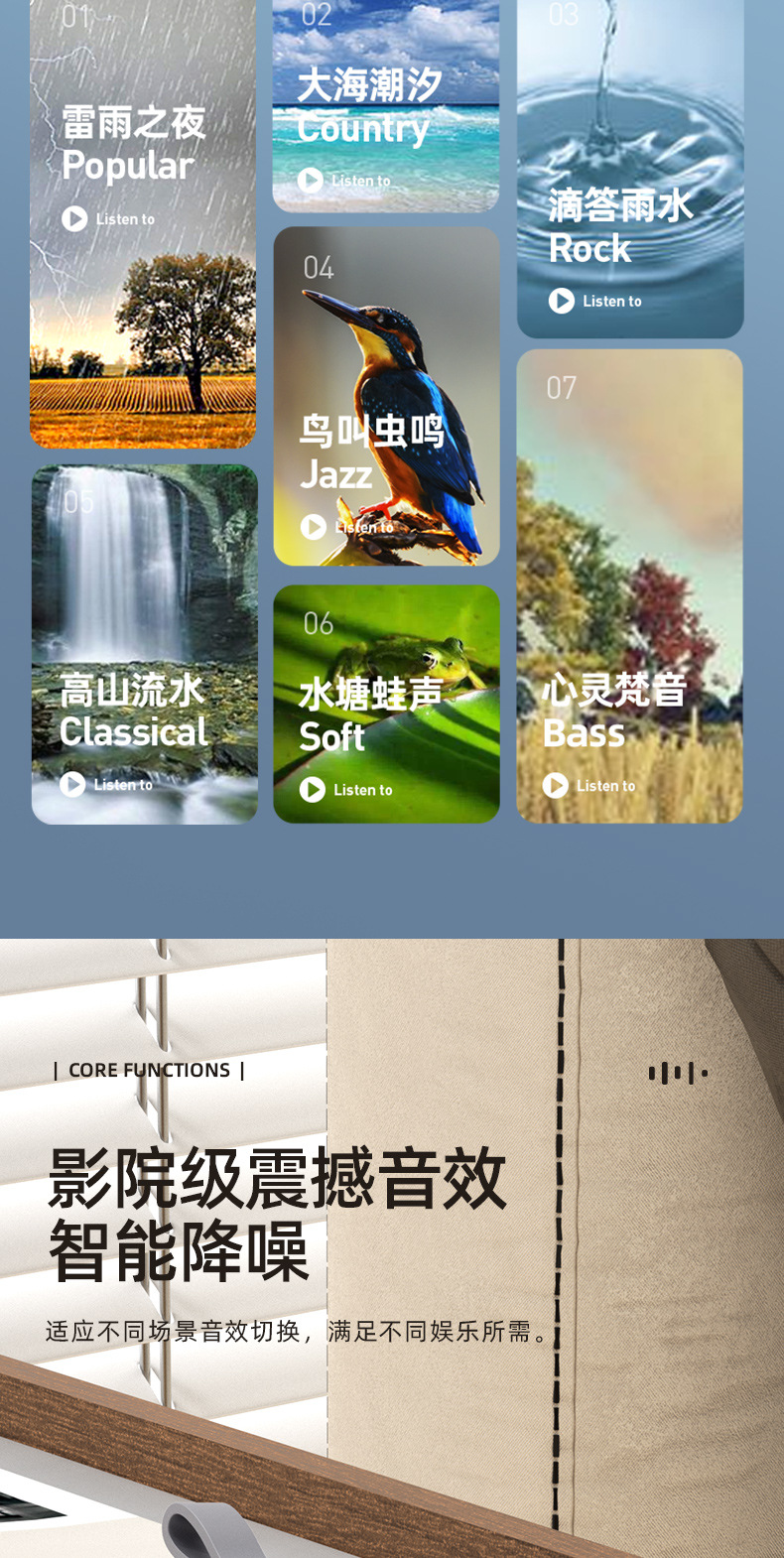 1.本睡眠音响采用大自然中轻松休闲的声音,内置8种音效,使人头脑放松,起到改善睡眠的作用。