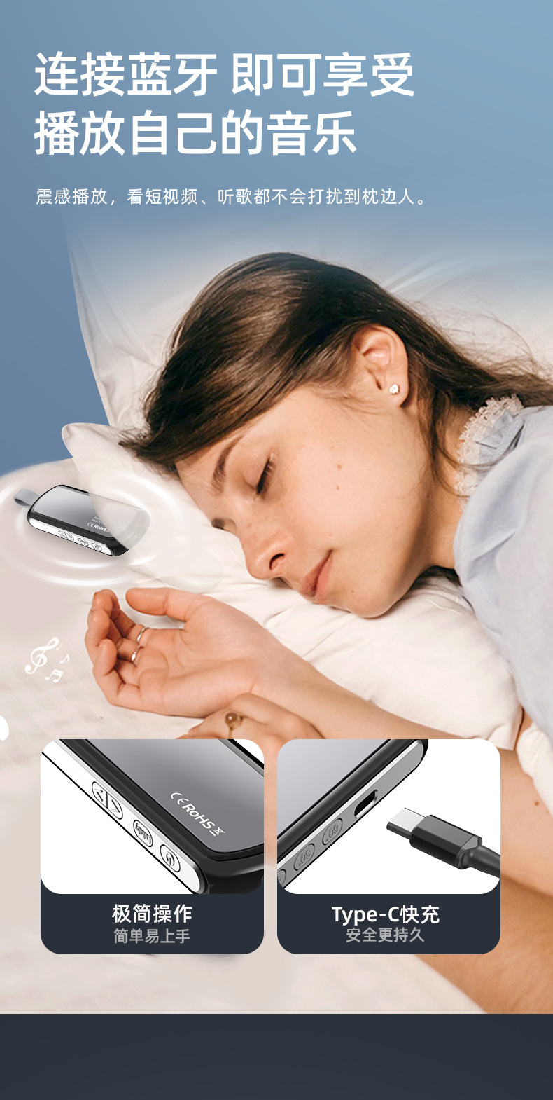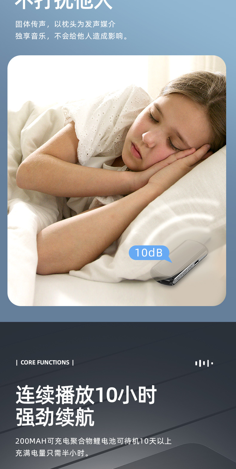 3.本睡眠仪使用方法,是把音箱放在枕头底下,即可无干扰聆听音乐,不影响他人。也可放置于床头边,听起来更舒服!