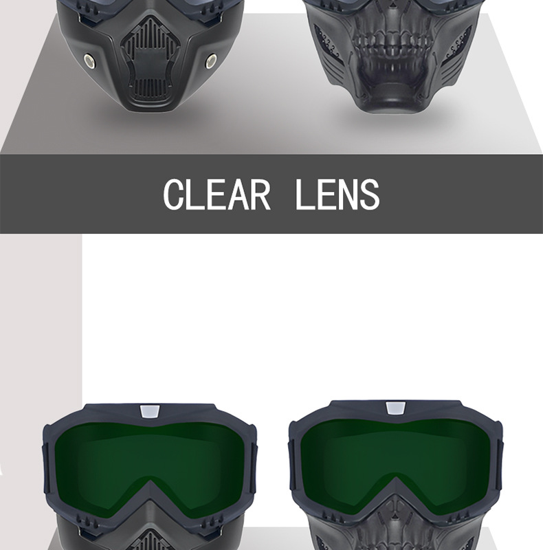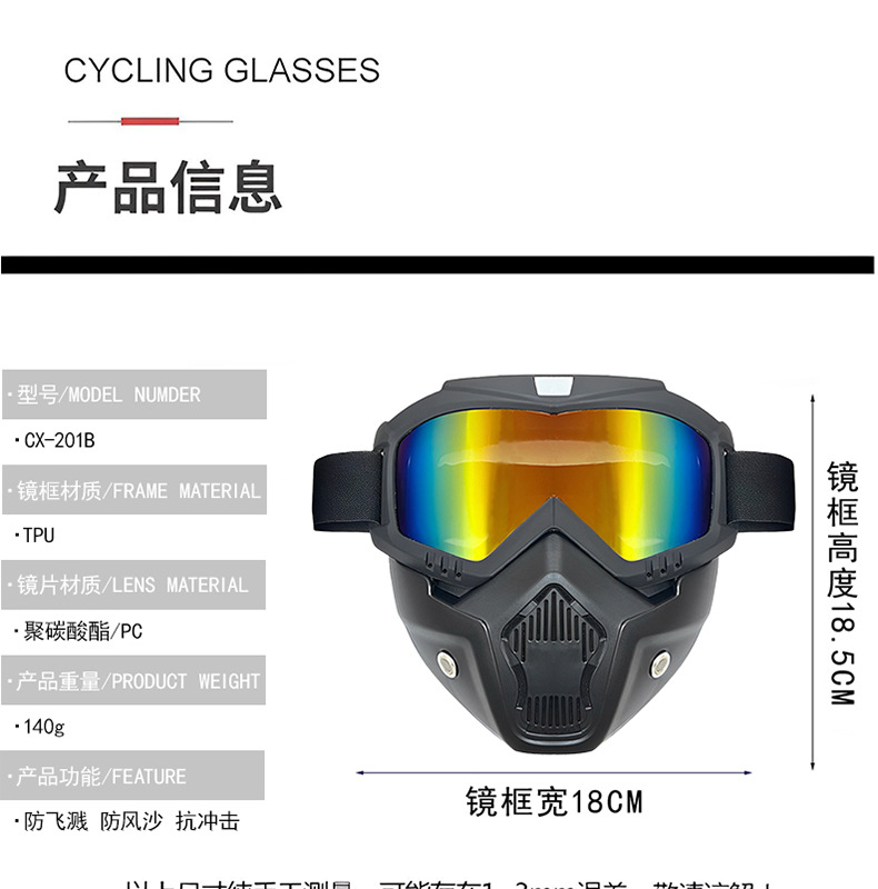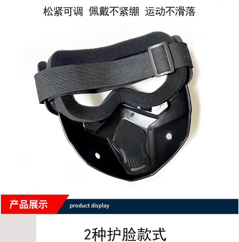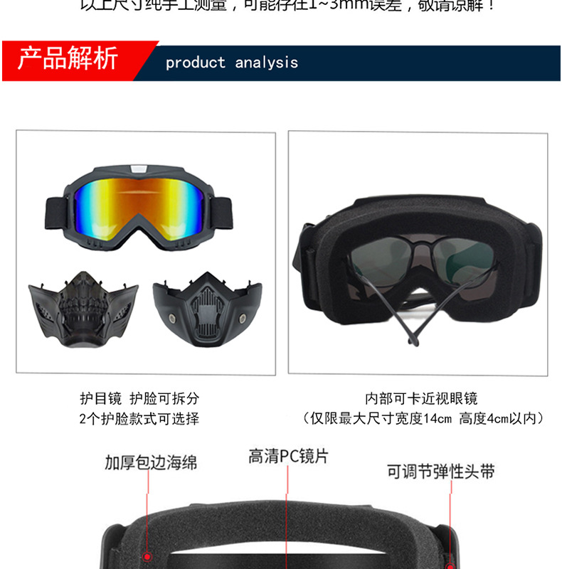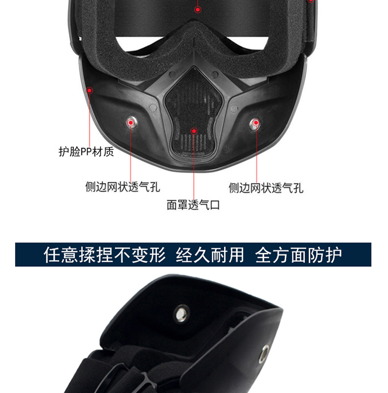 高清大视野镜片,镜框内部可卡近视眼镜;护目镜面罩分体设计可拆卸;可适应越野摩托,公路骑行,真人CS等场景;防风/防尘/抗冲击 ;内衬柔软海绵透气舒适;
