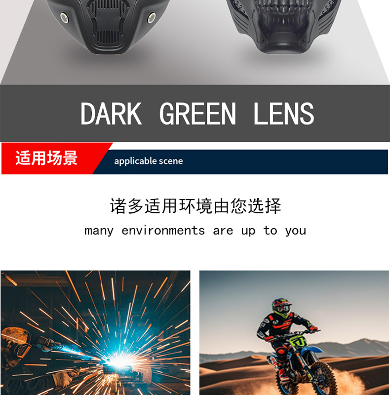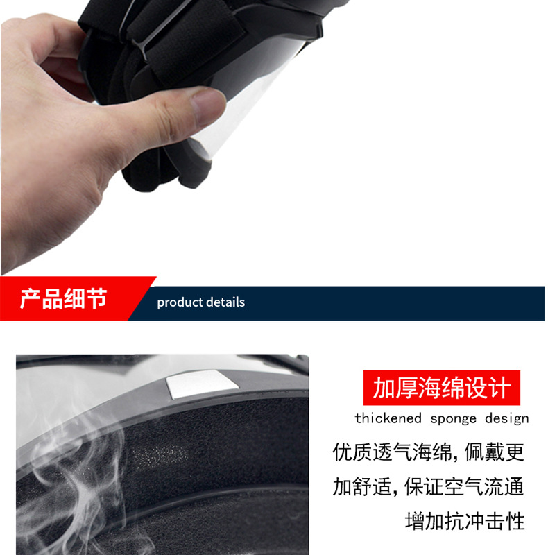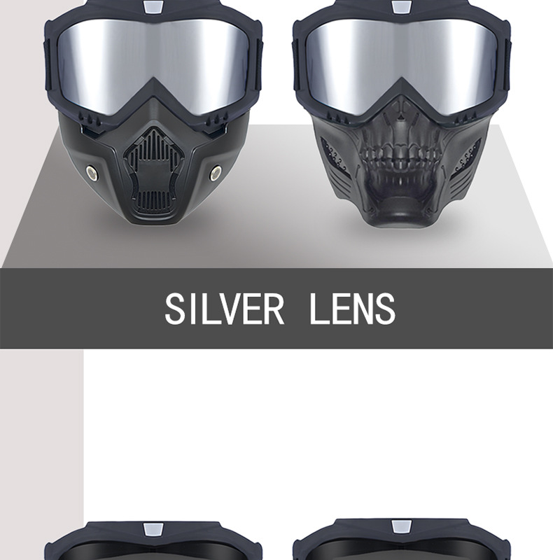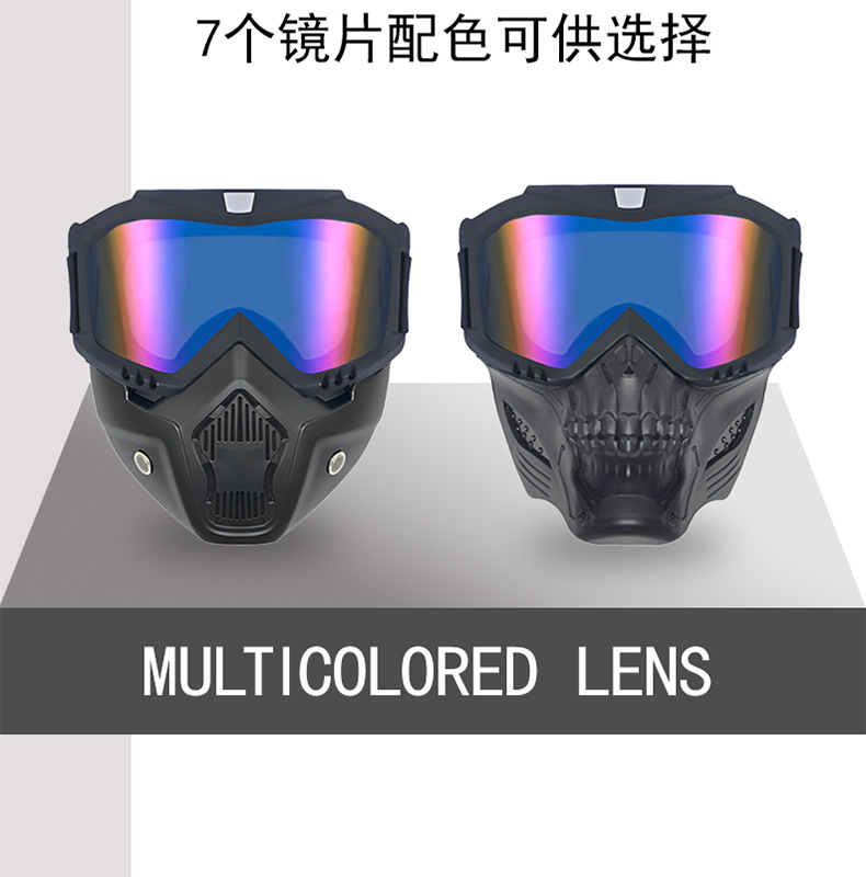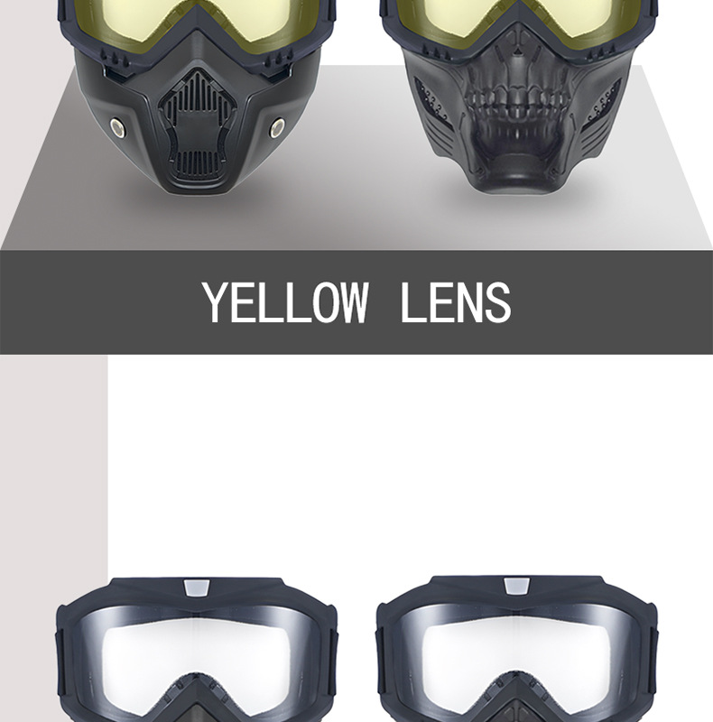 高清大视野镜片,镜框内部可卡近视眼镜;护目镜面罩分体设计可拆卸;可适应越野摩托,公路骑行,真人CS等场景;防风/防尘/抗冲击 ;内衬柔软海绵透气舒适;