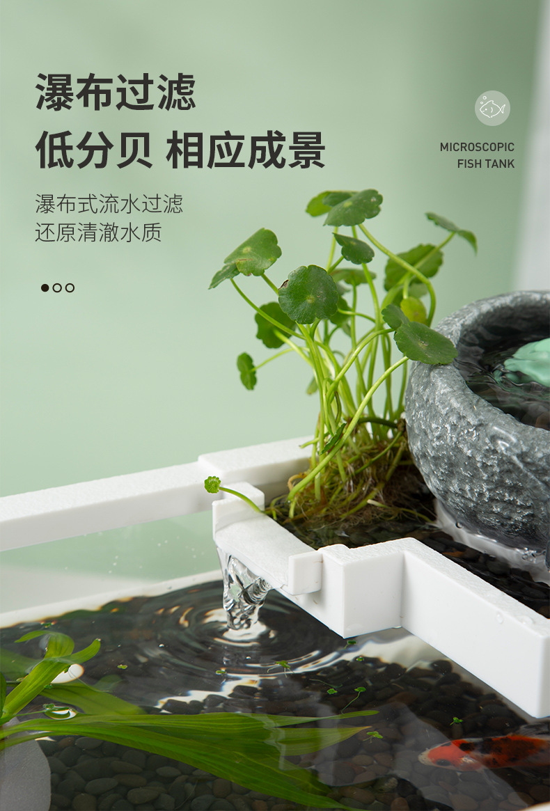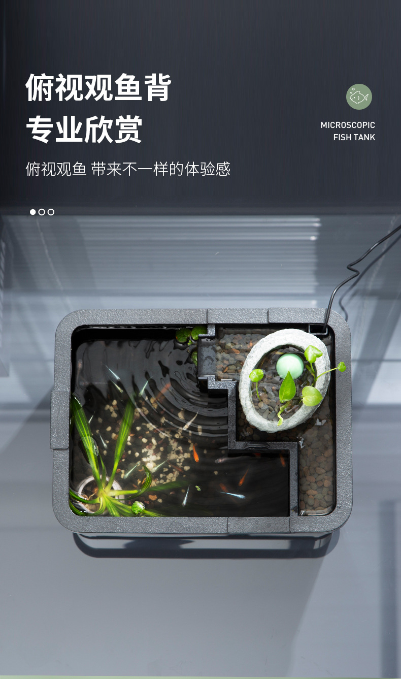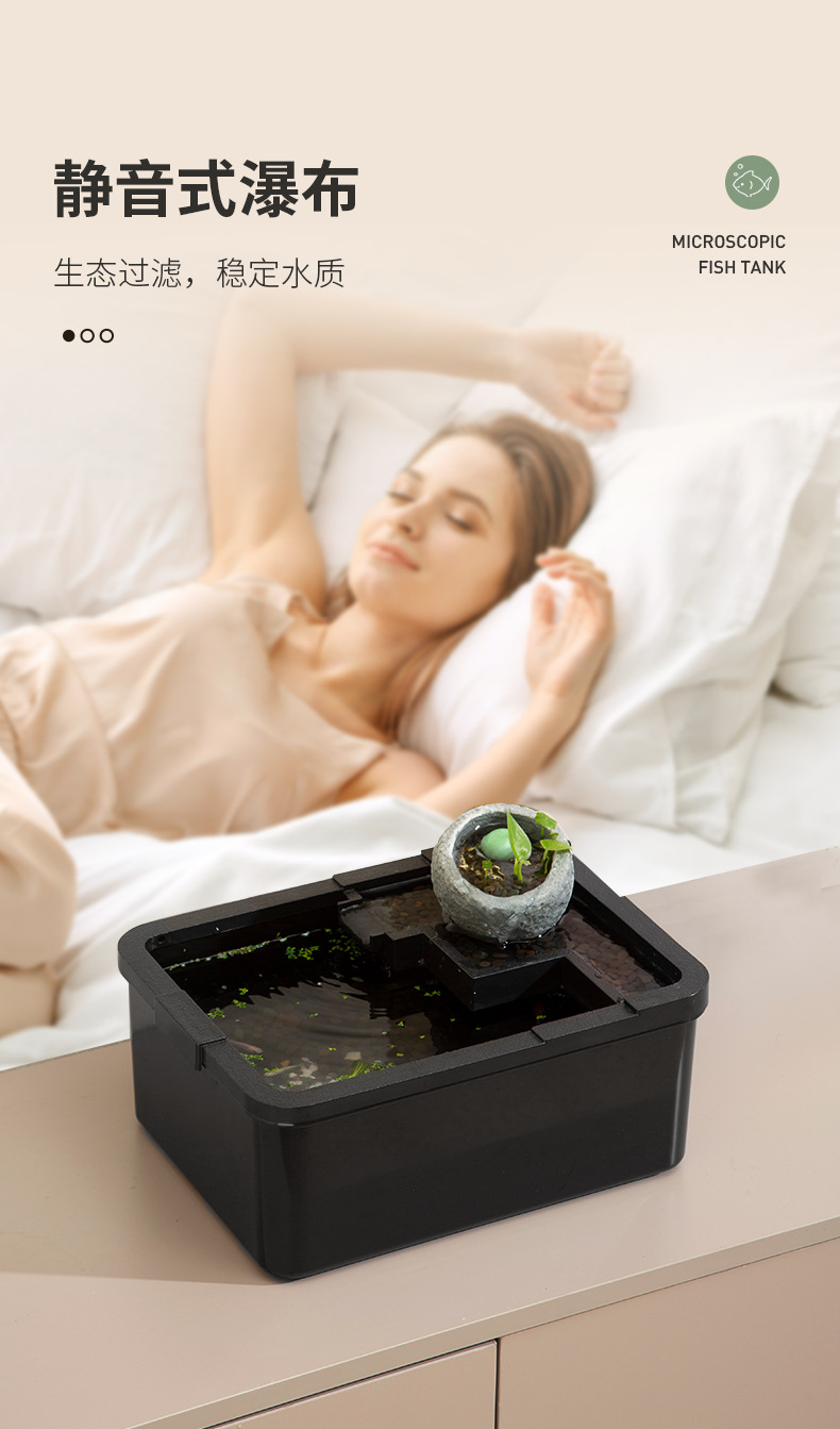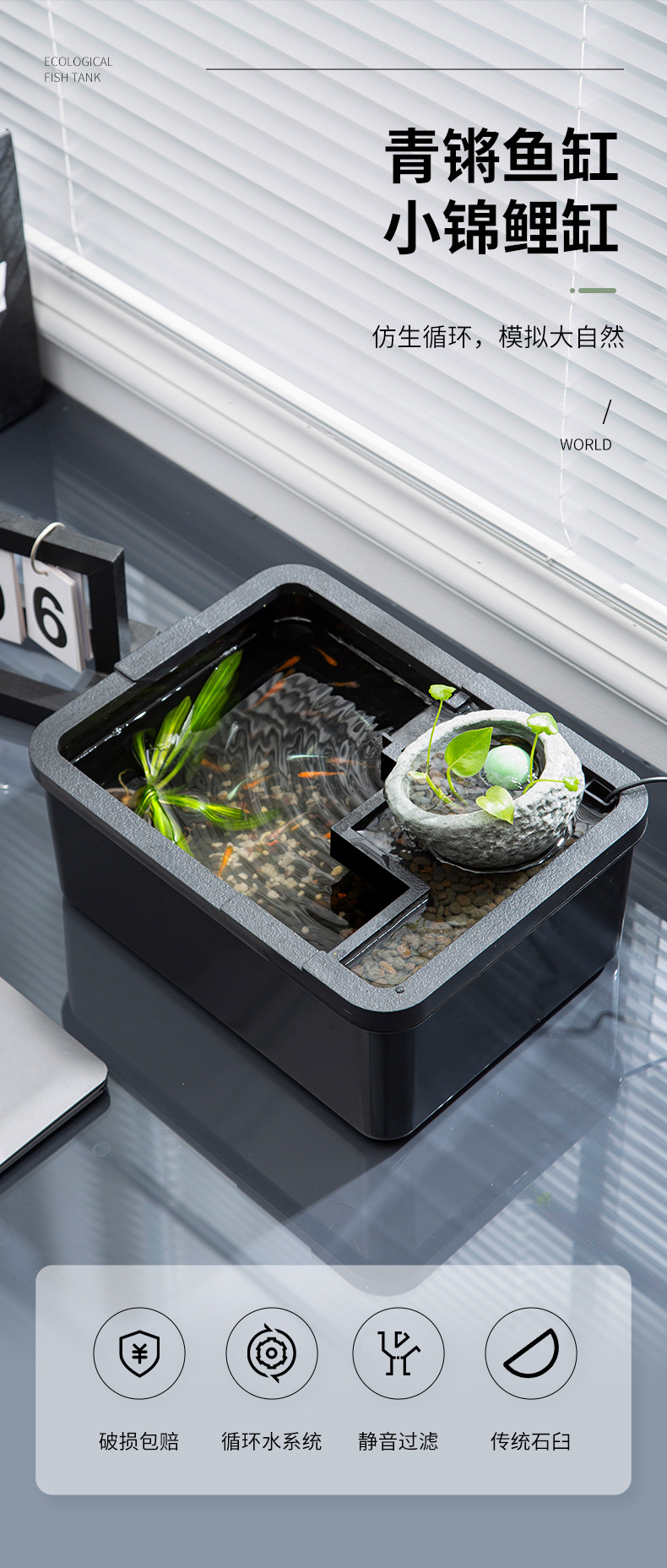 소형 데스크탑 풍경 배경에 있는 메스티스 물고기 수조, 생태학적 여과 장치, 작은 거북이, 금붕어, 흑색 수조, 고대 방식의 물고기 수조스토어 가기