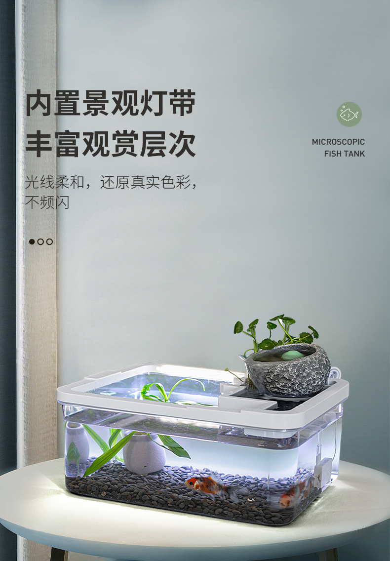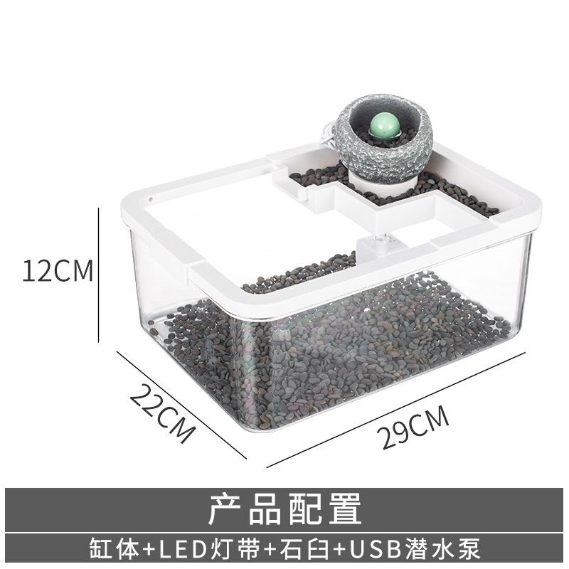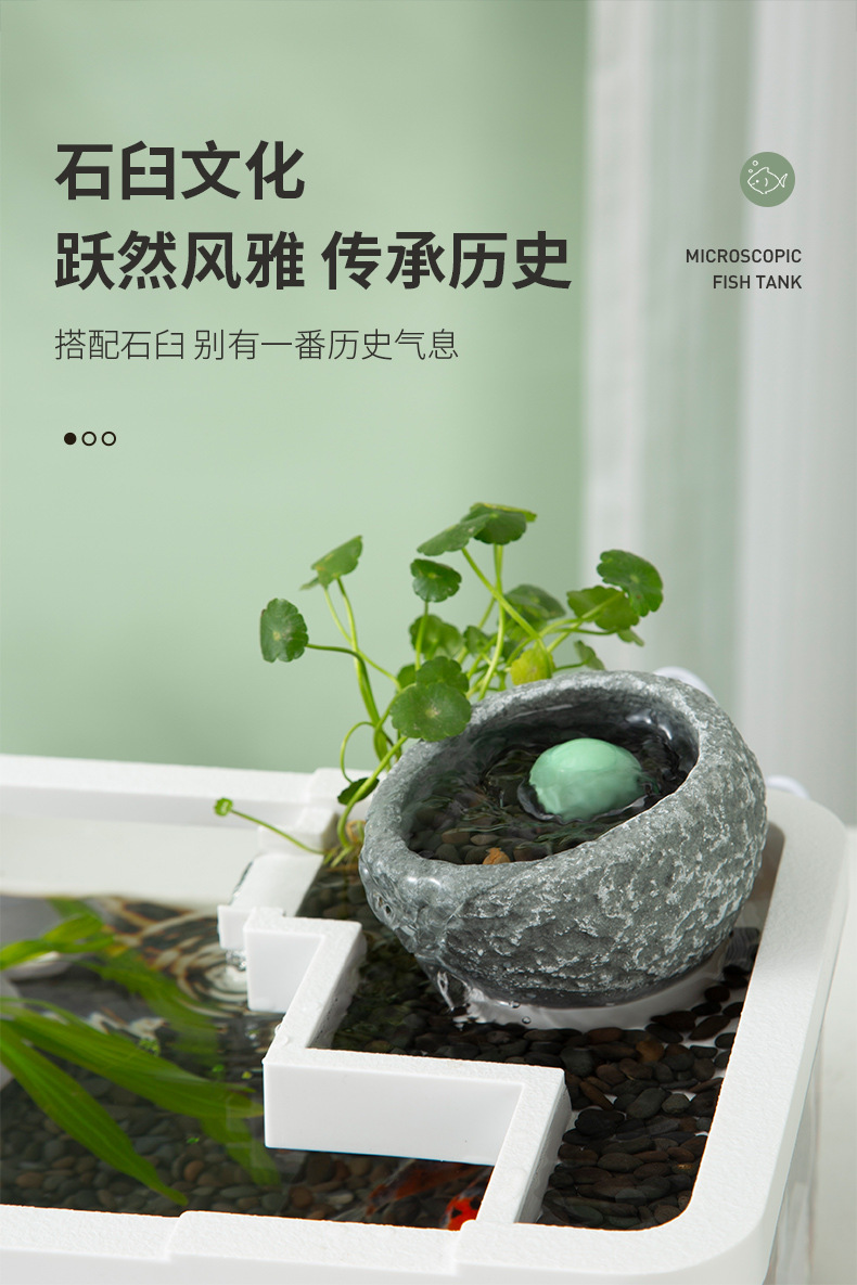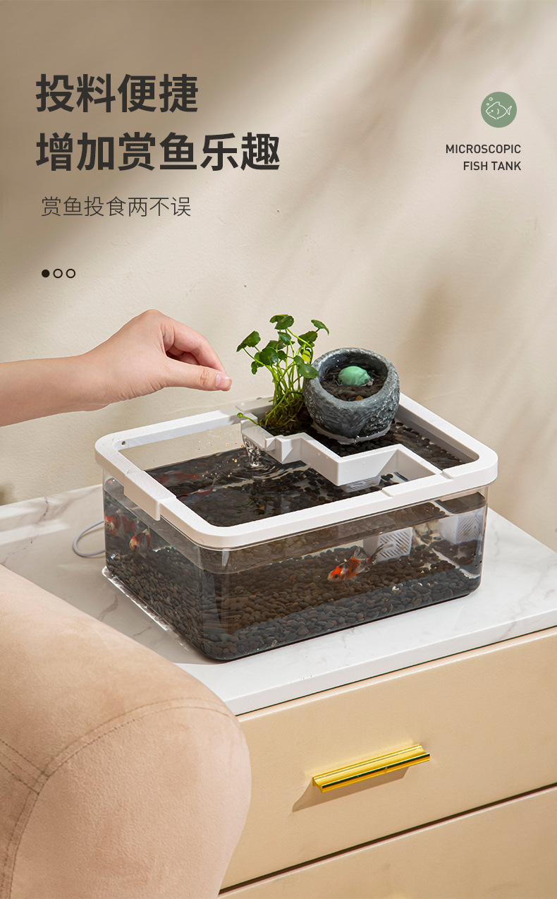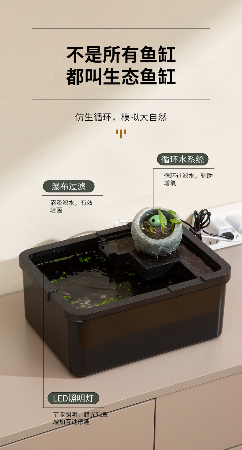 소형 데스크탑 풍경 배경에 있는 메스티스 물고기 수조, 생태학적 여과 장치, 작은 거북이, 금붕어, 흑색 수조, 고대 방식의 물고기 수조스토어 가기