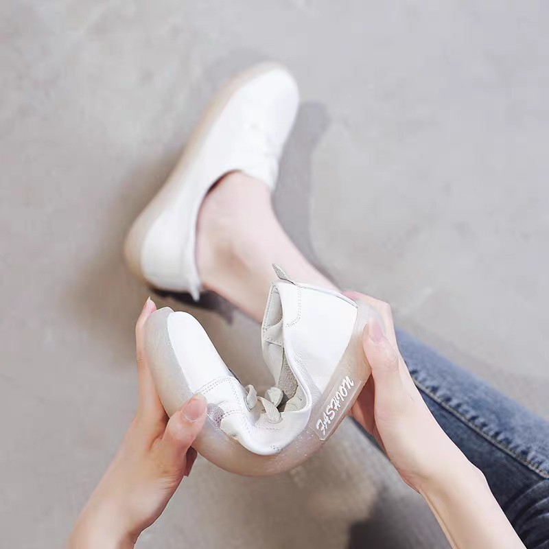 여성을위한 정품 가죽 흰색 신발 2025 새로운 스타일 소근육 부드러운 밑창 얕은 구두 플랫 바닥 임산부 신발 피곤하지 않은 간호사 신발