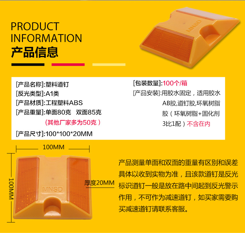 MNSD 플라스틱 도로 스터드 양면 반사 도로 스터드 노란색과 흰색 감속 도로 스터드 돌출 도로 표지판 보조 표지판