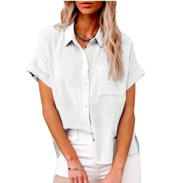 아마존 크로스 보더 새로운 유럽 및 미국 크로스 보더 여성용 단색 린넨 셔츠 반팔 캐주얼 루즈한 셔츠
