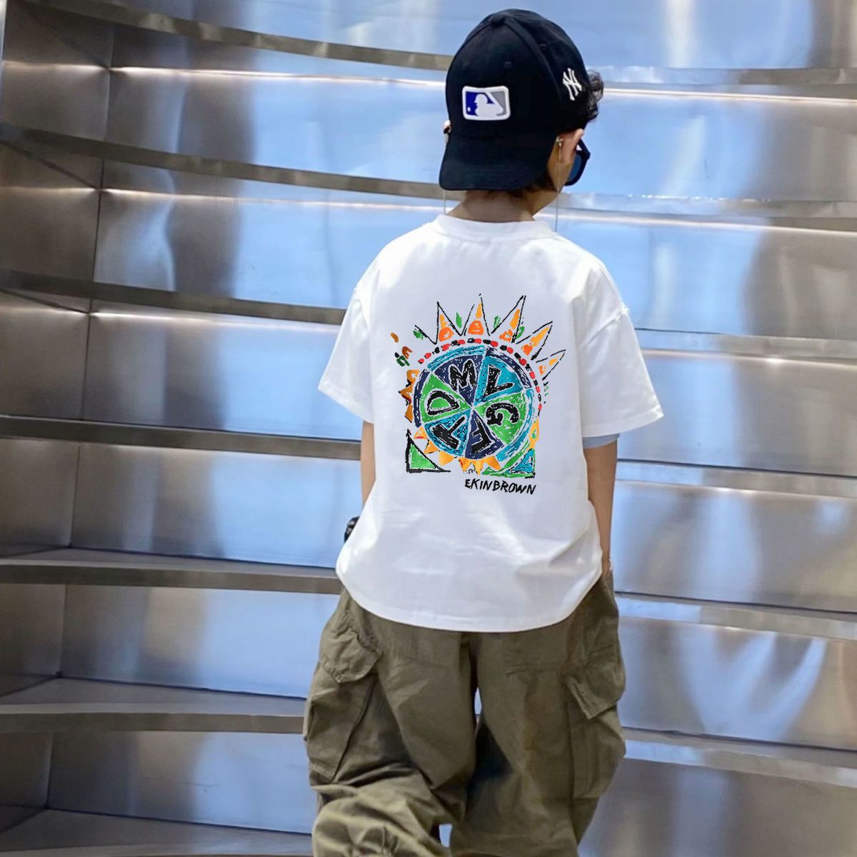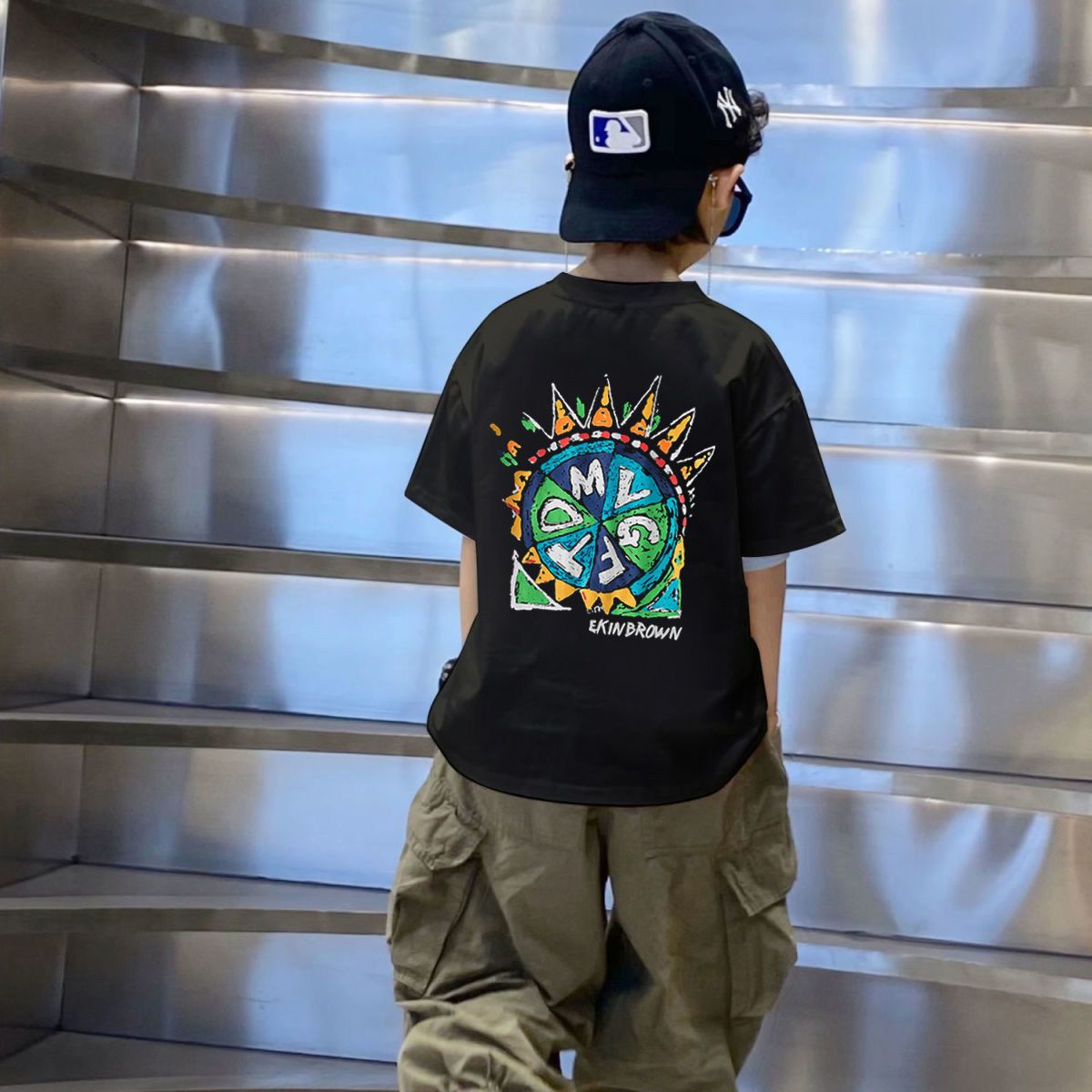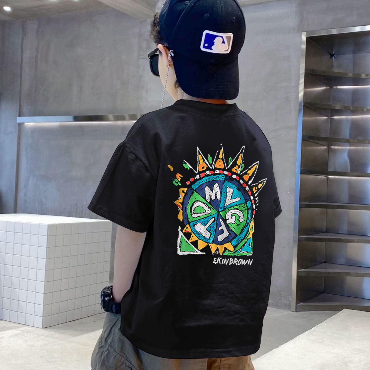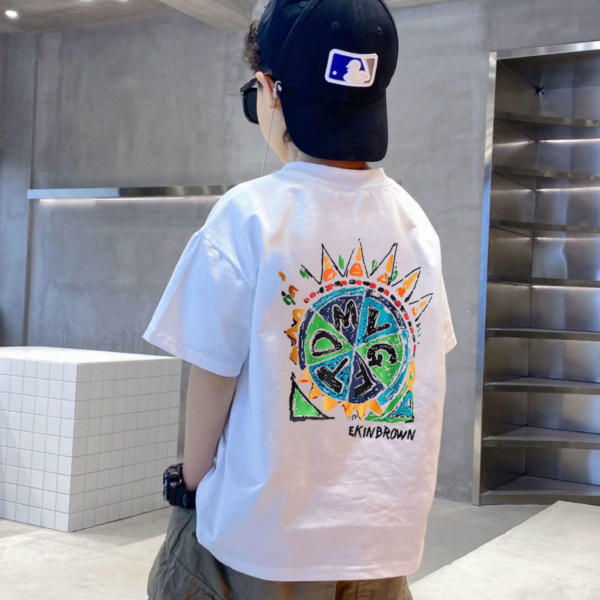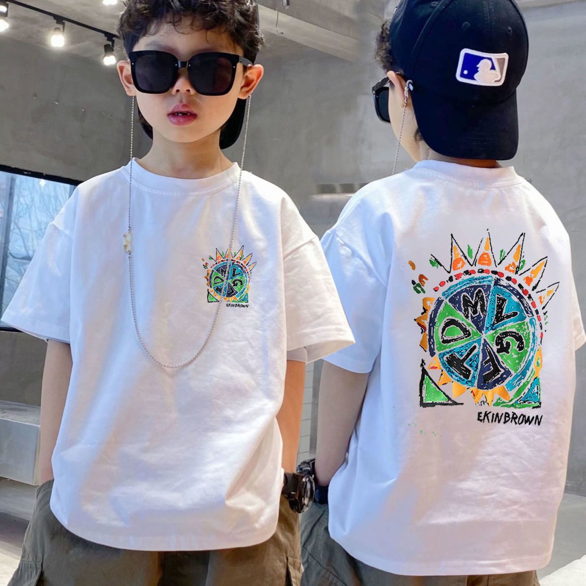 100 면 남아 반팔 티셔츠 2023 여름 새로운 어린이 한국 느슨한 잘 생긴 탑 큰 어린이 티셔츠스토어 가기